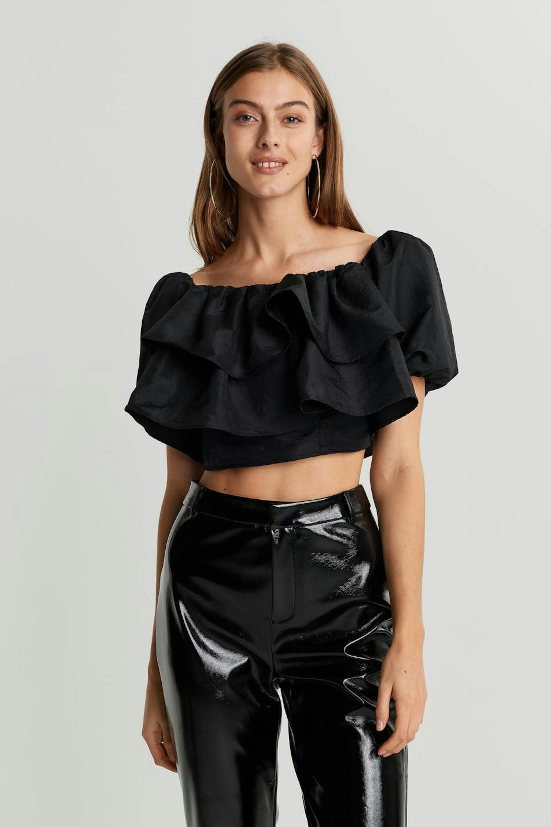 Kort topp med korte puffermer. Toppen er perfekt for festen og svart og har volanger.