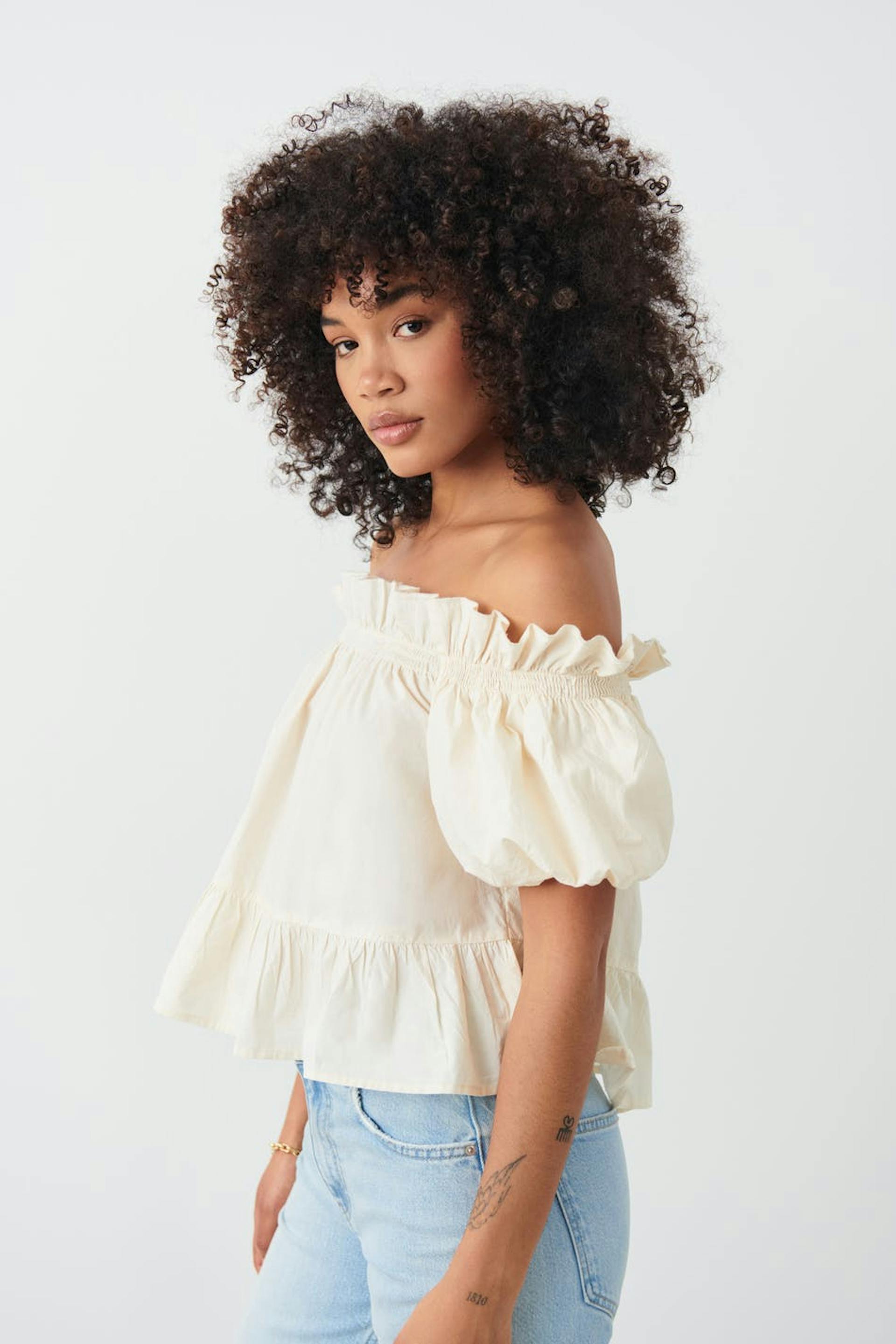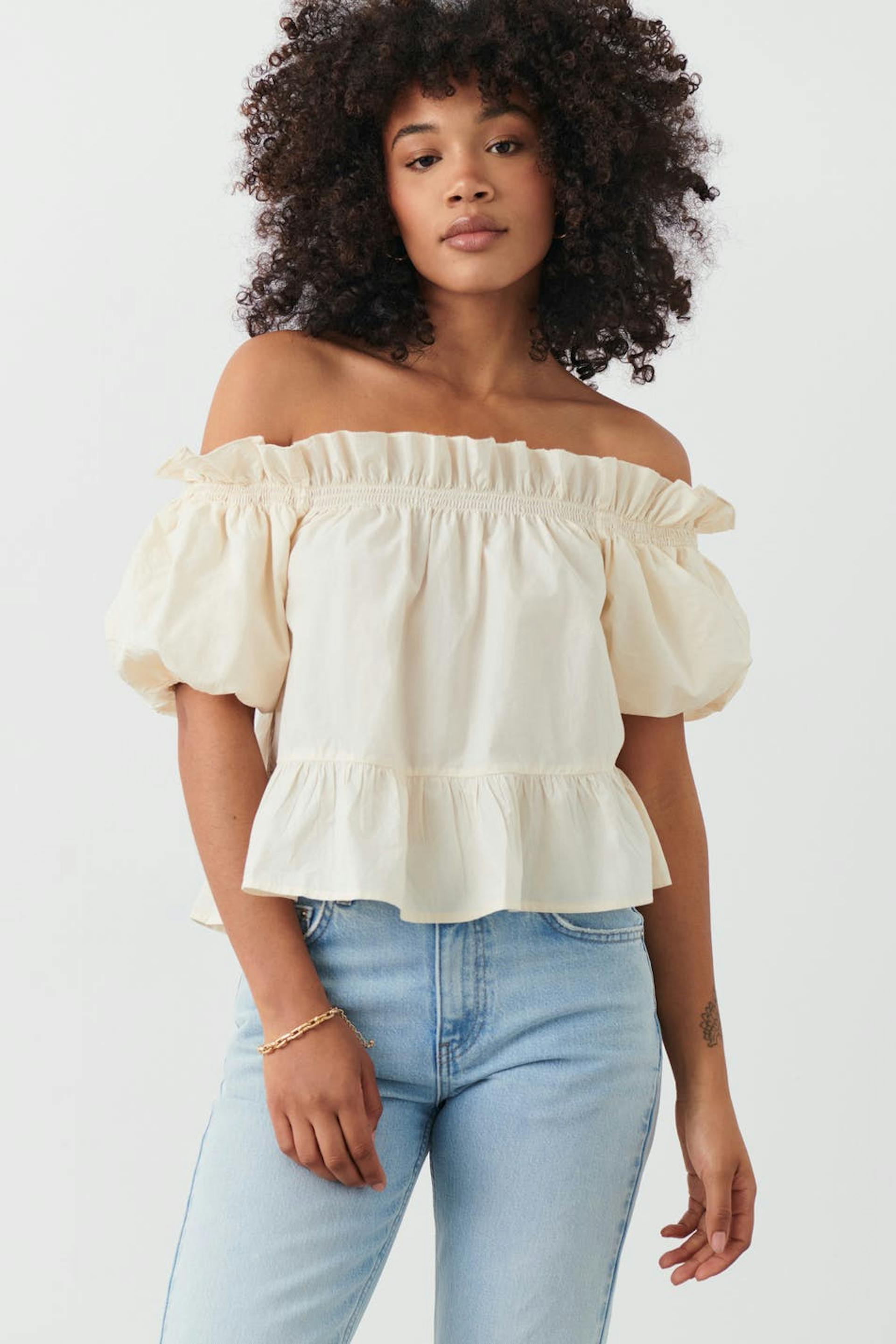 Voluminøs bluse med bare skuldre med kort pufferme. Blusen er hvit og har volanger på halslinjen og i nedre kant. Den har gummistrikk ved ermeslutten og rundt skuldrene.
