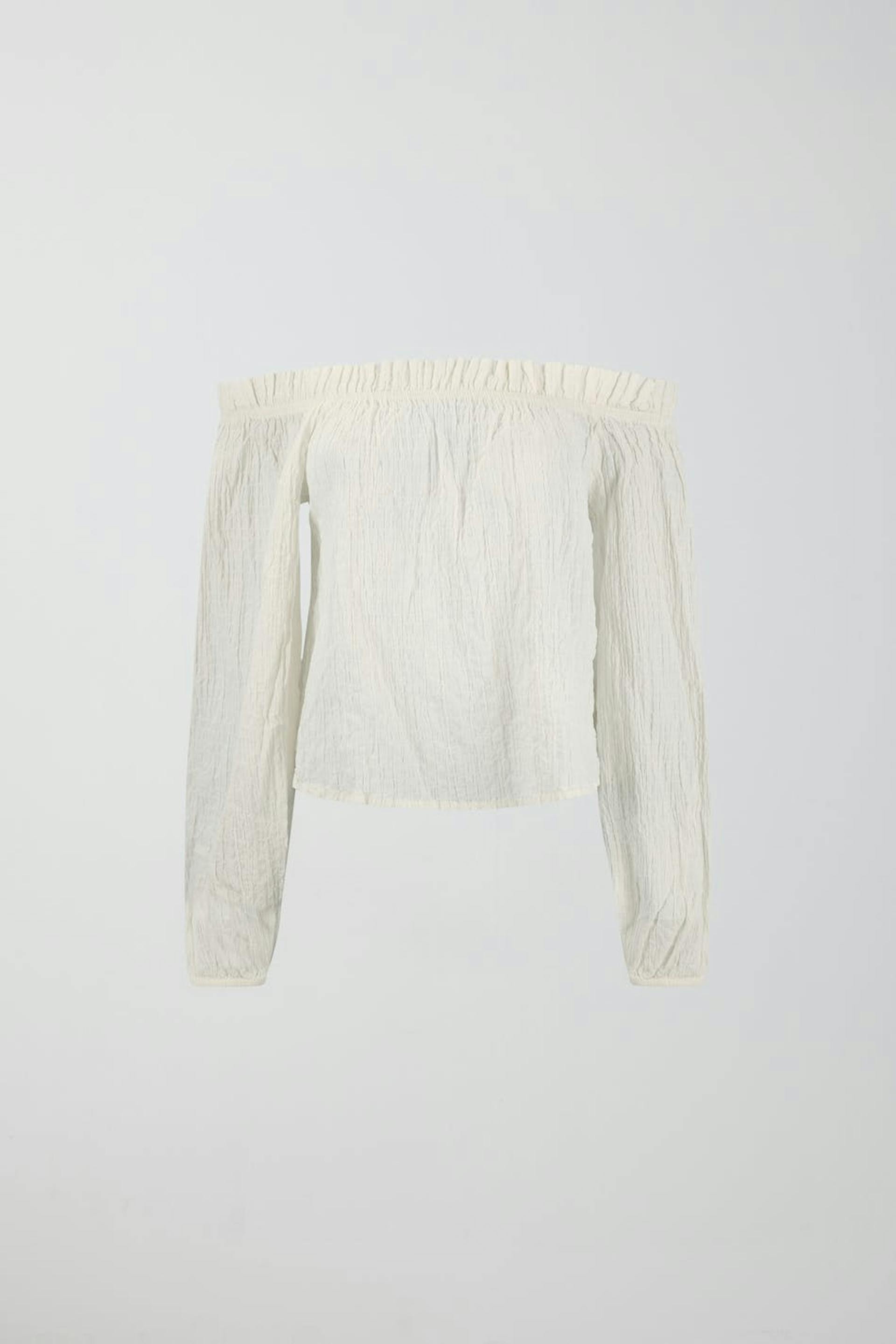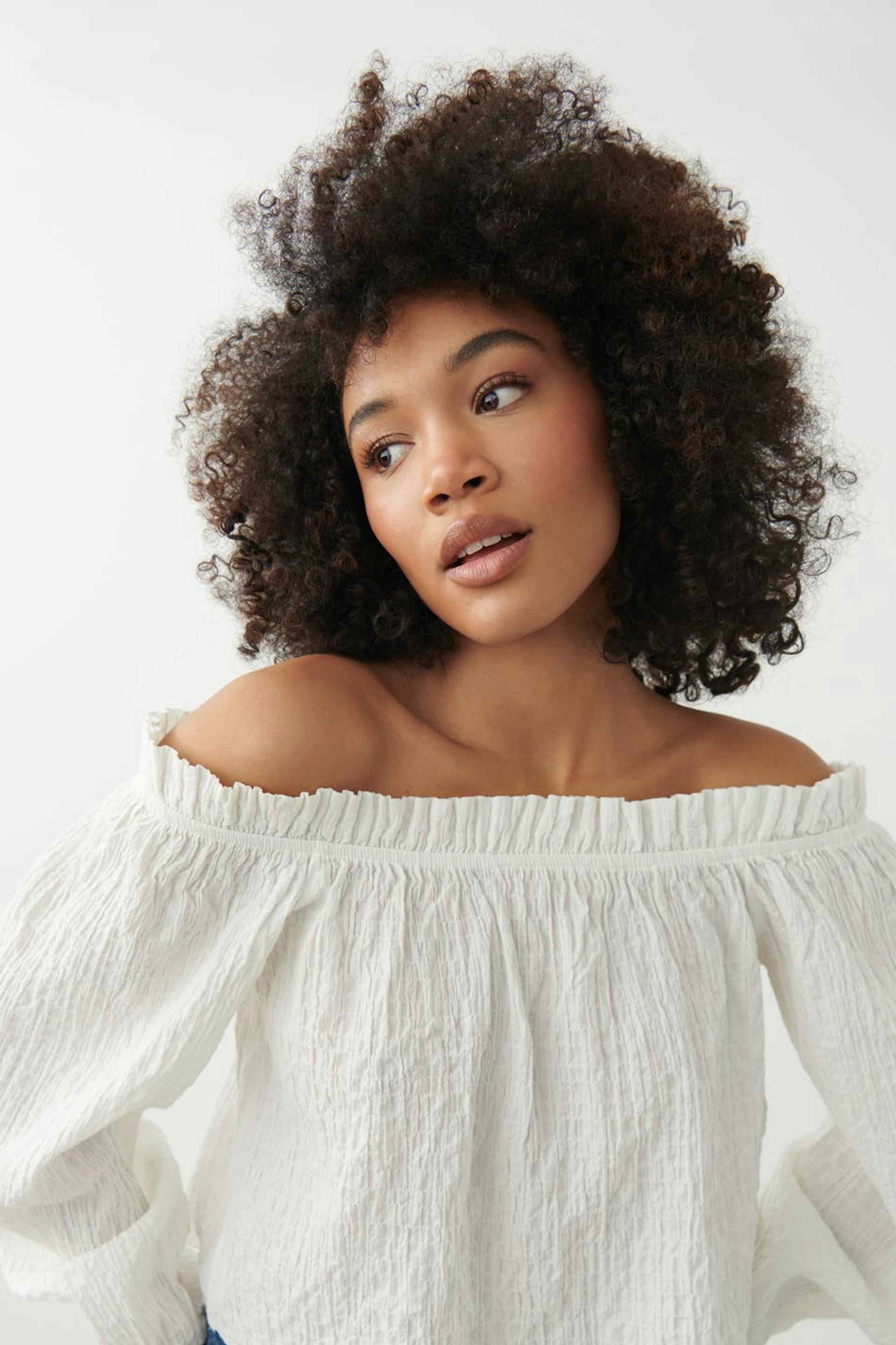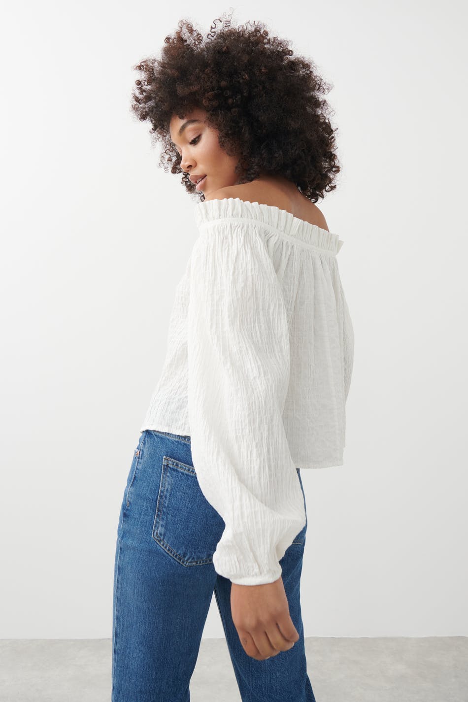 Bluse med bare skuldre med boxy passform. Blusen er hvit og har et strukturert materiale. Den har elastiske mansjetter og volanger på halslinjen.
