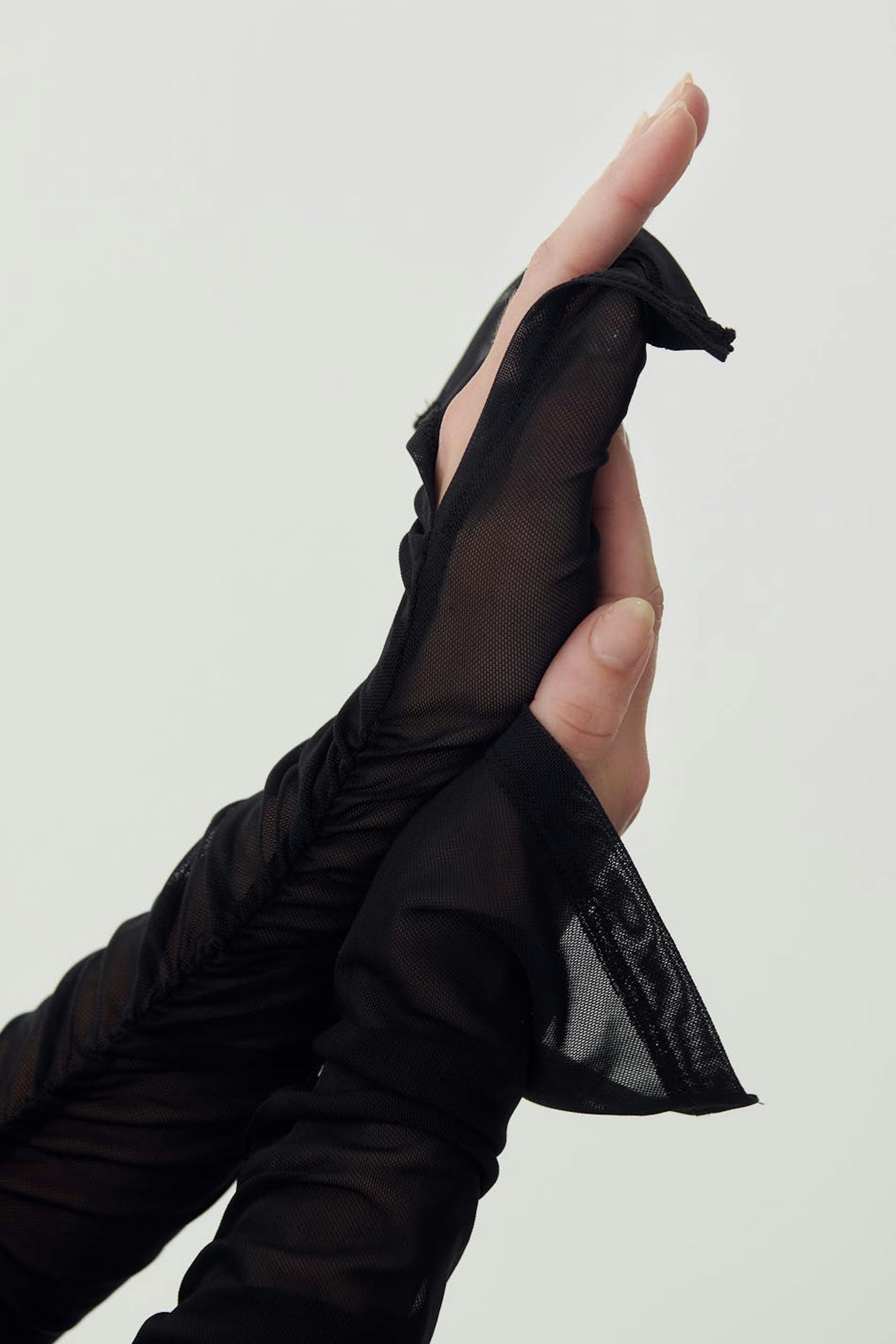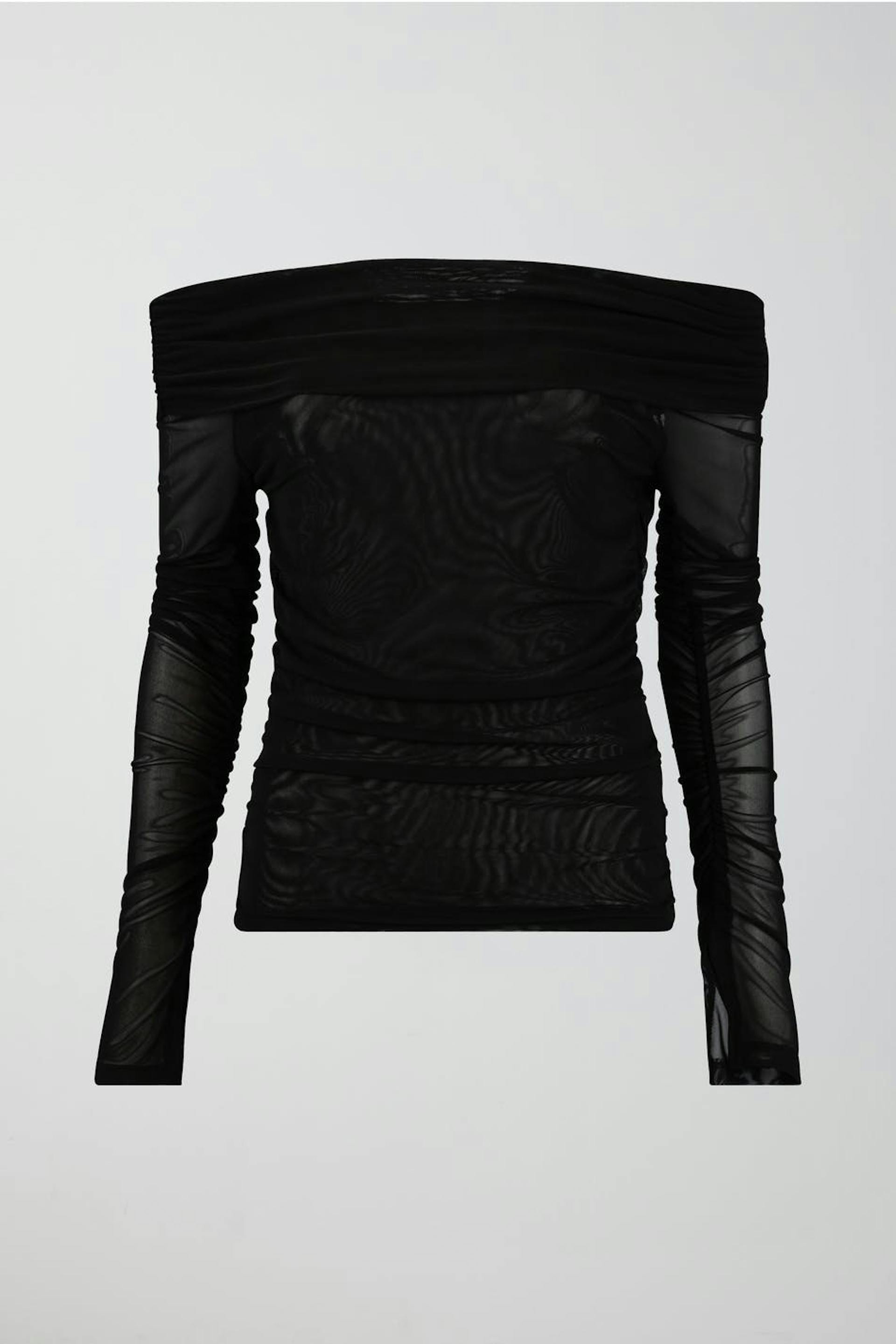 Langermet topp i mesh med rysjet effekt. Toppen er svart og har figurnær passform.