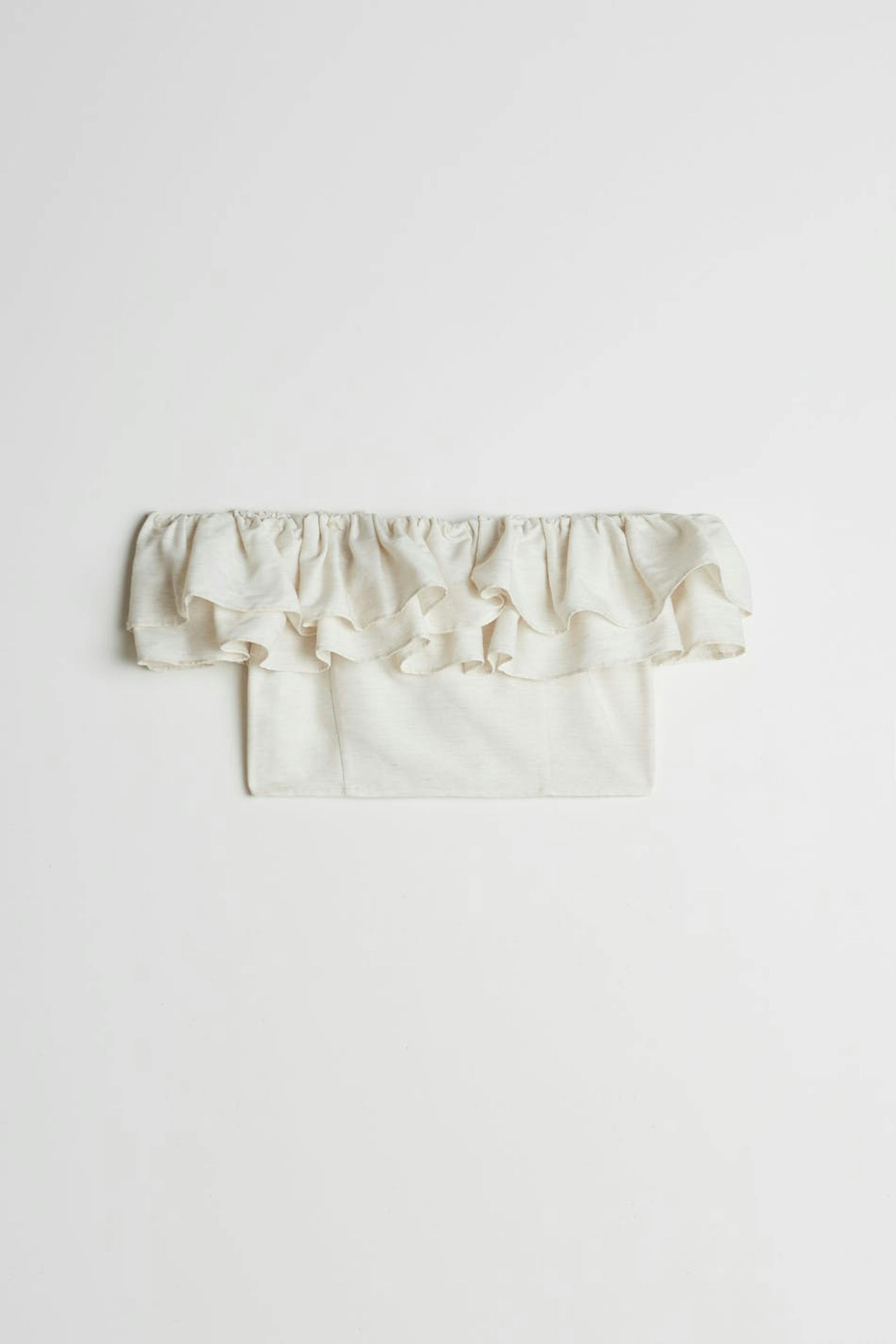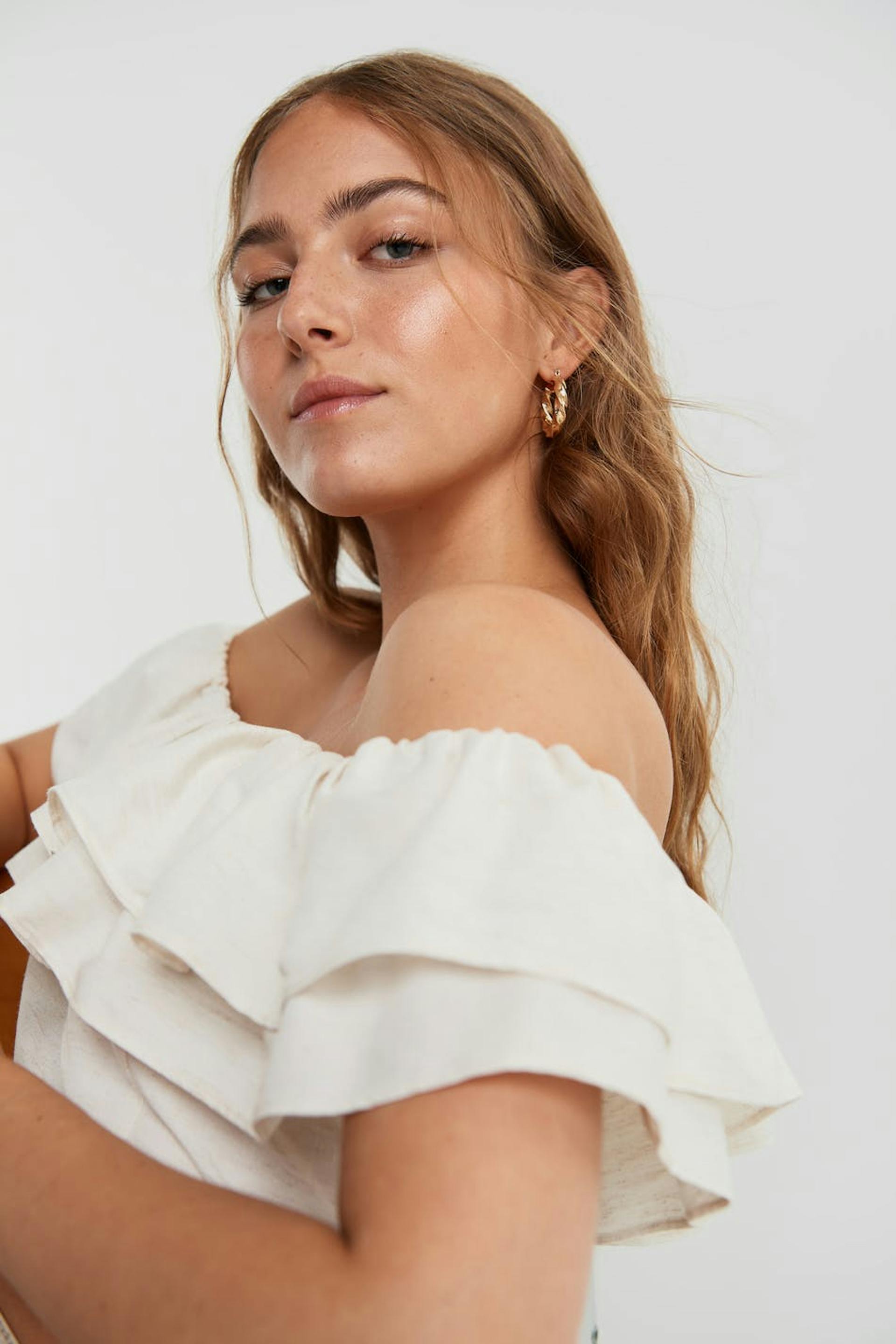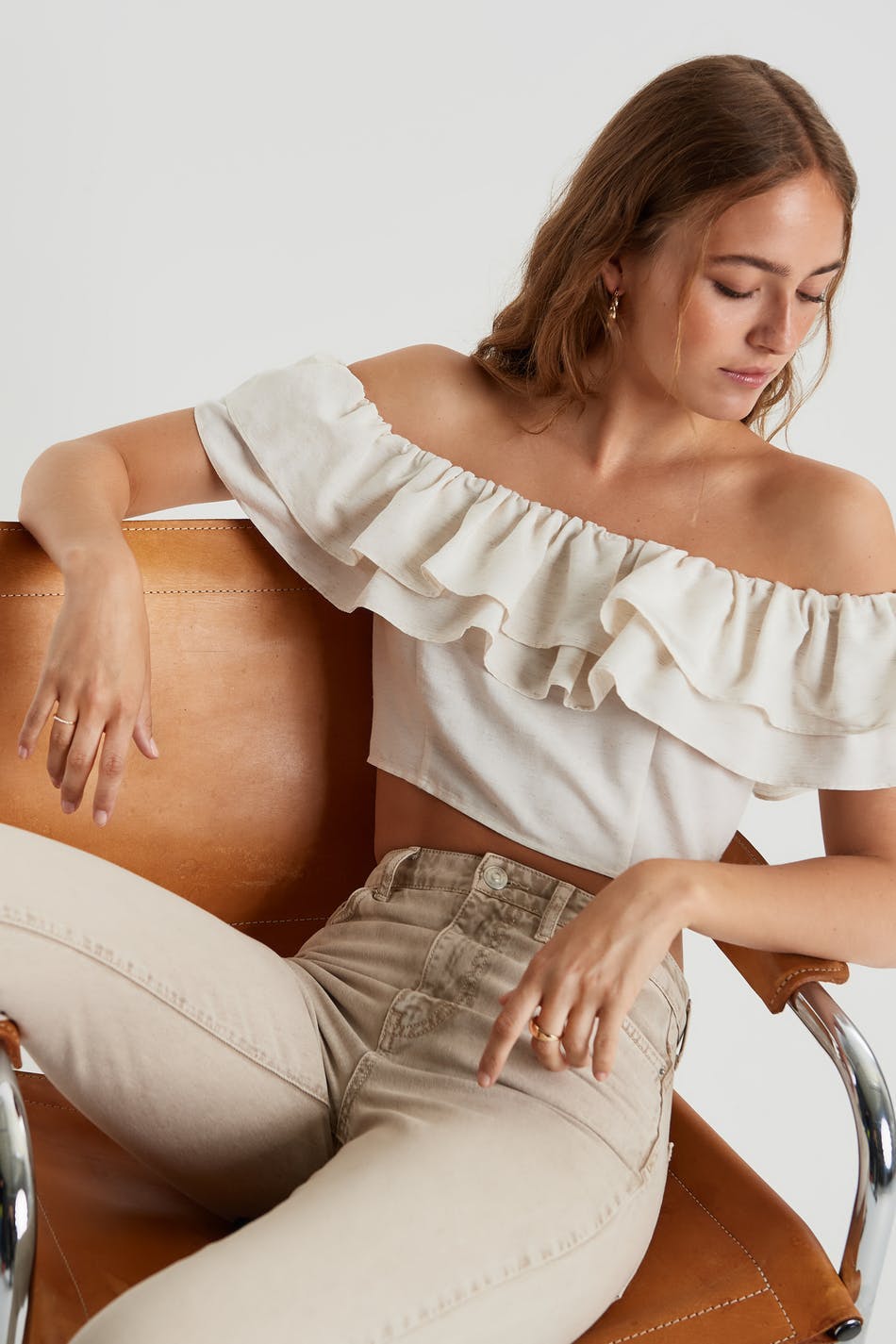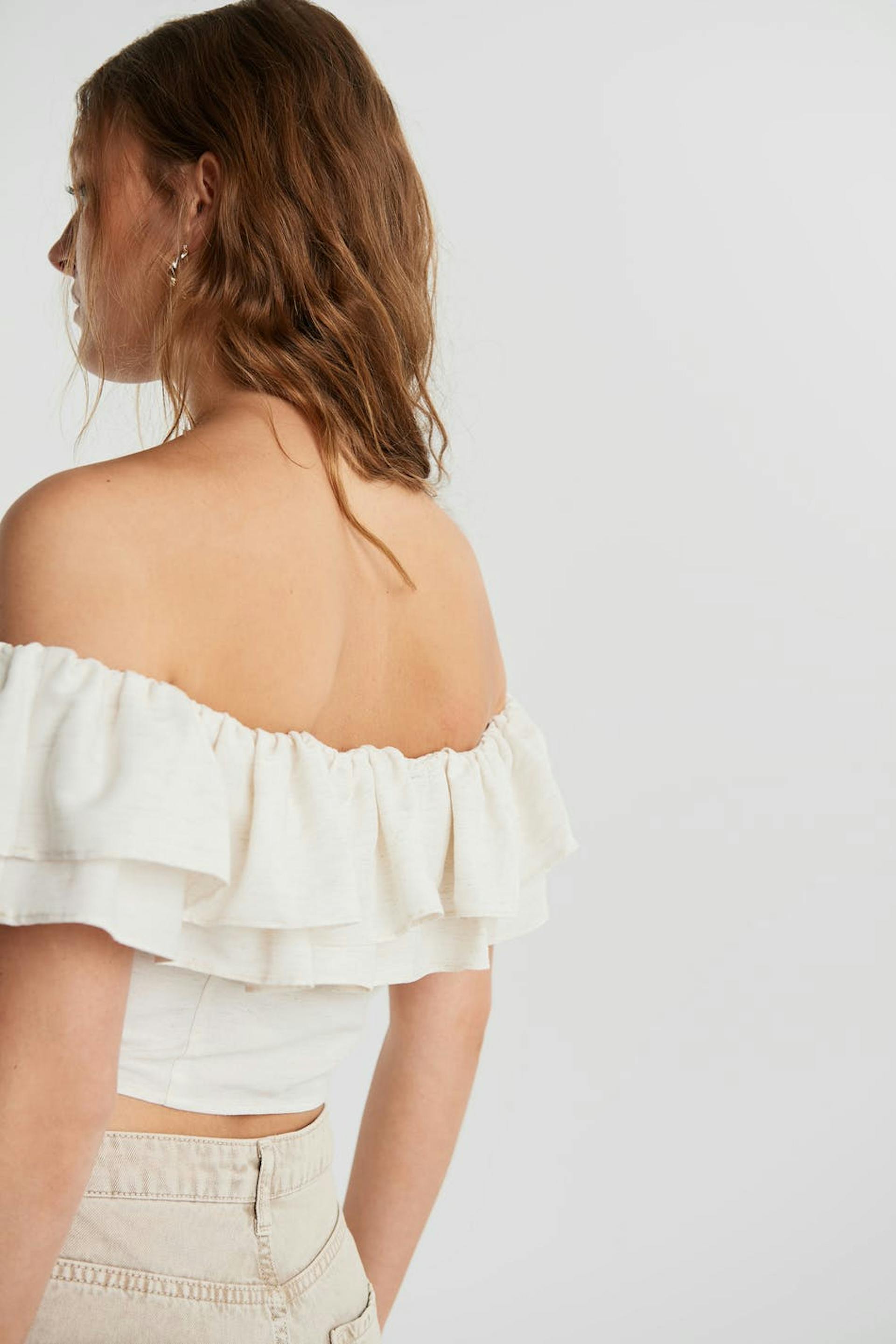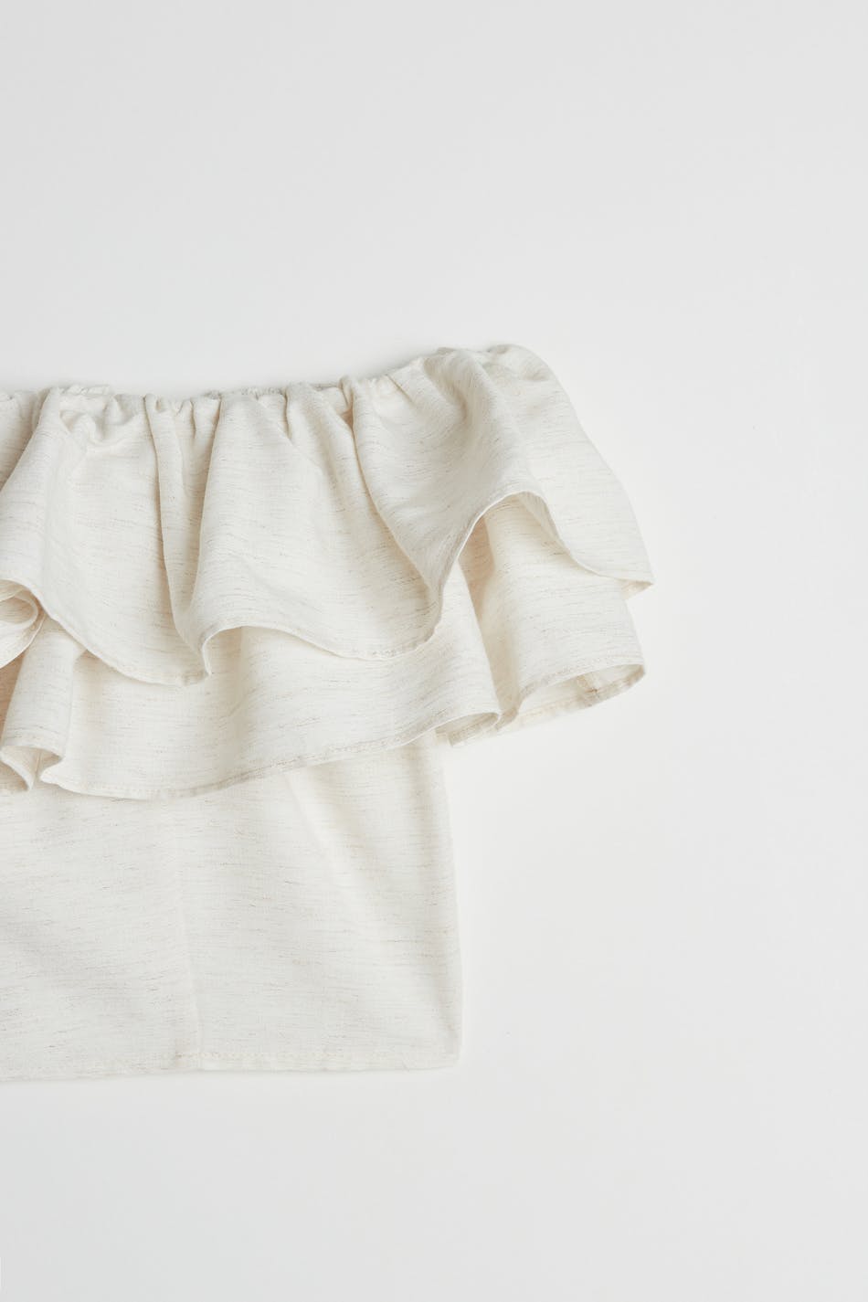 Kort off shoulder-topp med en vanlig passform. Toppen er perfekt for festen og lys beige og har volanger.