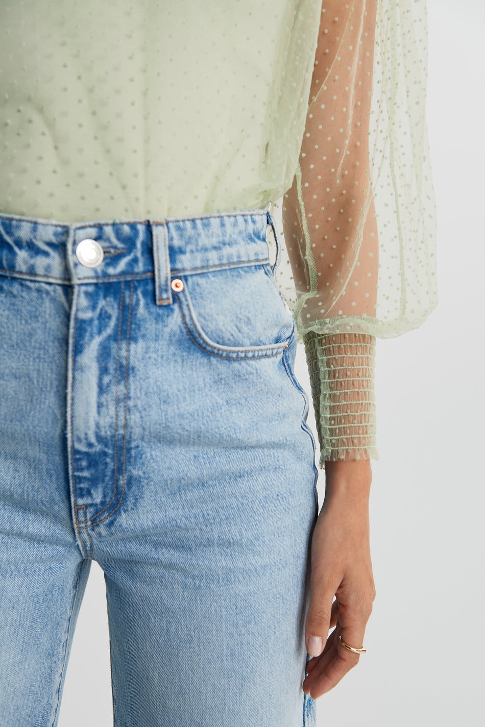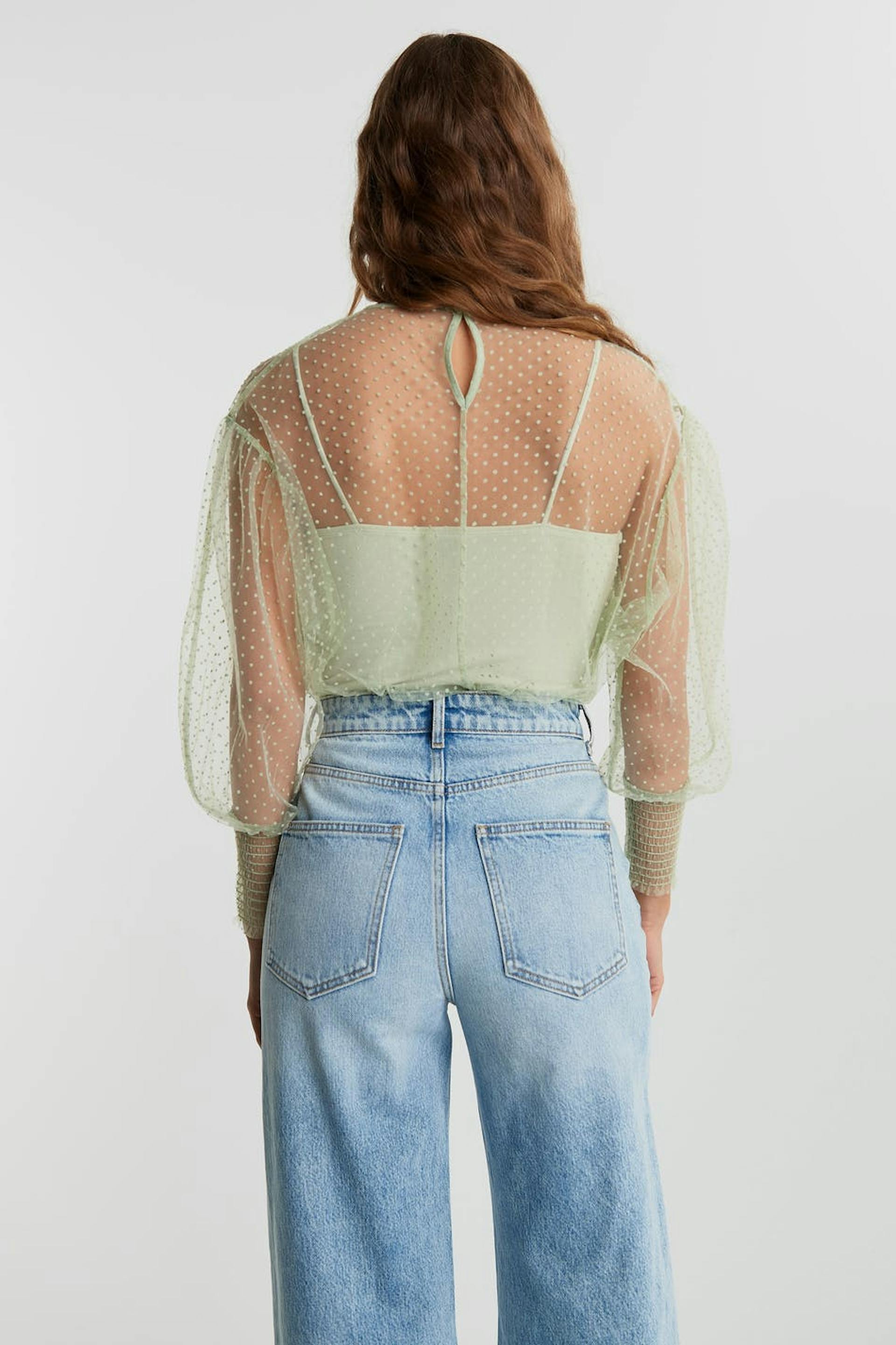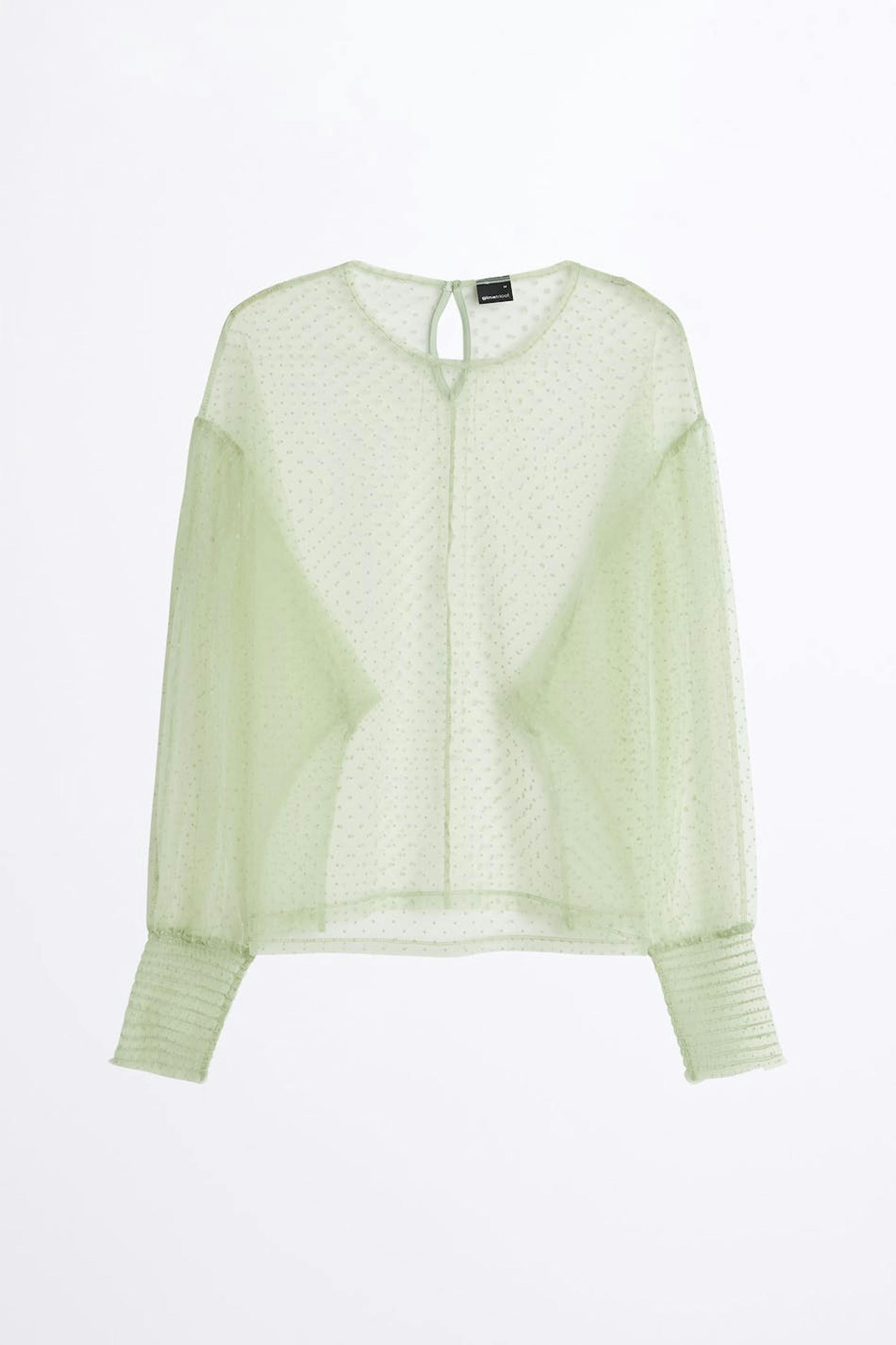 Gjennomsiktig topp med lange ballongermer med en vaffelsøm på enden av ermene. Toppen er perfekt for festen og grønn og har prikker overalt. Den er laget av mesh.