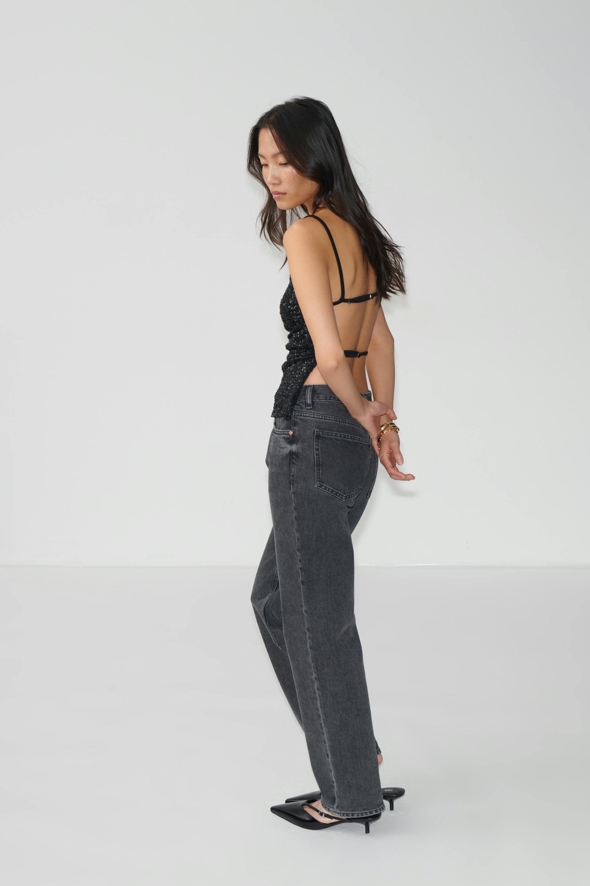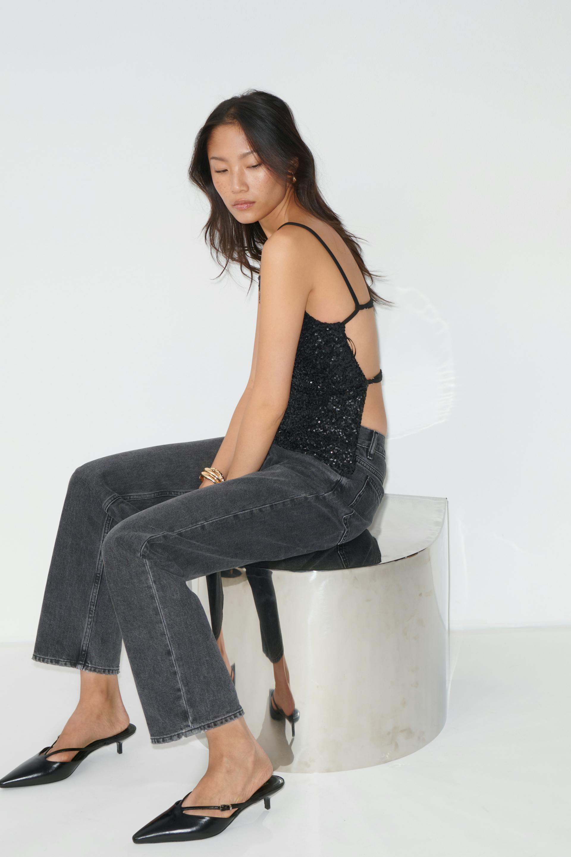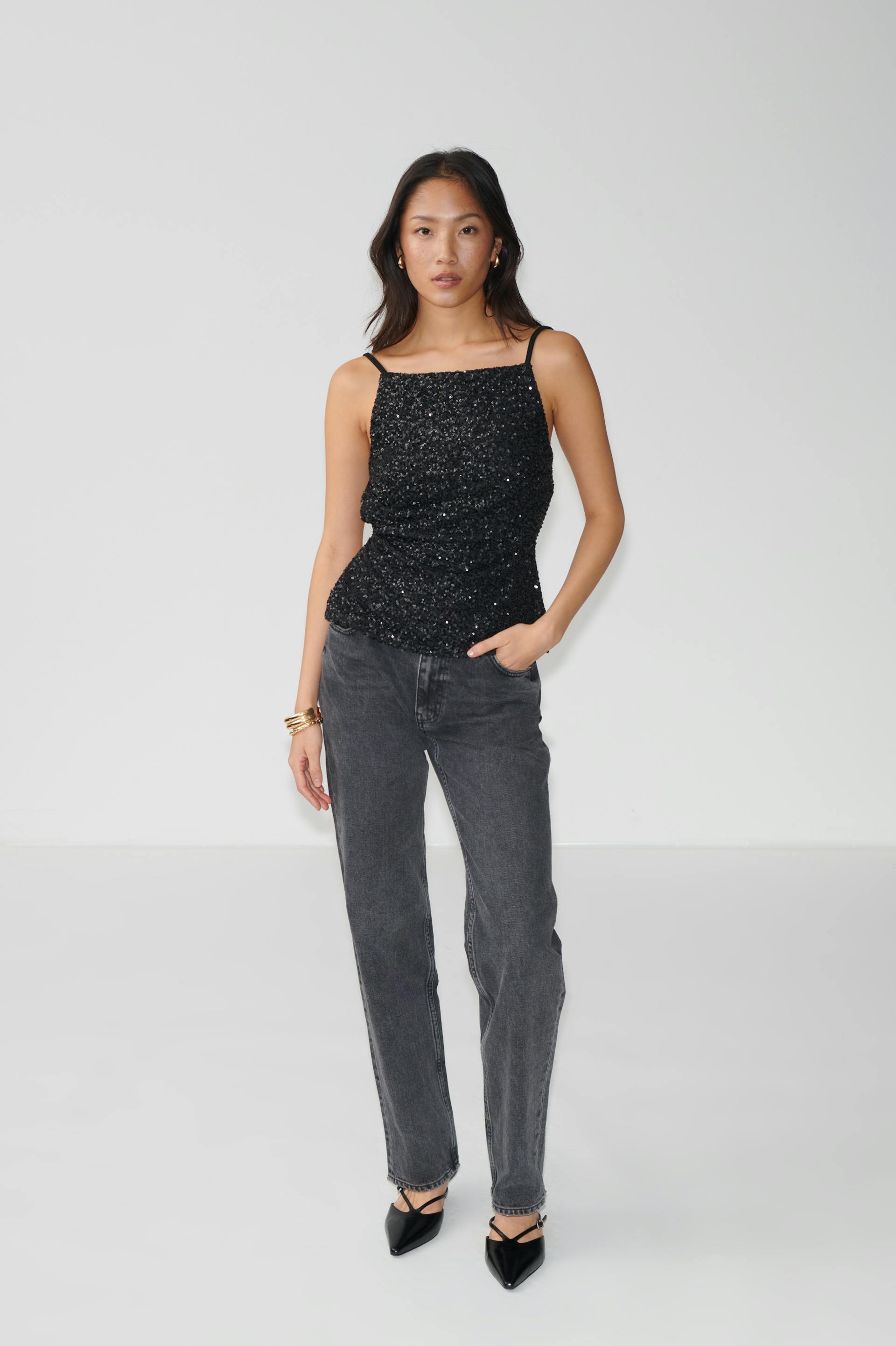Ermløs paljettopp med åpen rygg. Paljettoppen er svart og har vanlig passform. Den har smale skulderstropper og justerbare elastiske stropper i ryggen. Fôret.