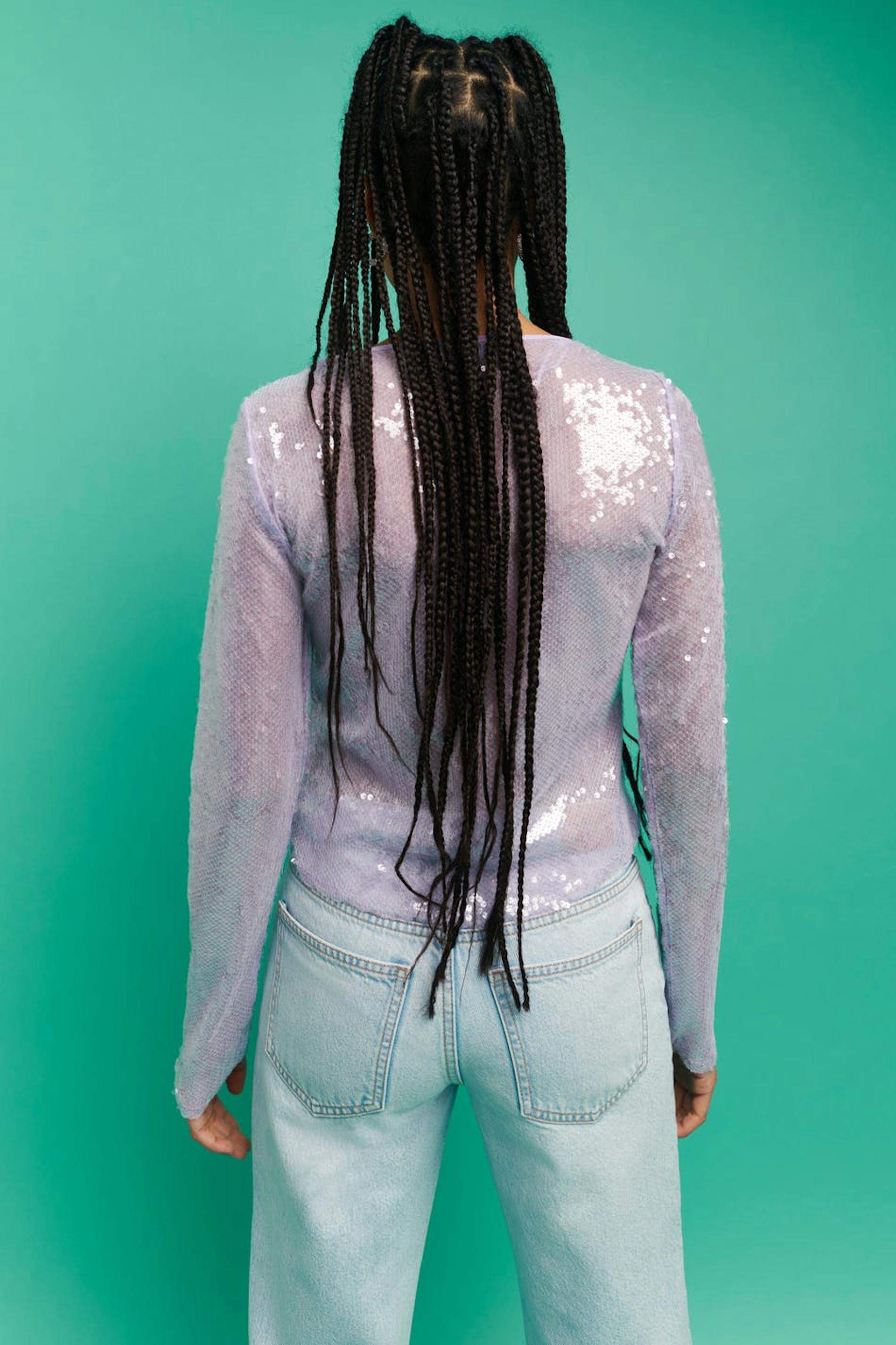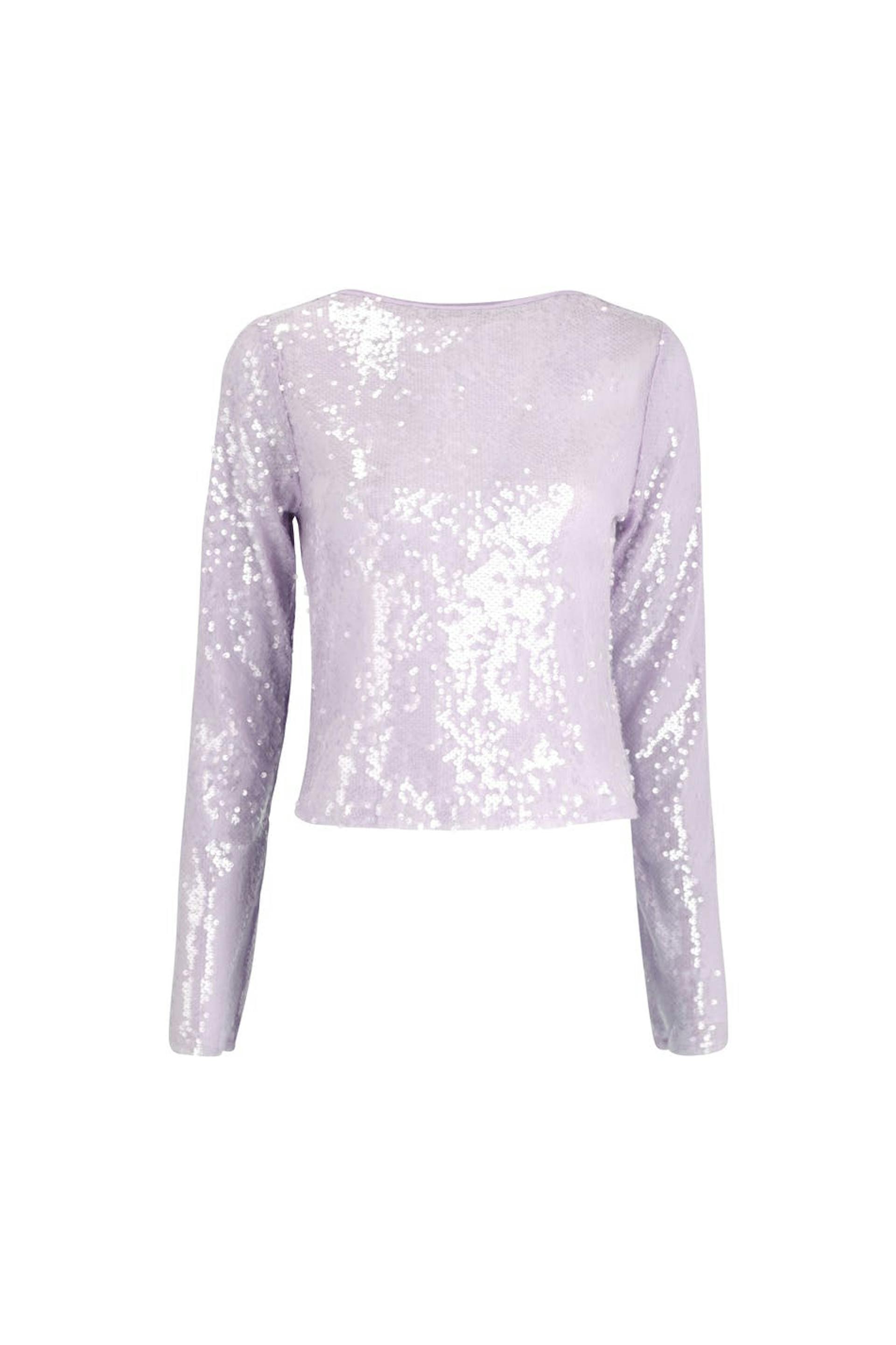 Langermet paljettopp med en oversized passform. Paljettoppen er lilla og har høy hals.