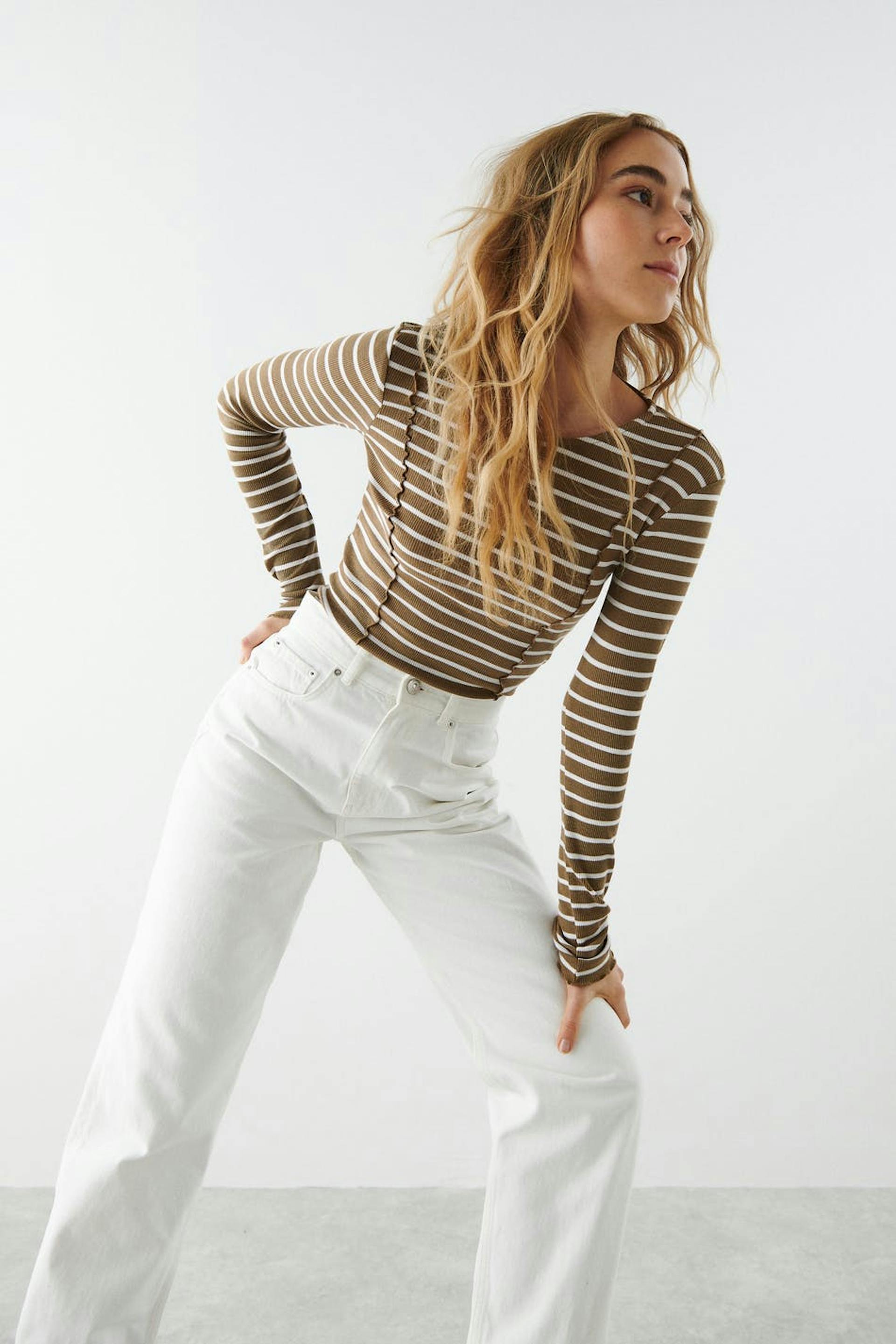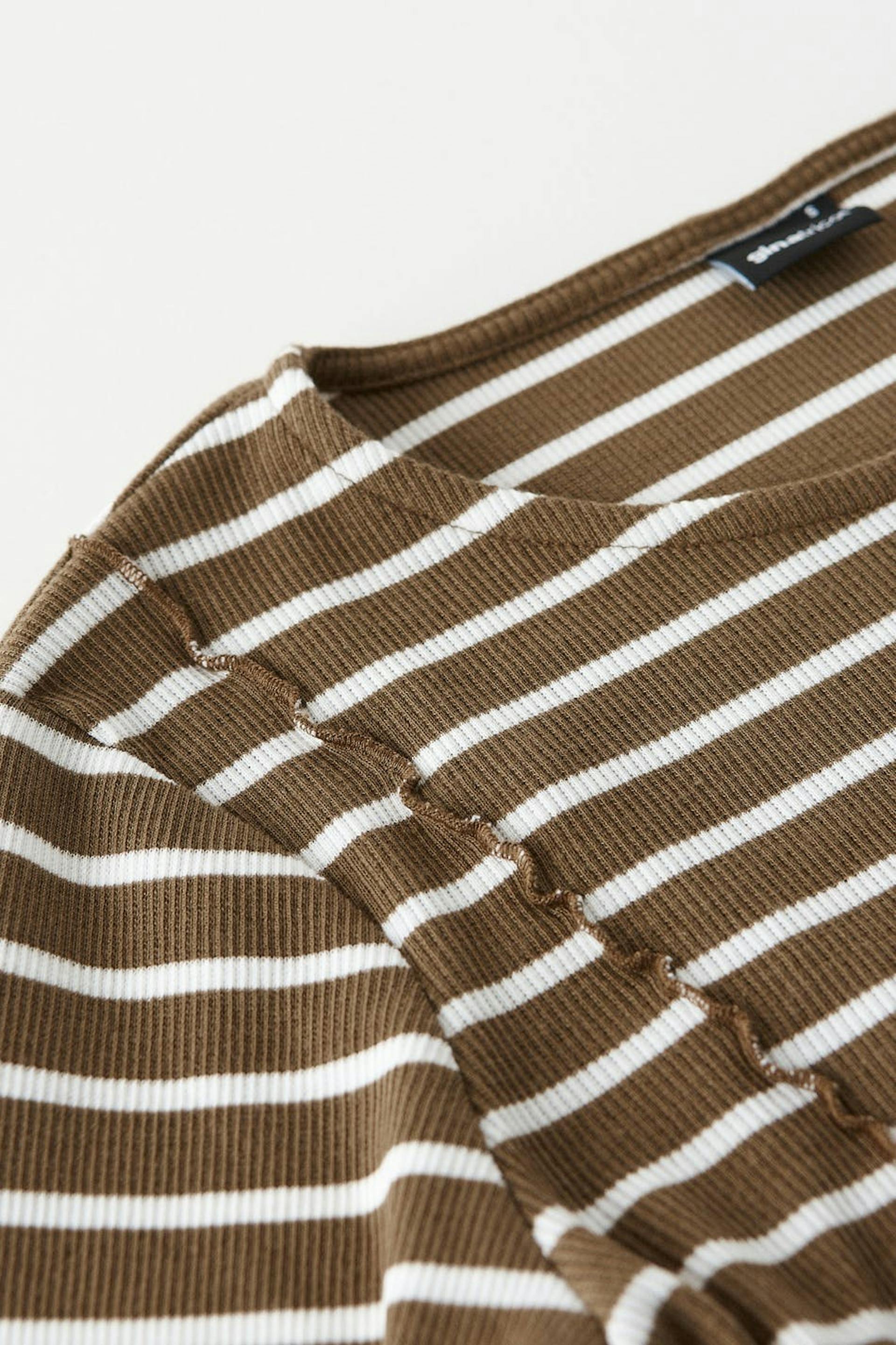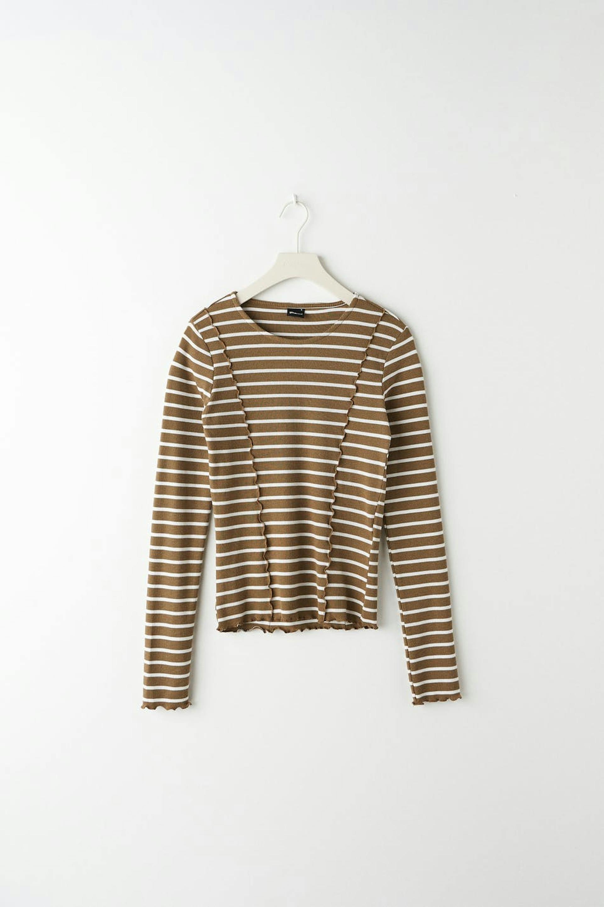 Stripete topp med tilpasset passform. Toppen er beige, hvit og ribbet. Den har dekorative sømdetaljer foran og bak, båthals, lange ermer og rullefald på bunnen.