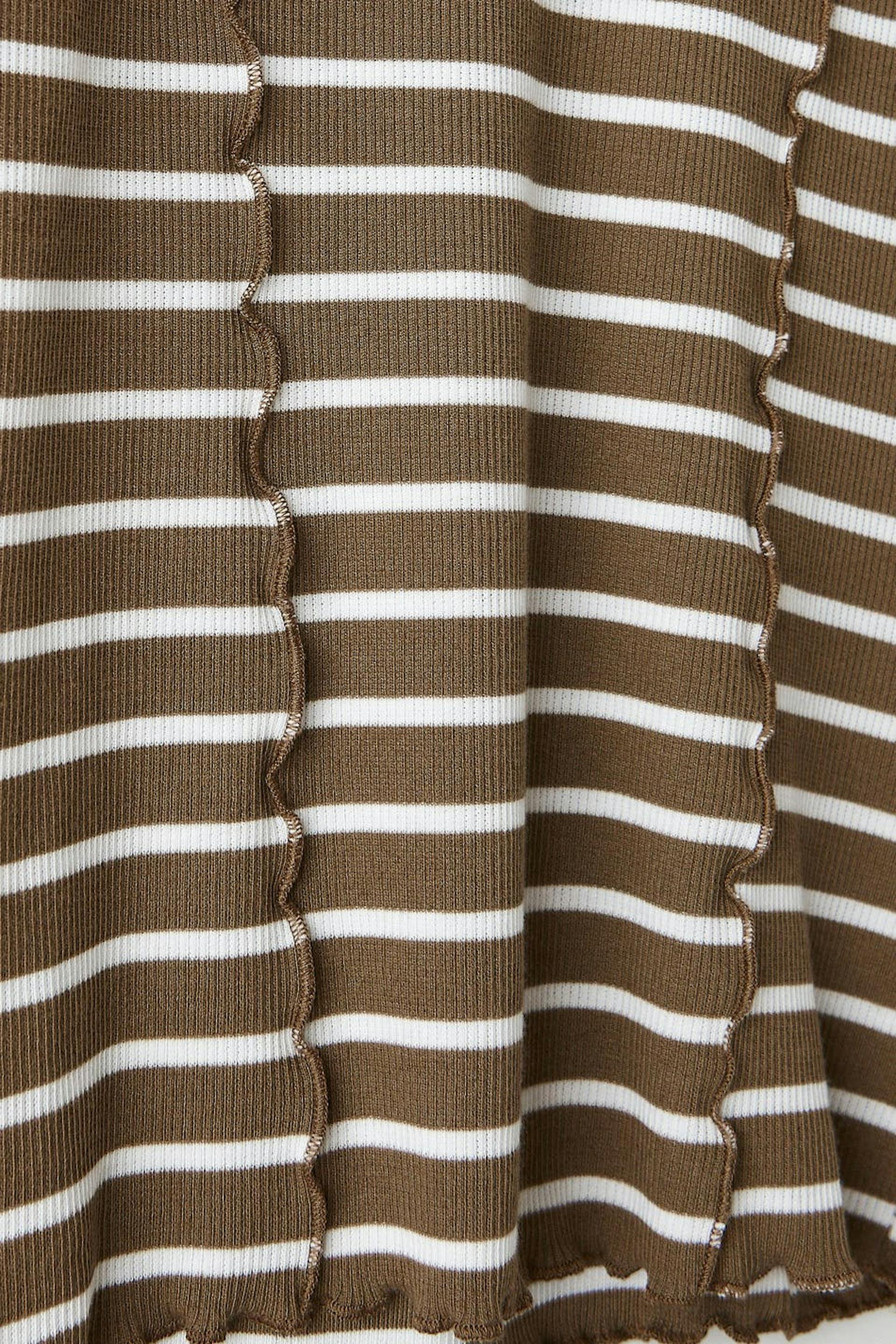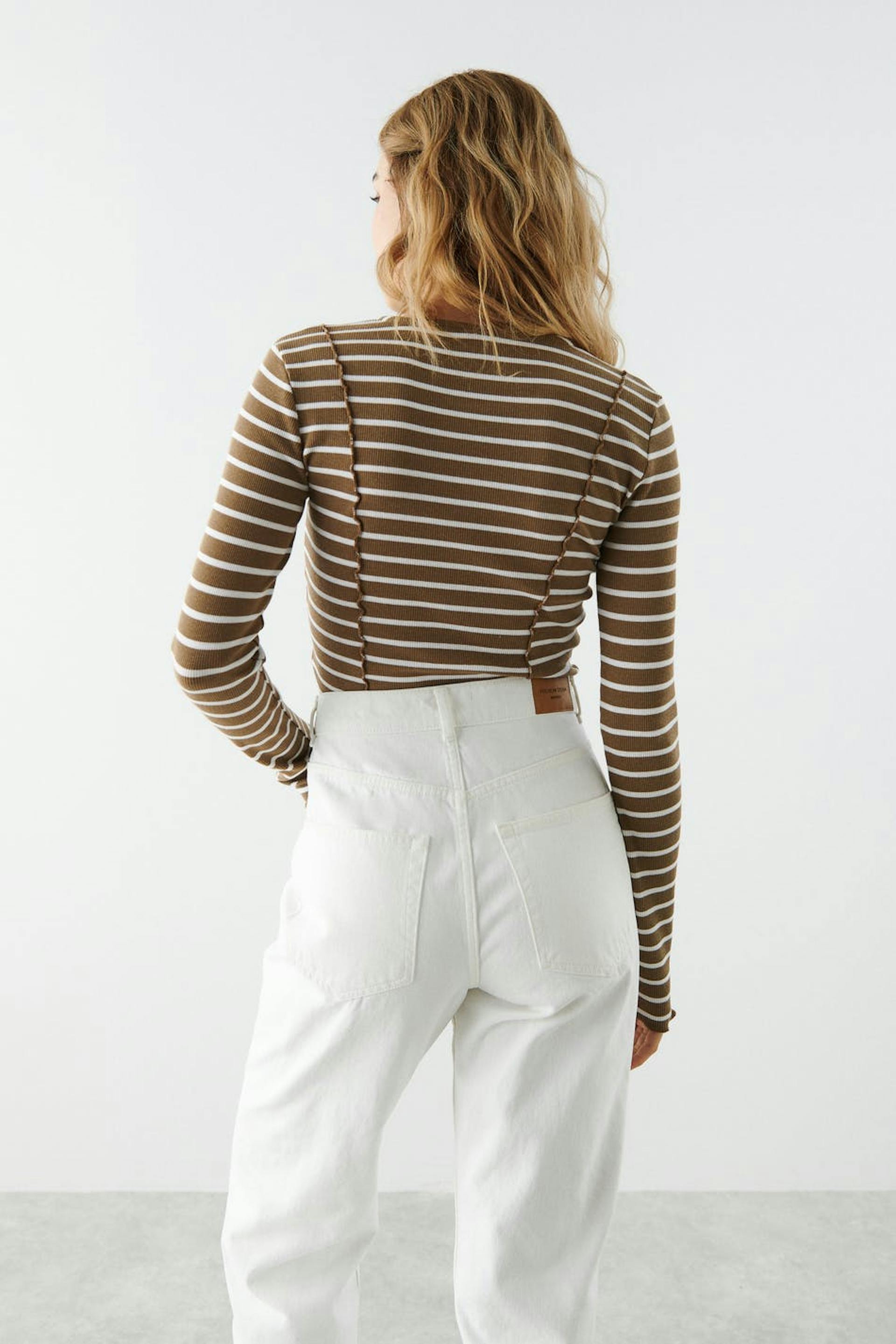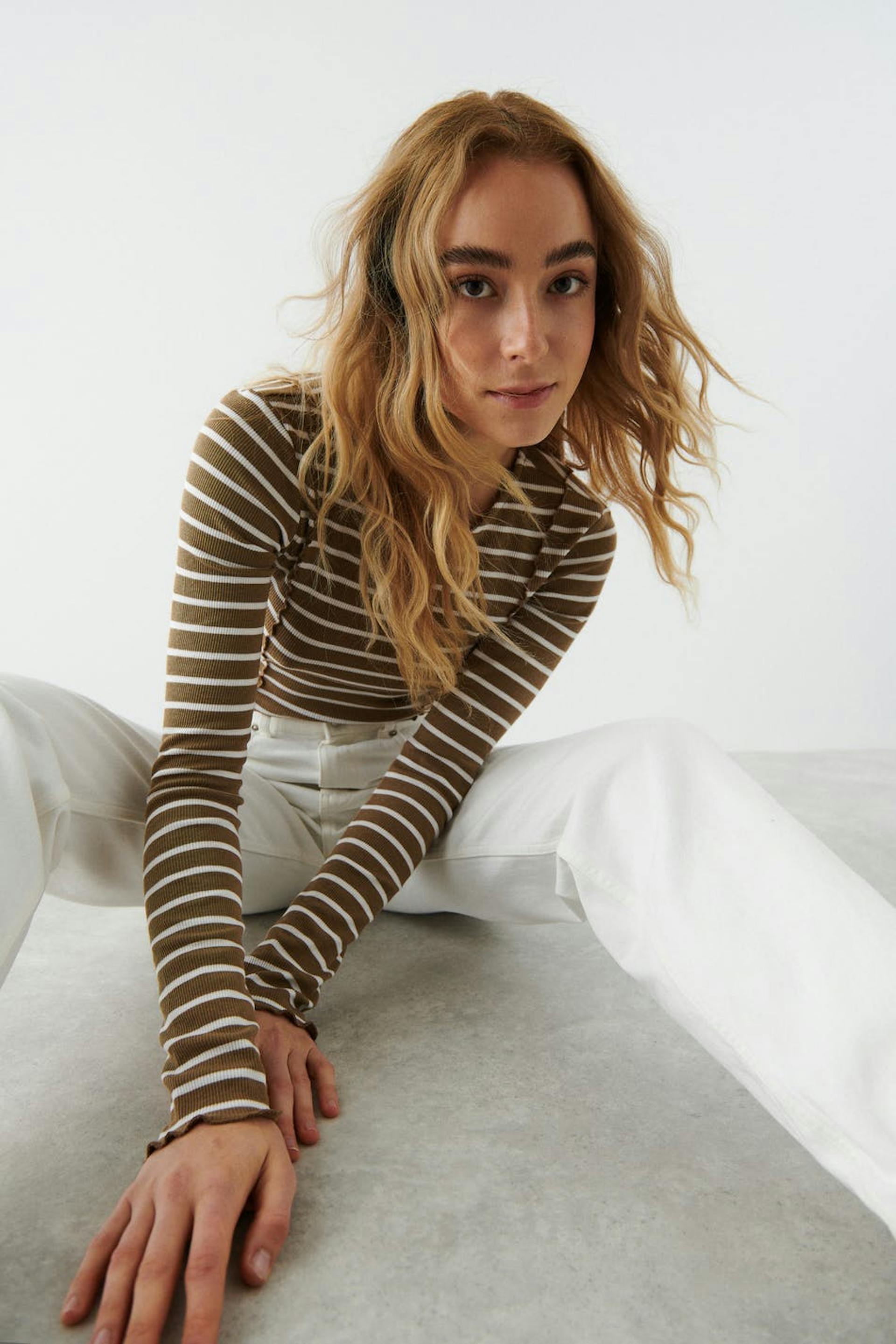 Stripete topp med tilpasset passform. Toppen er beige, hvit og ribbet. Den har dekorative sømdetaljer foran og bak, båthals, lange ermer og rullefald på bunnen.