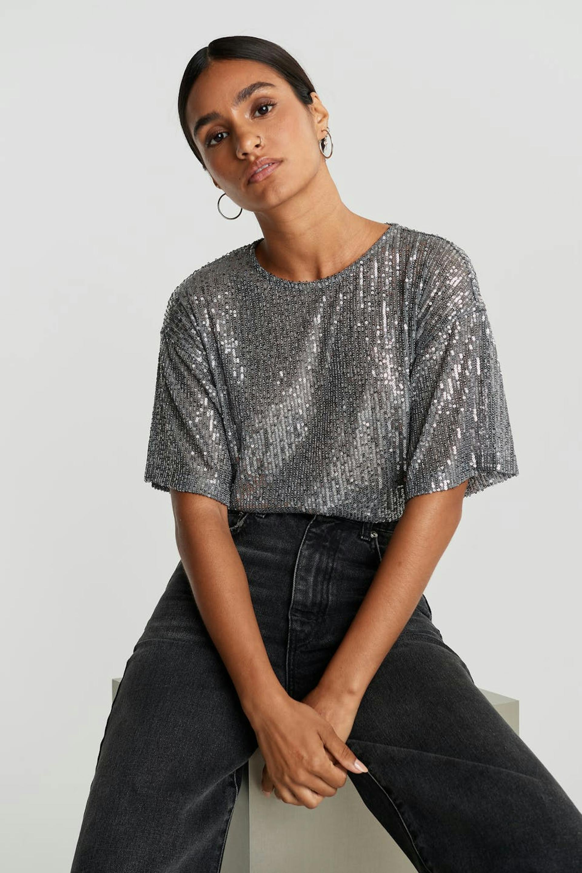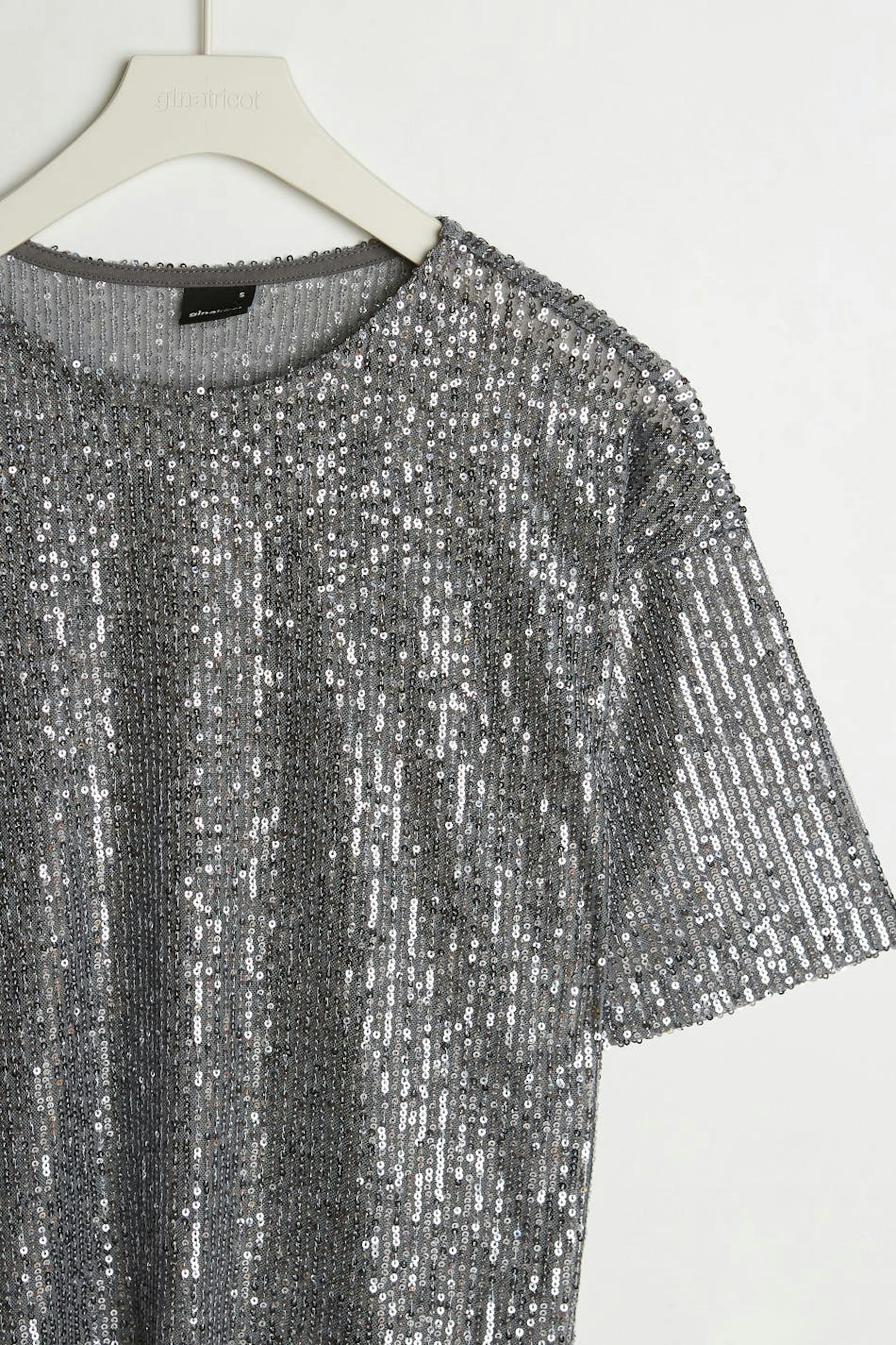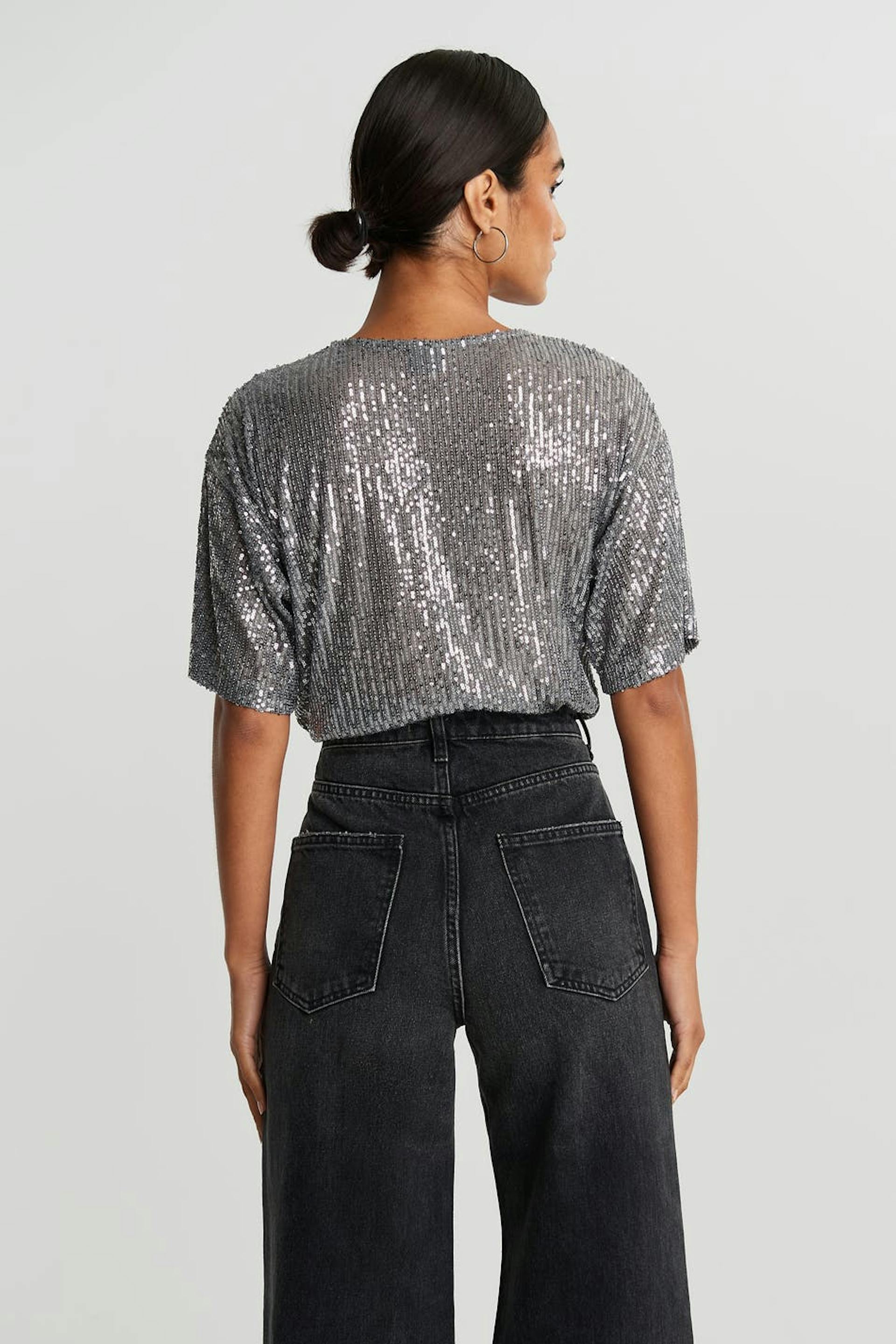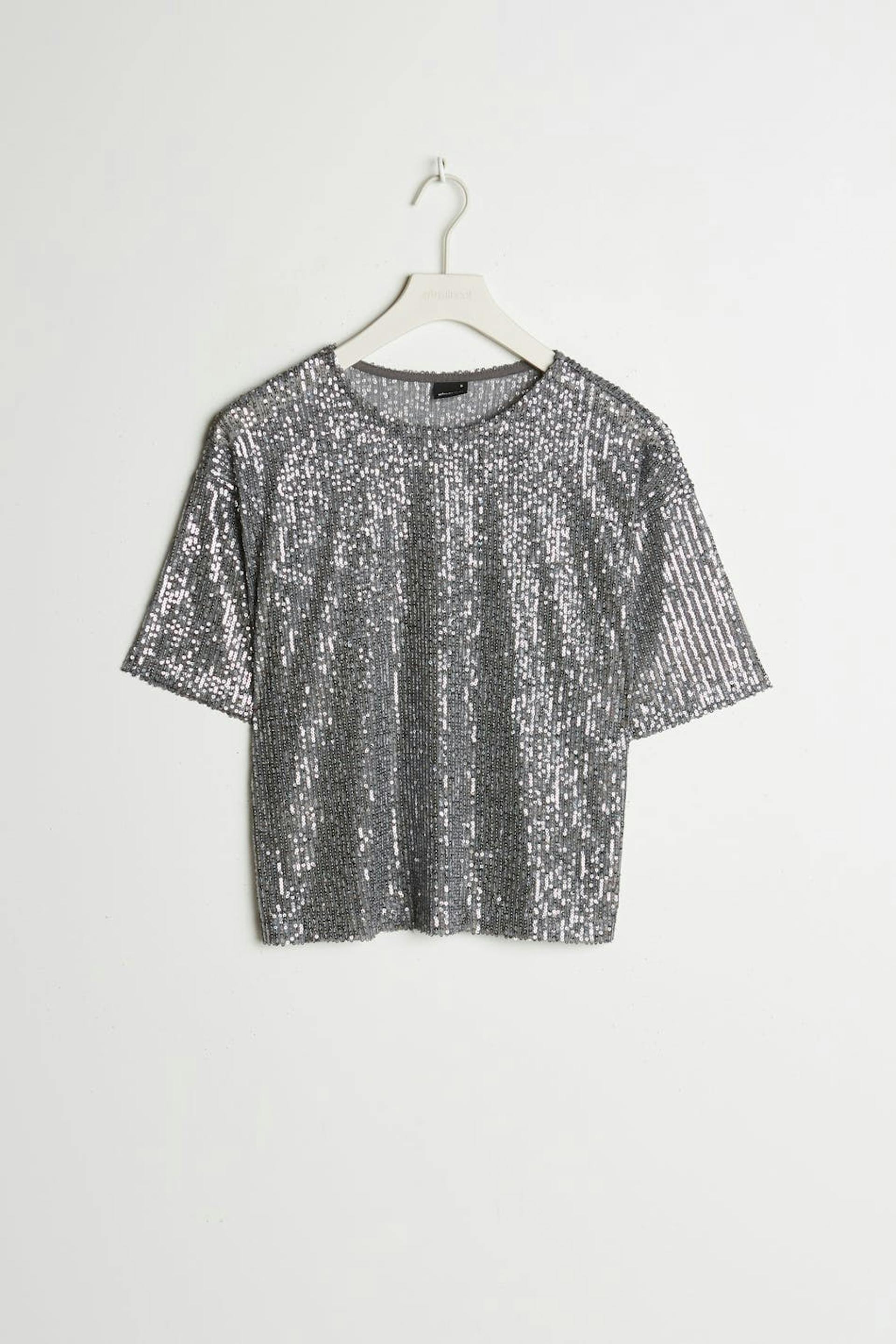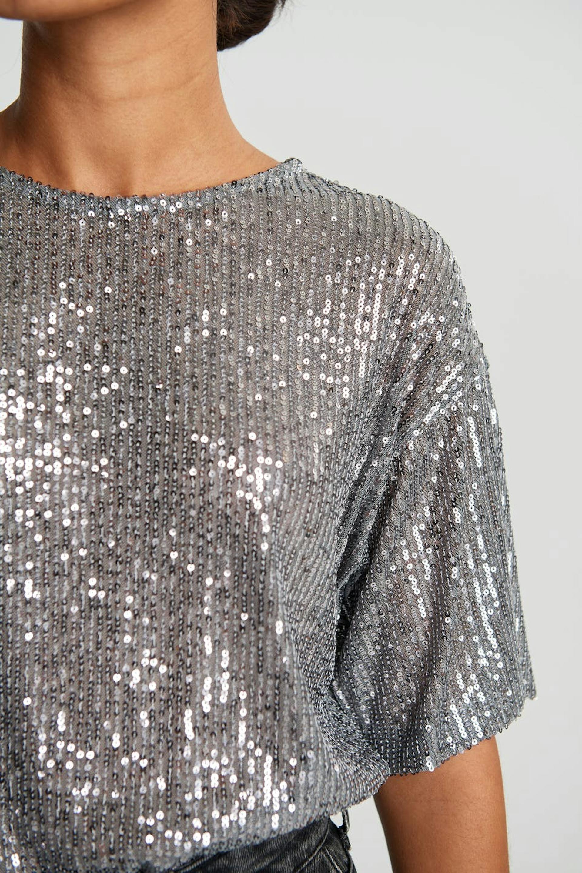 Kortermet topp med en sjenerøs passform. Toppen er sølvfarget og har paljetter overalt.