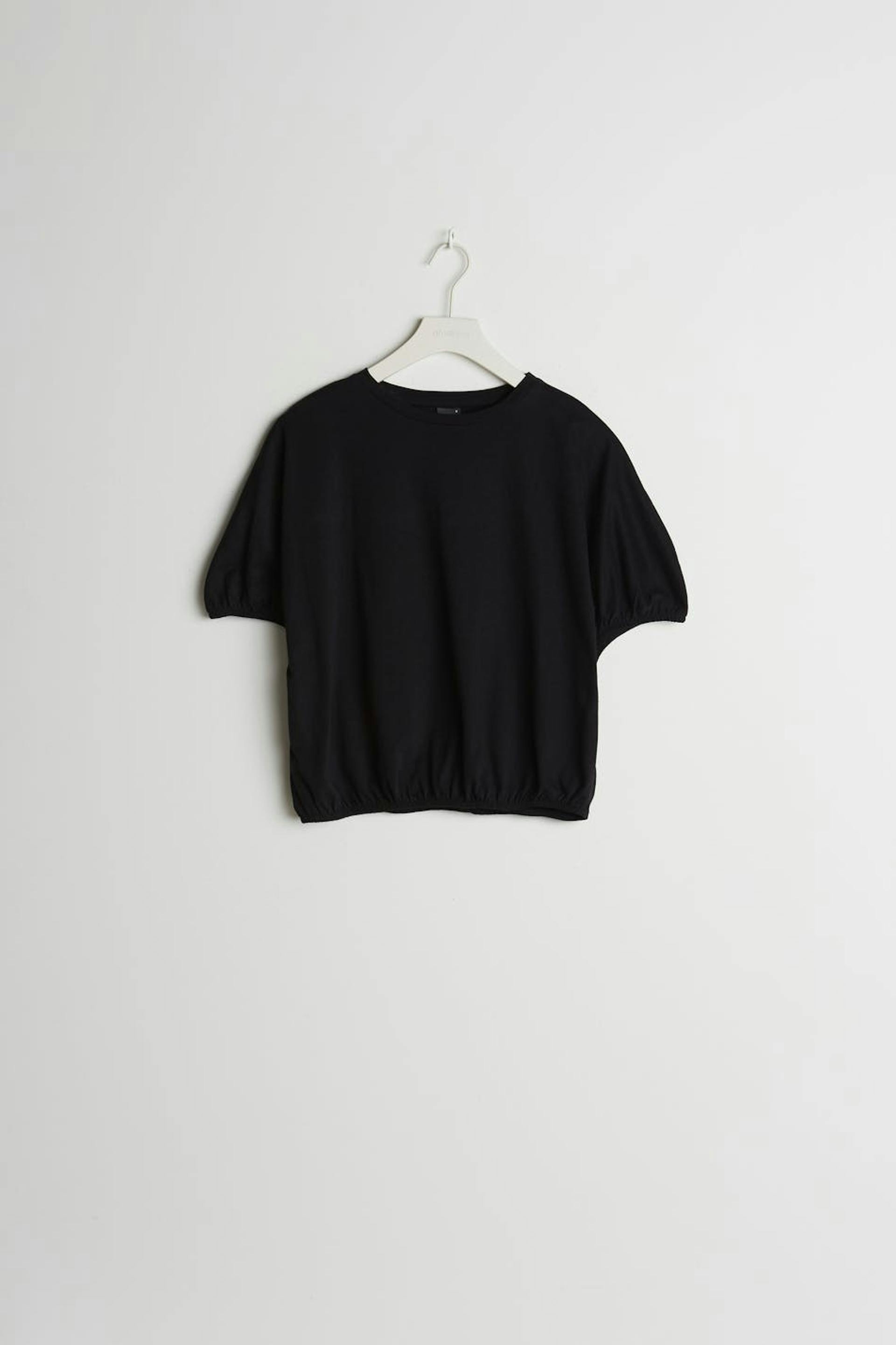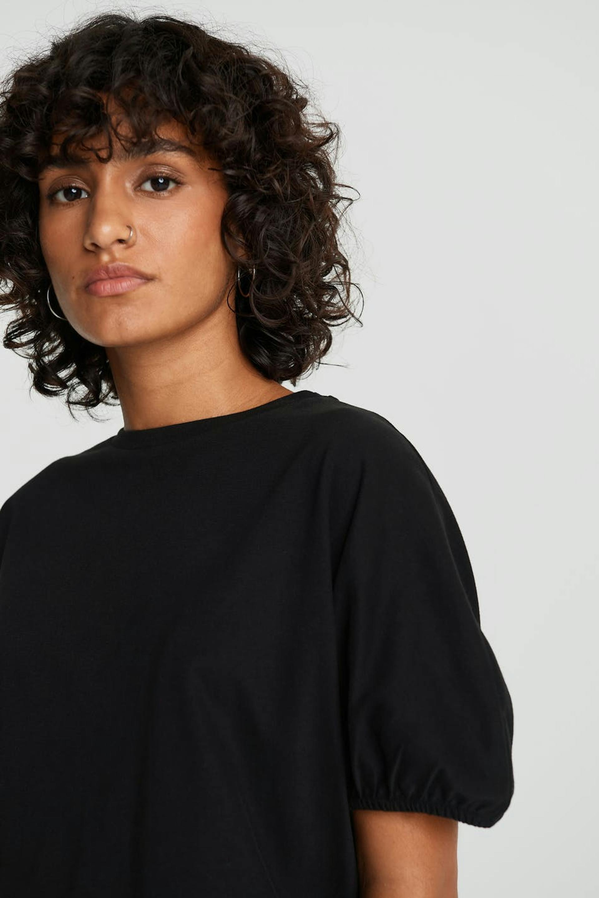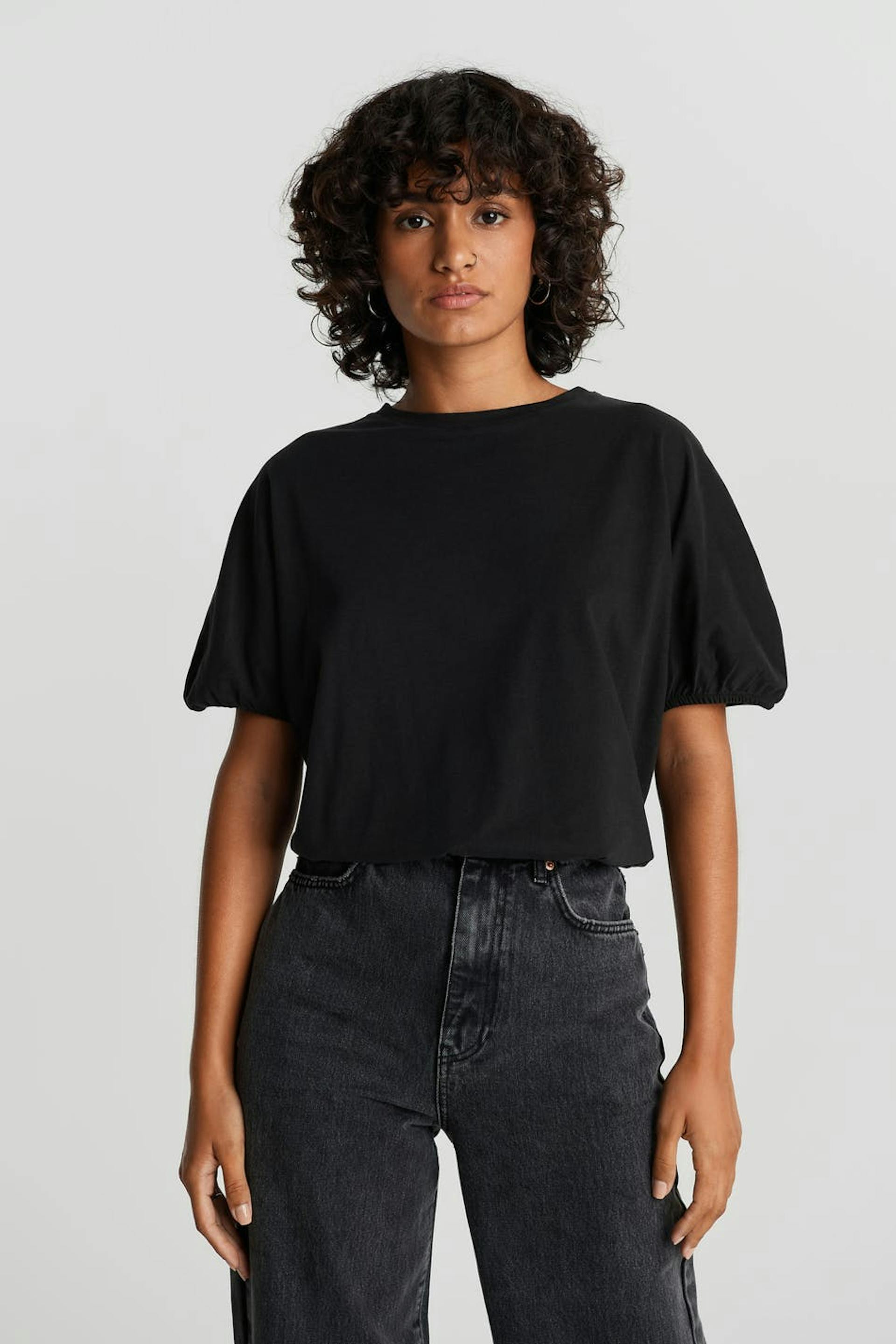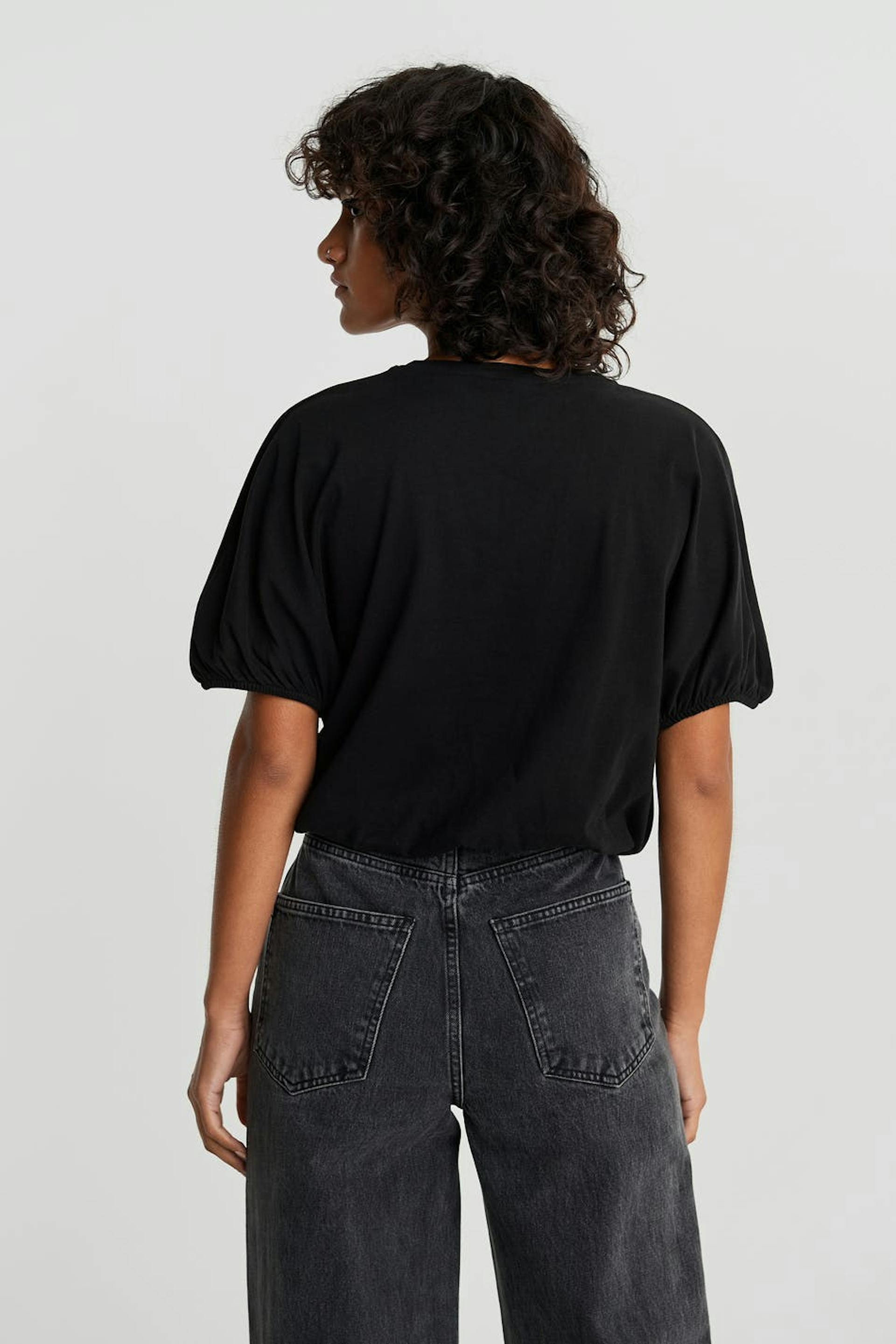 Kort topp med en vanlig passform. Toppen er svart og har puffermer. Den har rynke på enden av ermene og på linningen.