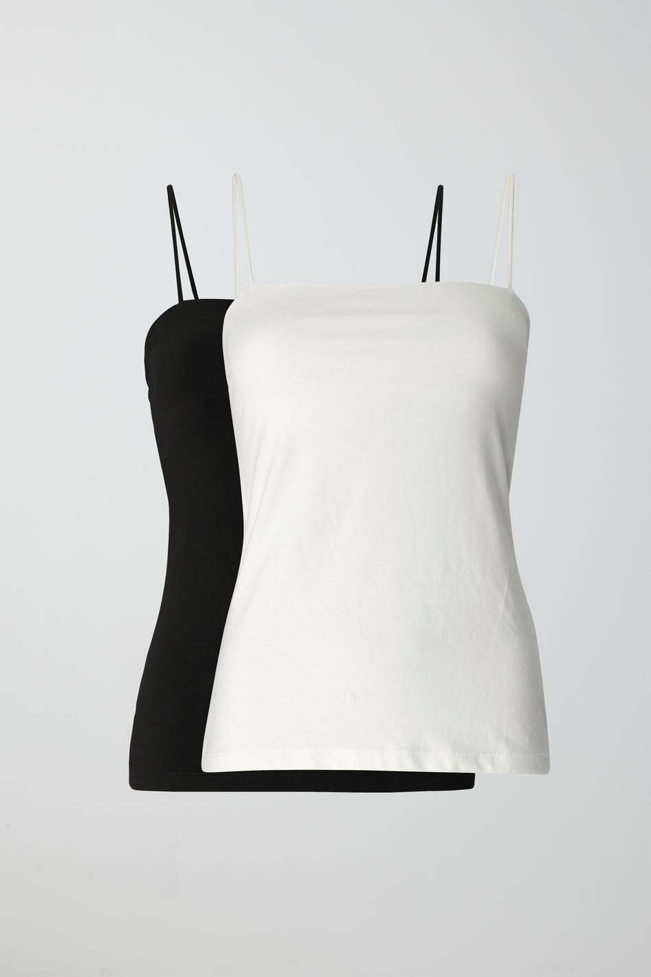 Singleter i 2-pakning med tynne skulderstropper. Singletene er svarte og hvite og har lenger passform.