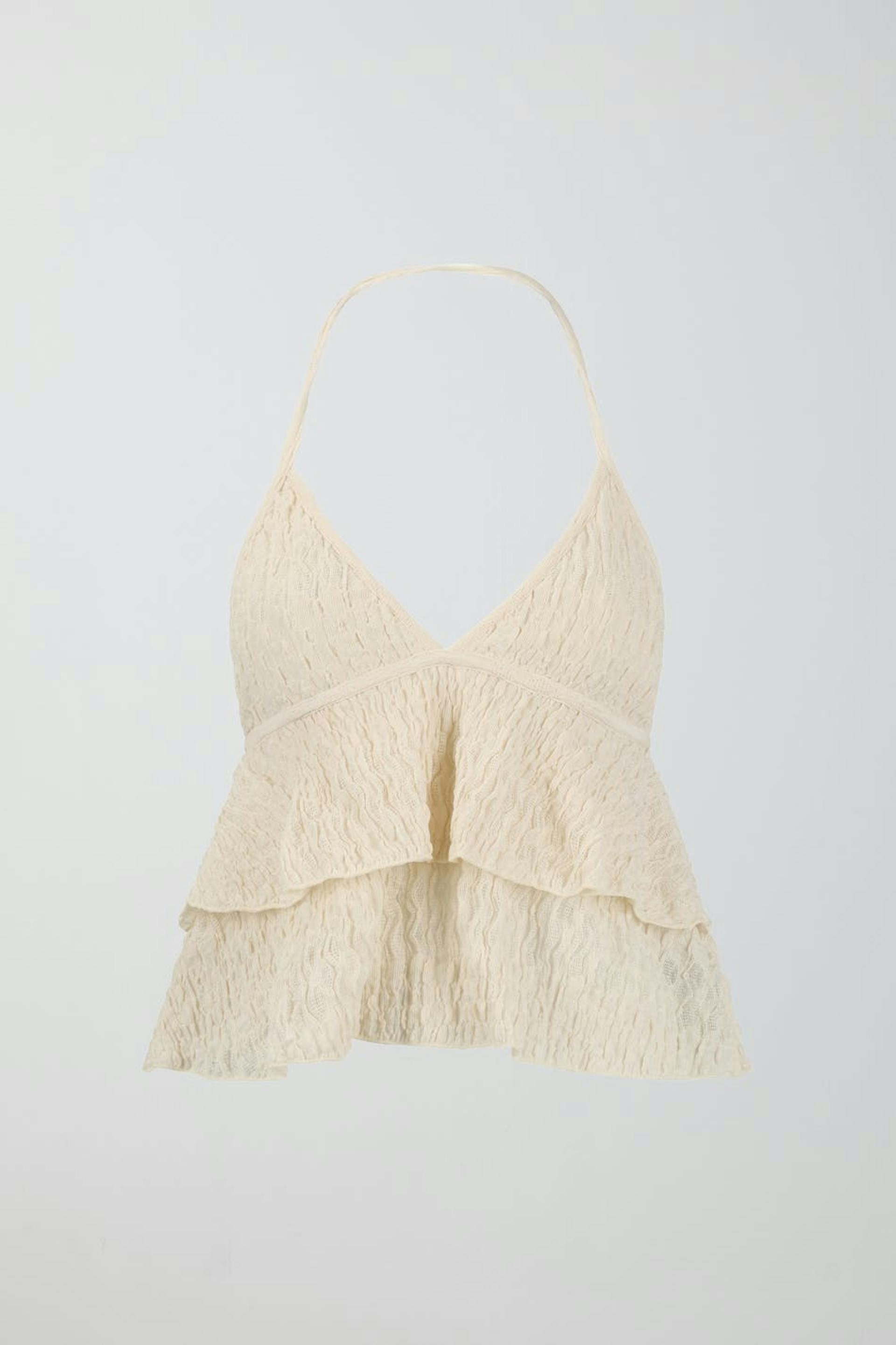 Singlet med rysjedetalj. Singleten er hvit og har en halterneck-knyting bak nakken. Den har åpen rygg og et strukturert stoff.