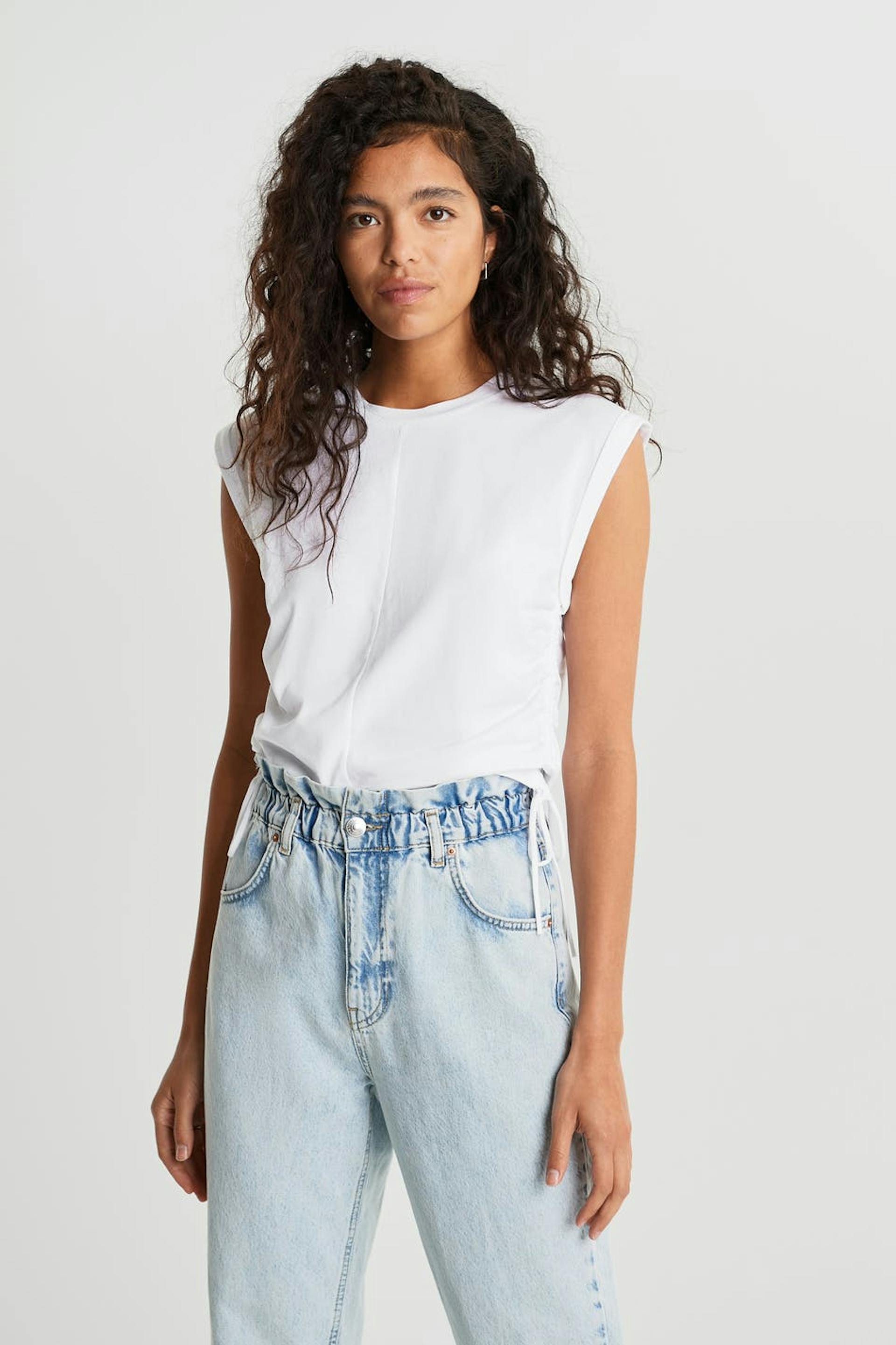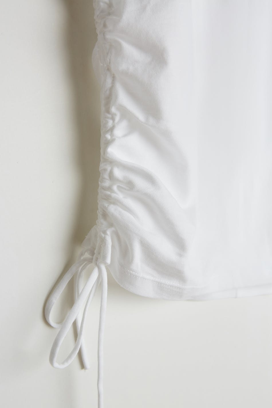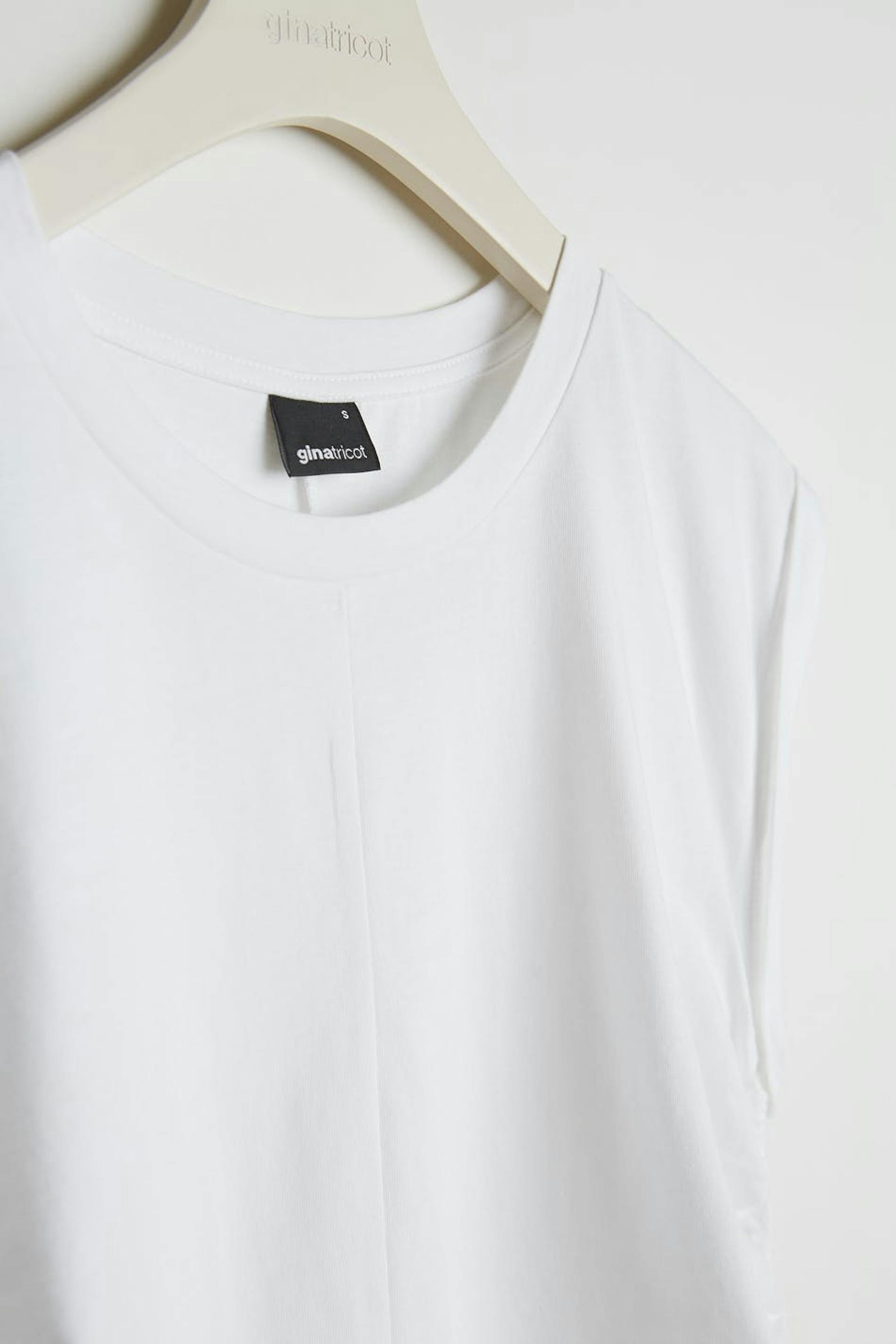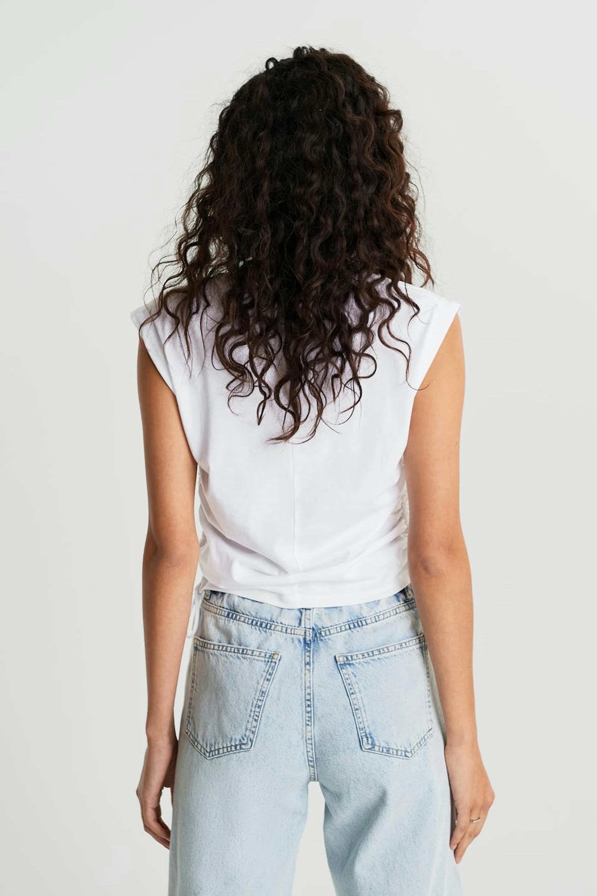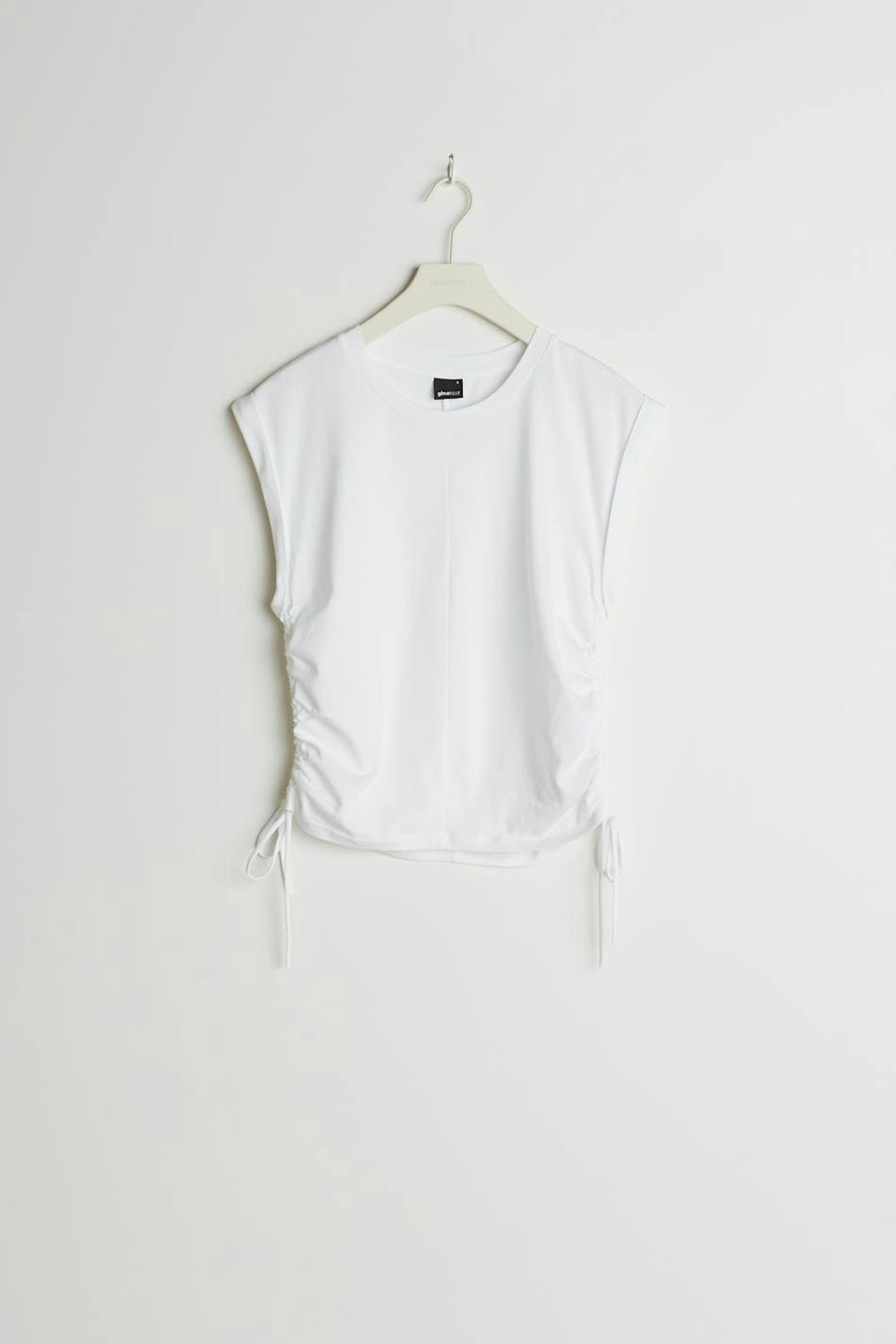 Kortere ermeløs toppen med en vanlig passform. Ermeløs topp er perfekt for festen og hvit og har detalj med snøring i sidene. Den har brettede kanter.