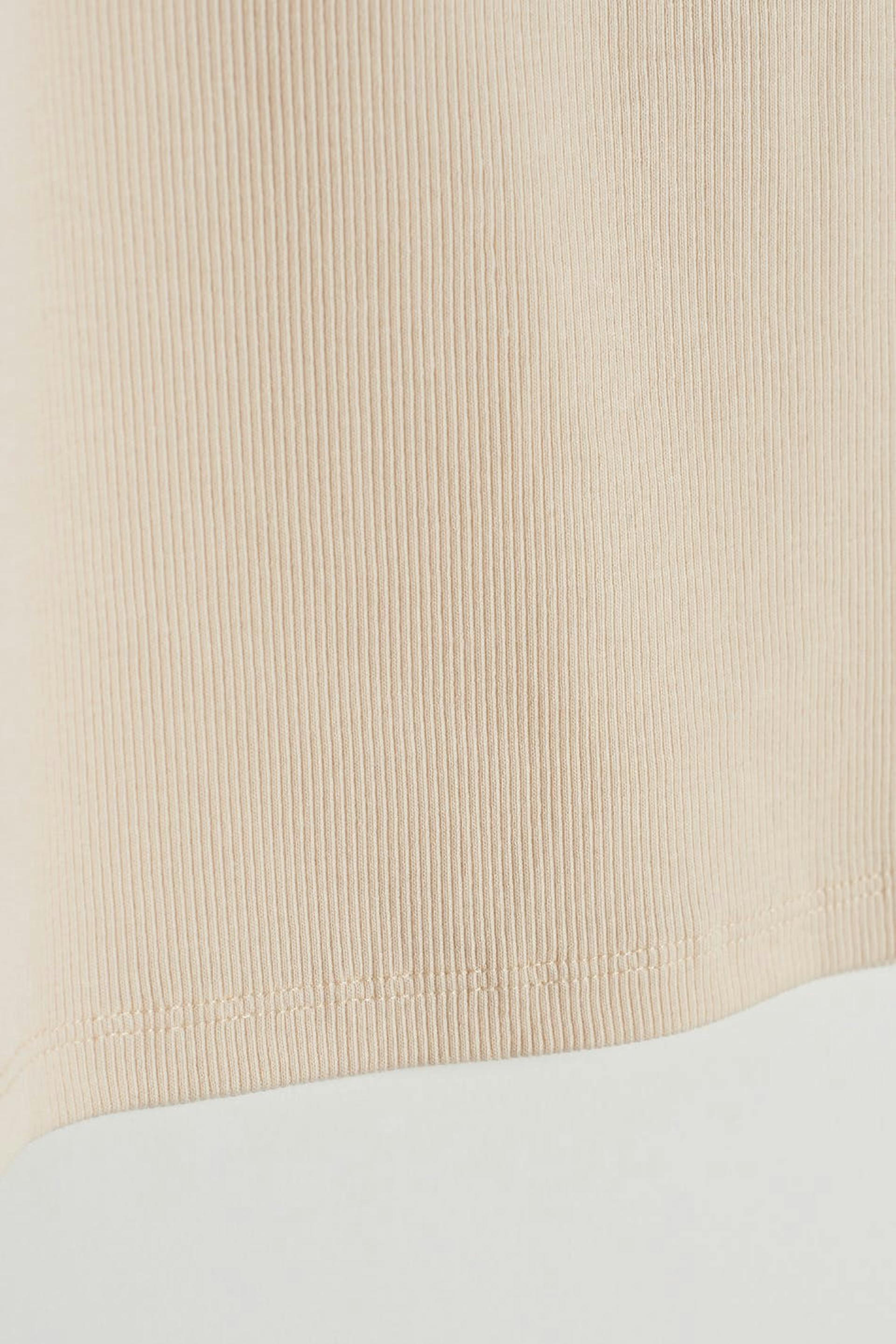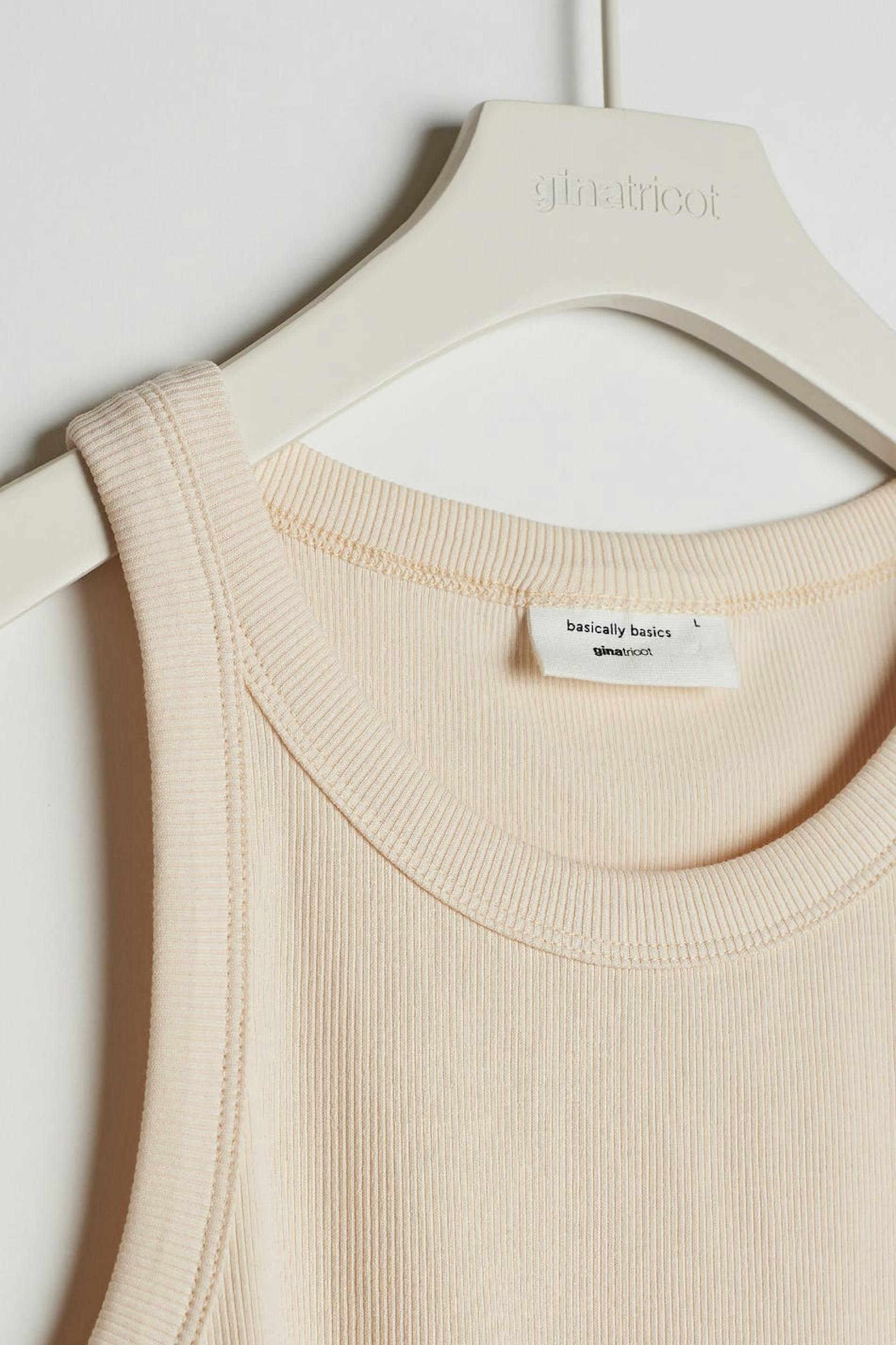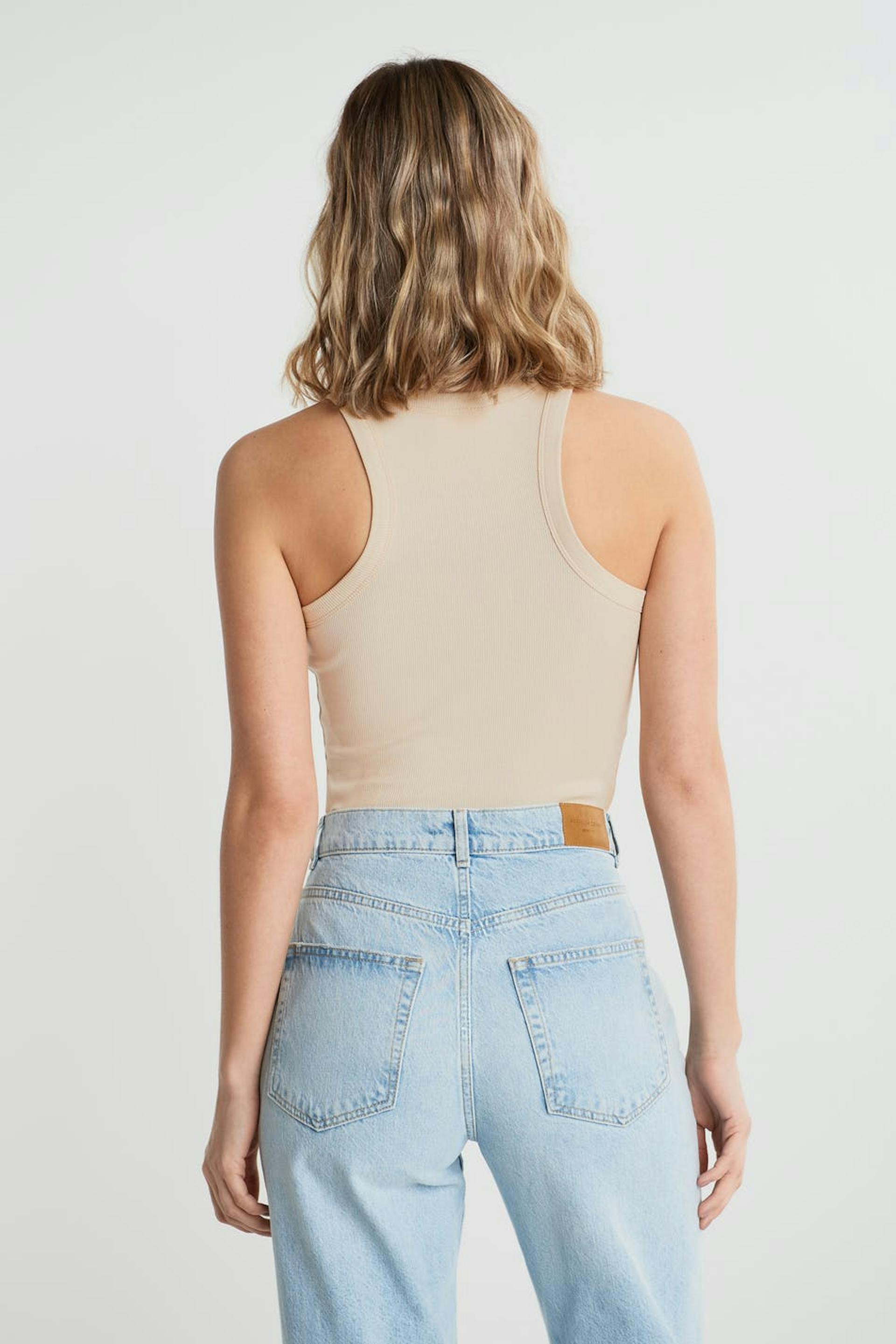 Ribbestrikket ermeløs toppen med en tilpasset passform. Ermeløs topp er beige.