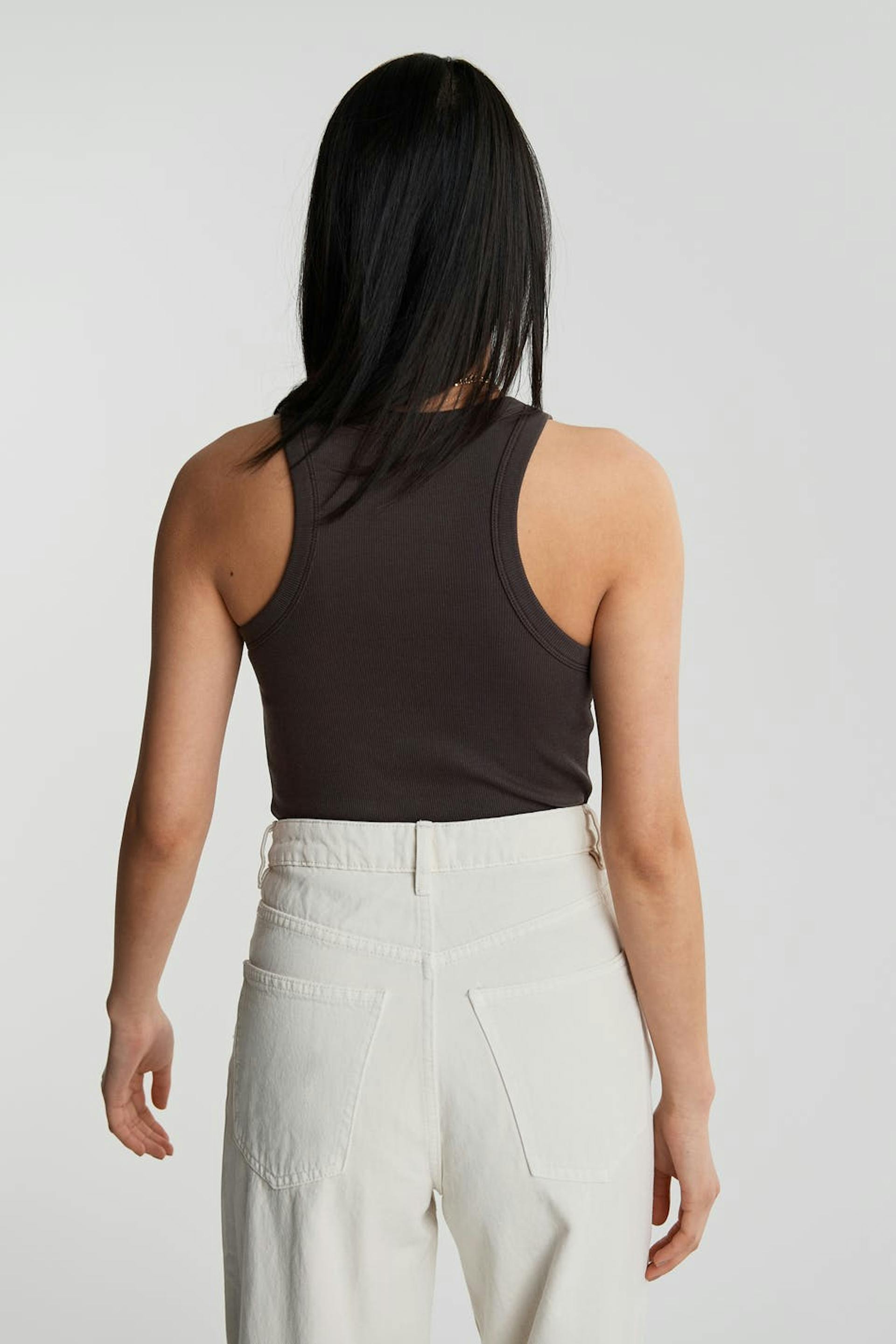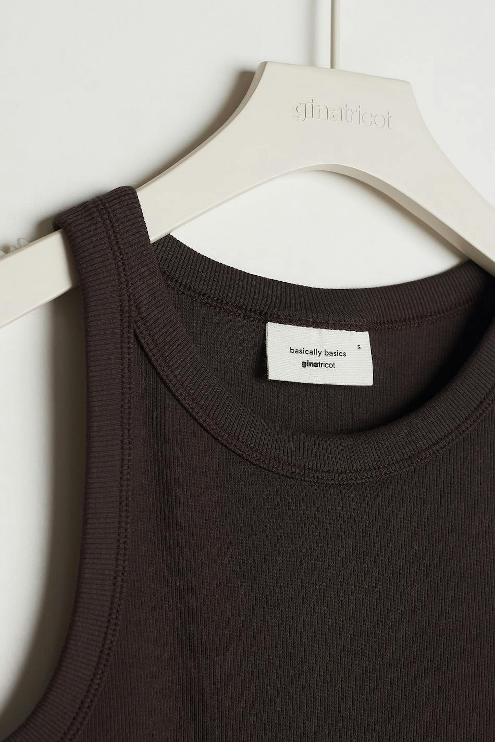 Ribbestrikket ermeløs toppen med en tilpasset passform. Ermeløs topp er brun.