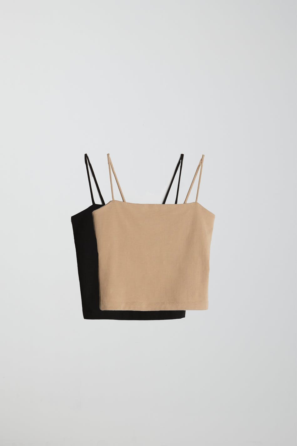 Korte undertøystopper i jersey med tynne skulderstropper. Undertøystoppene er beige og svarte og har fôret frontpanel.