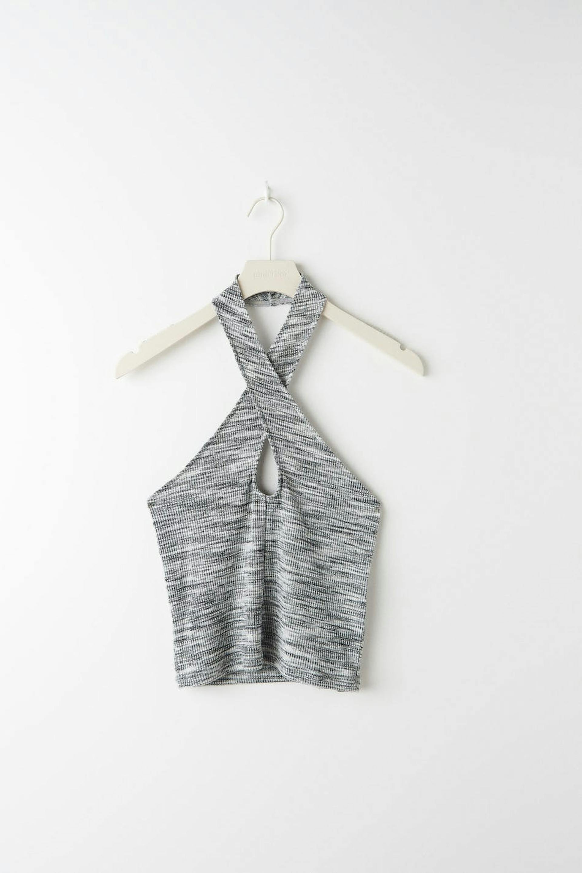 Ribbet halternecktopp med åpen rygg. Toppen er svart og har en avkortet lengde. Den har en tilpasset passform og kryssende halterneck-stropper foran med nøkkelhulsåpning.