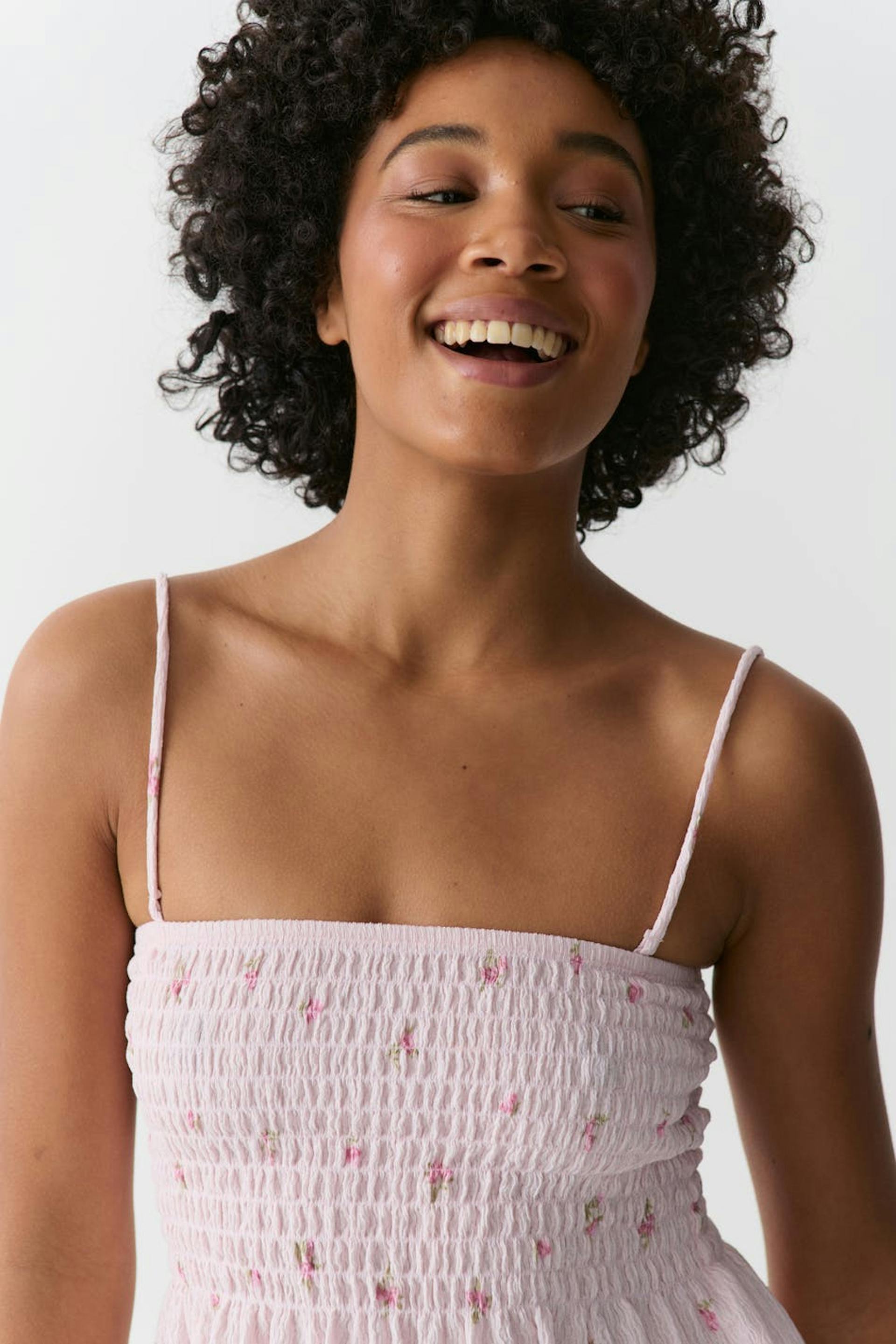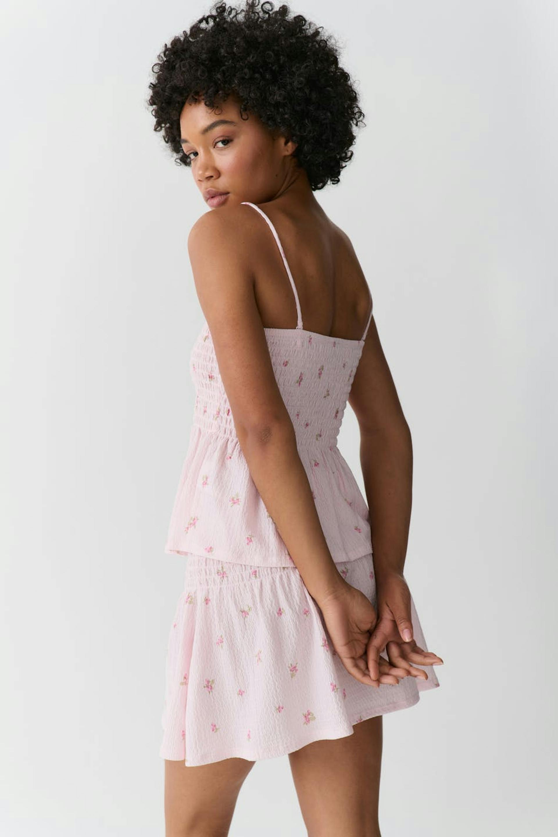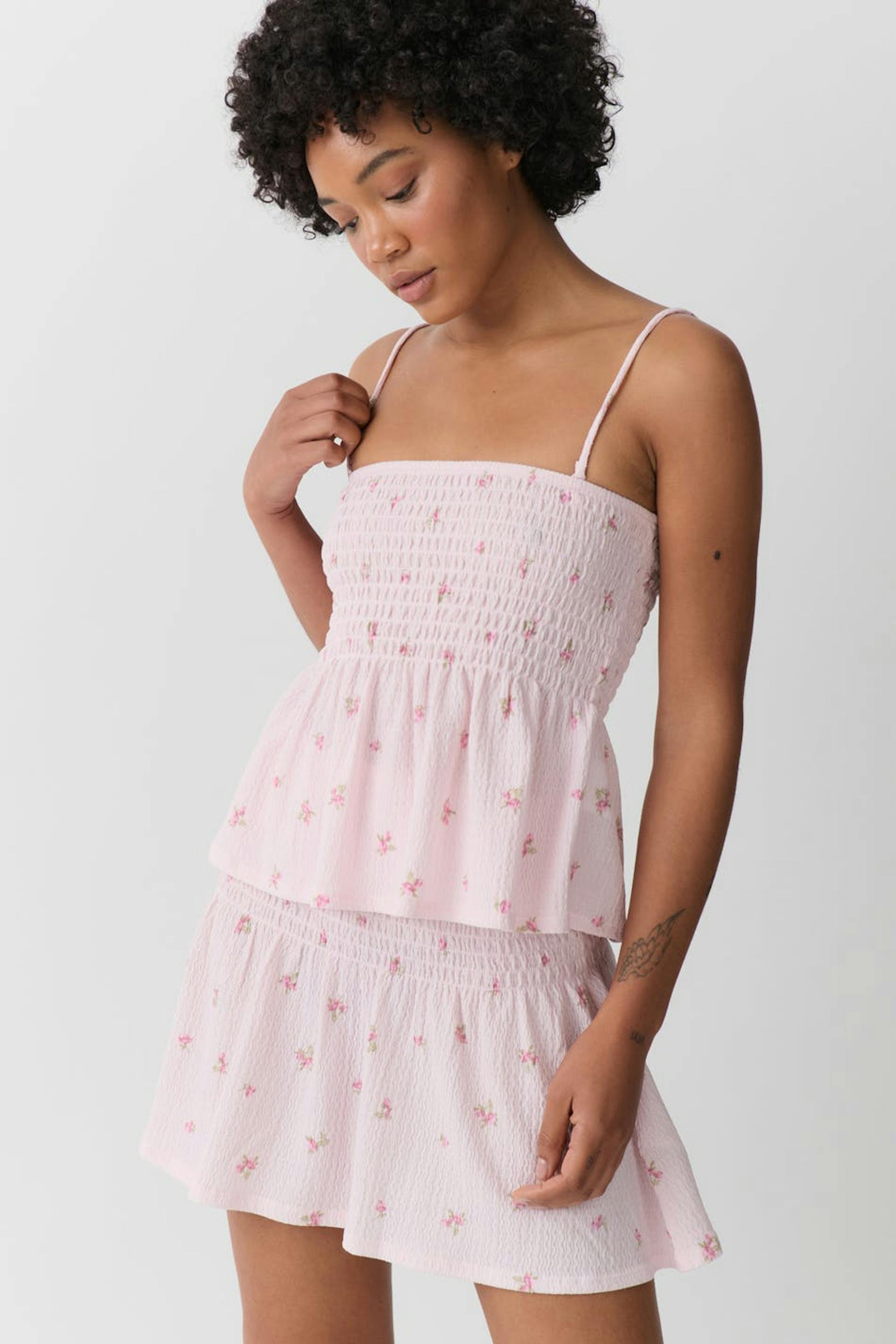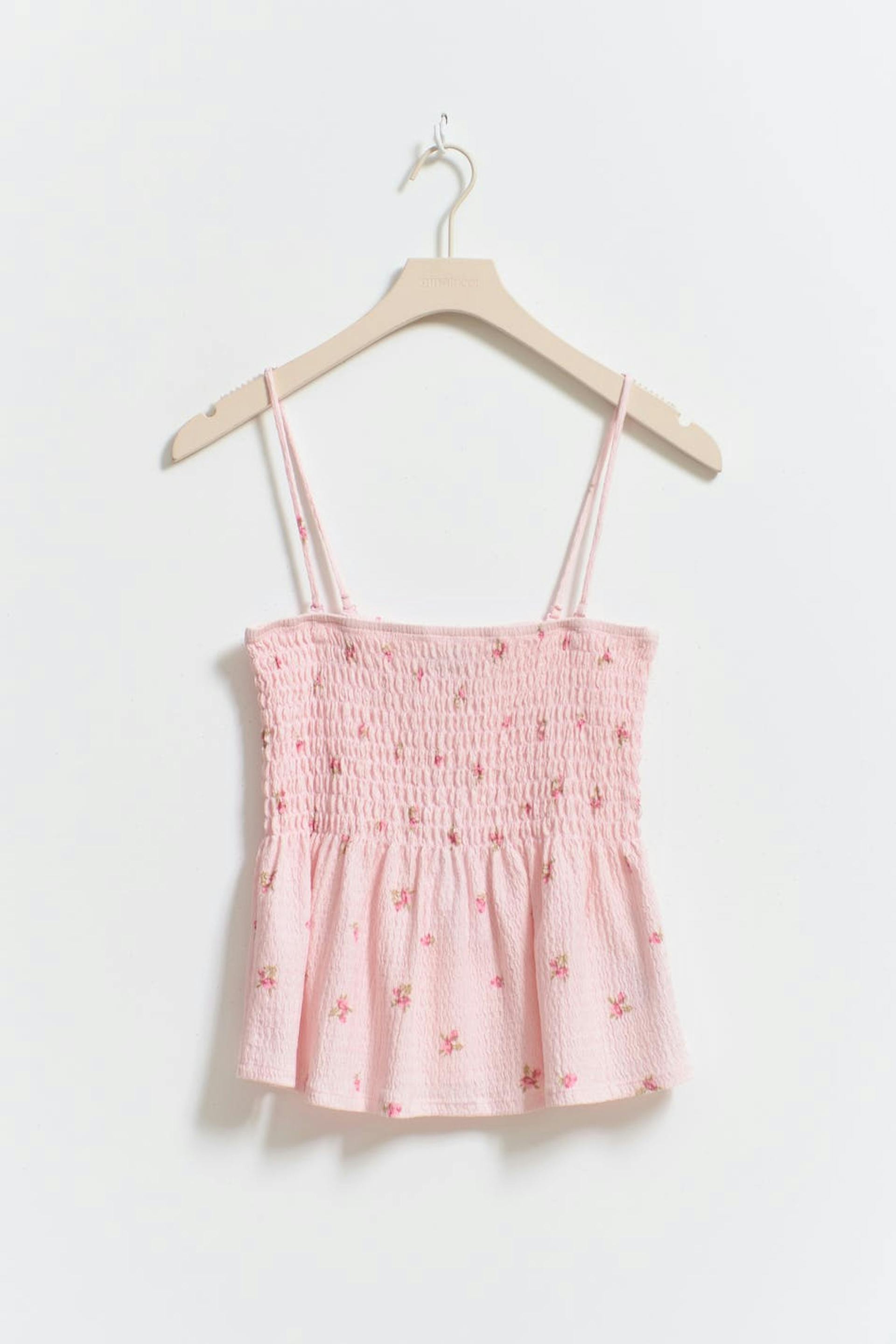 Blomstret singlet i jersey med vaffelsøm på toppen. Singleten er rosa og har tynne, avtakbare skulderstropper. Den har strukturert materiale, utsvingt fald og kort lengde.