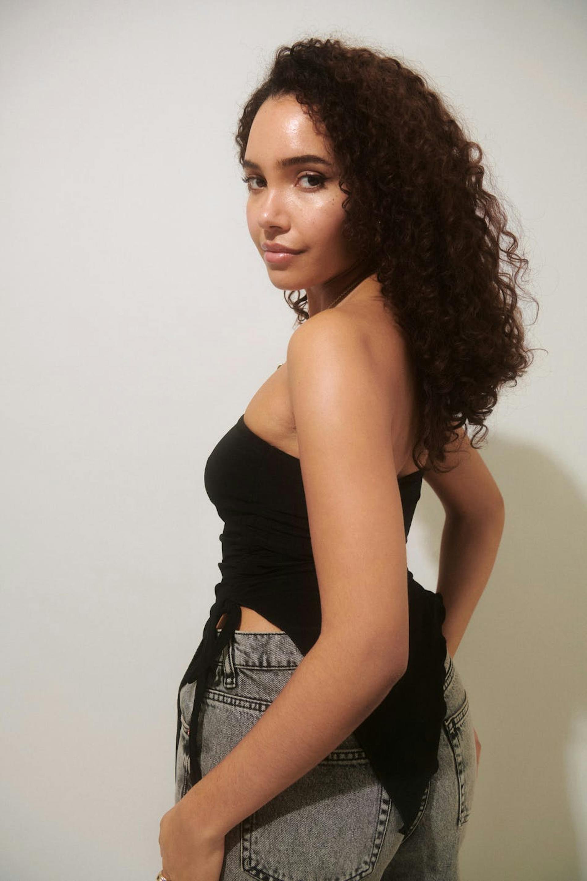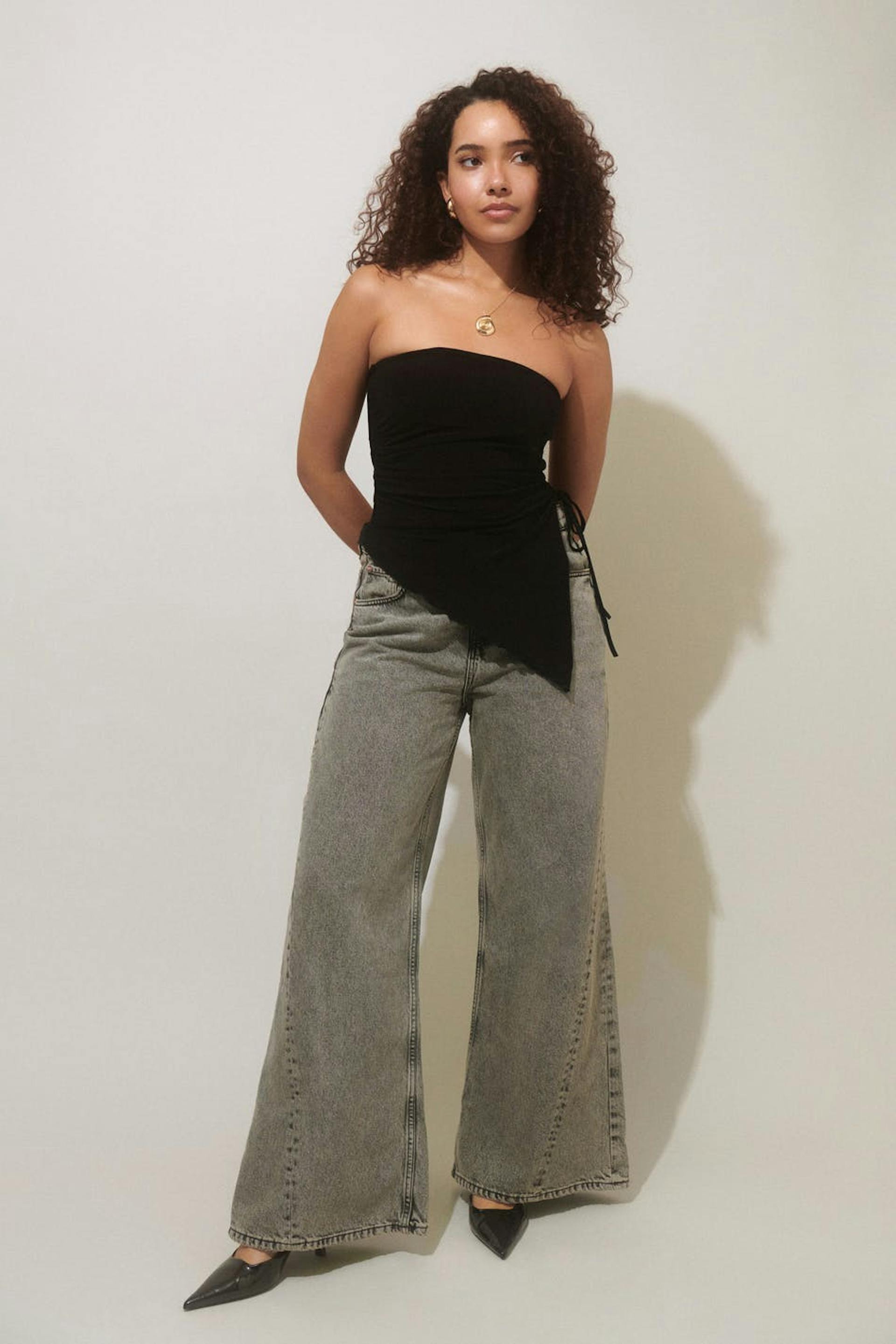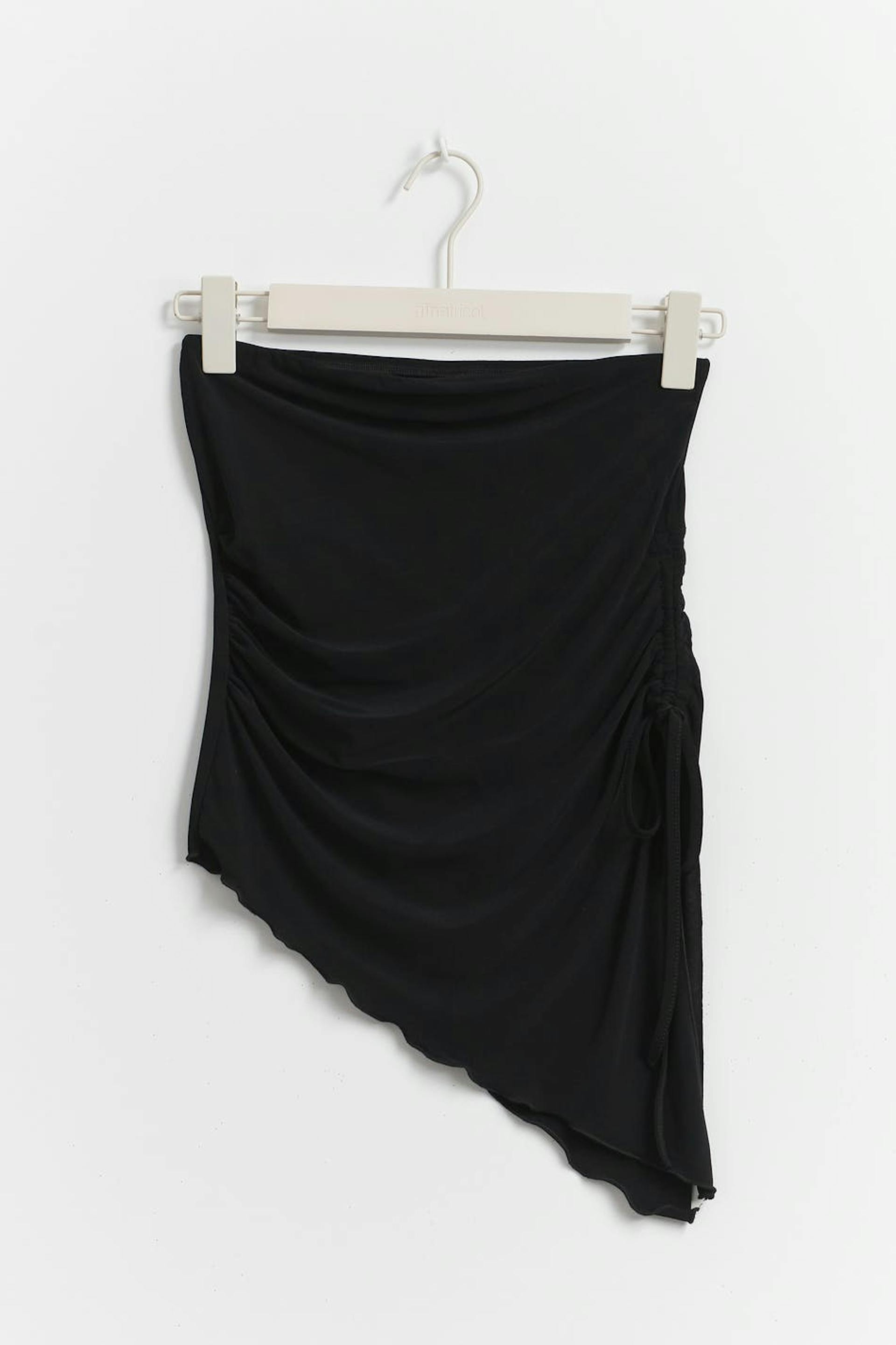 Asymmetrisk singlet med en rynket sidesøm. Singleten er perfekt for festen og svart og har et stretch. Den er perfekt for festen.
