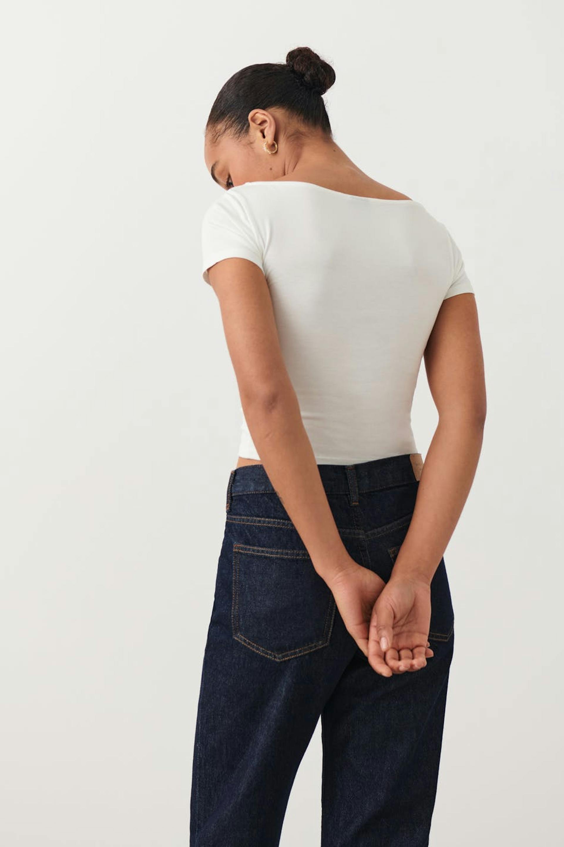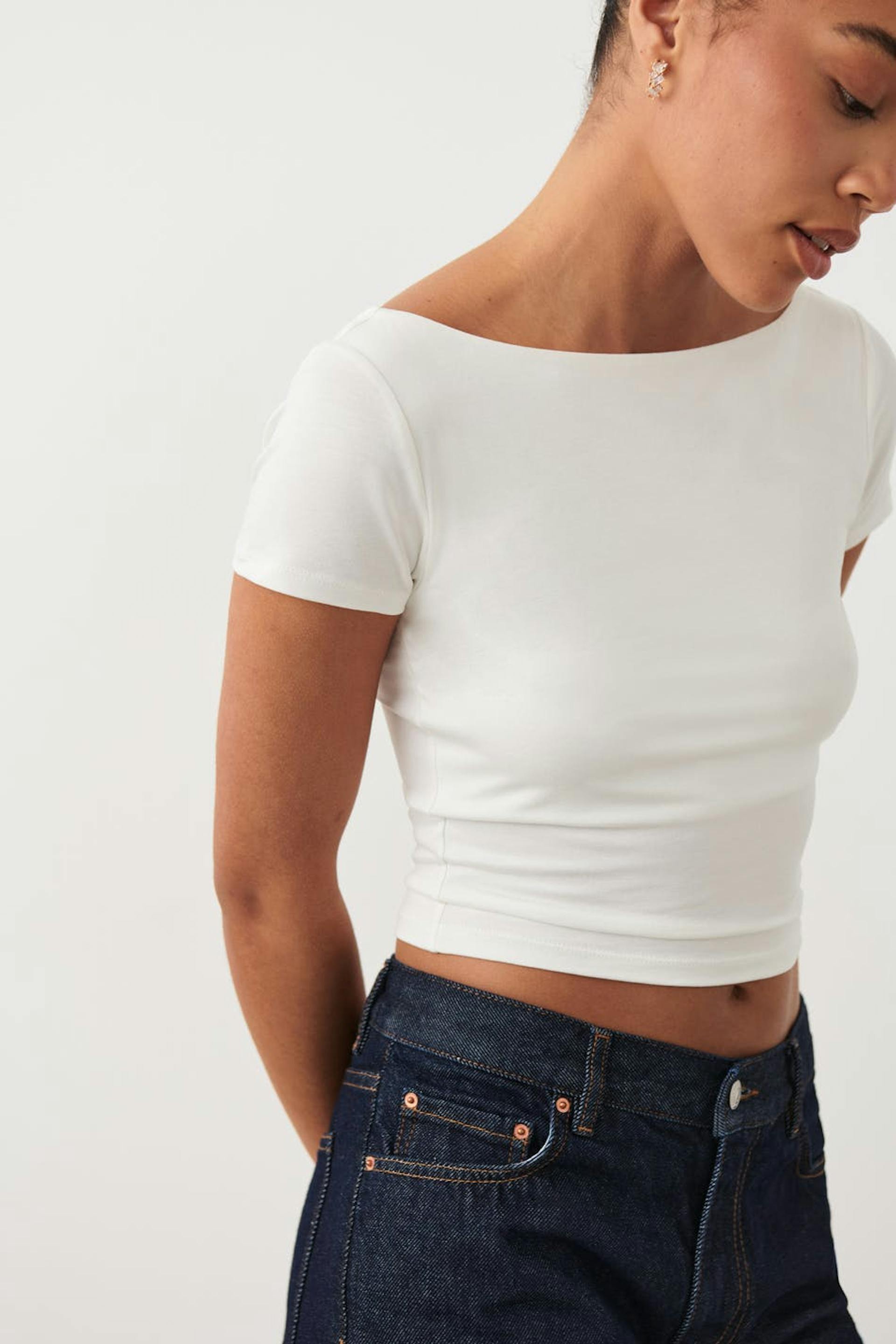 Soft touch – second skin comfort. Kortermet topp i myk viskose med båtutringning. Toppen er hvit og har avkortet lengde.