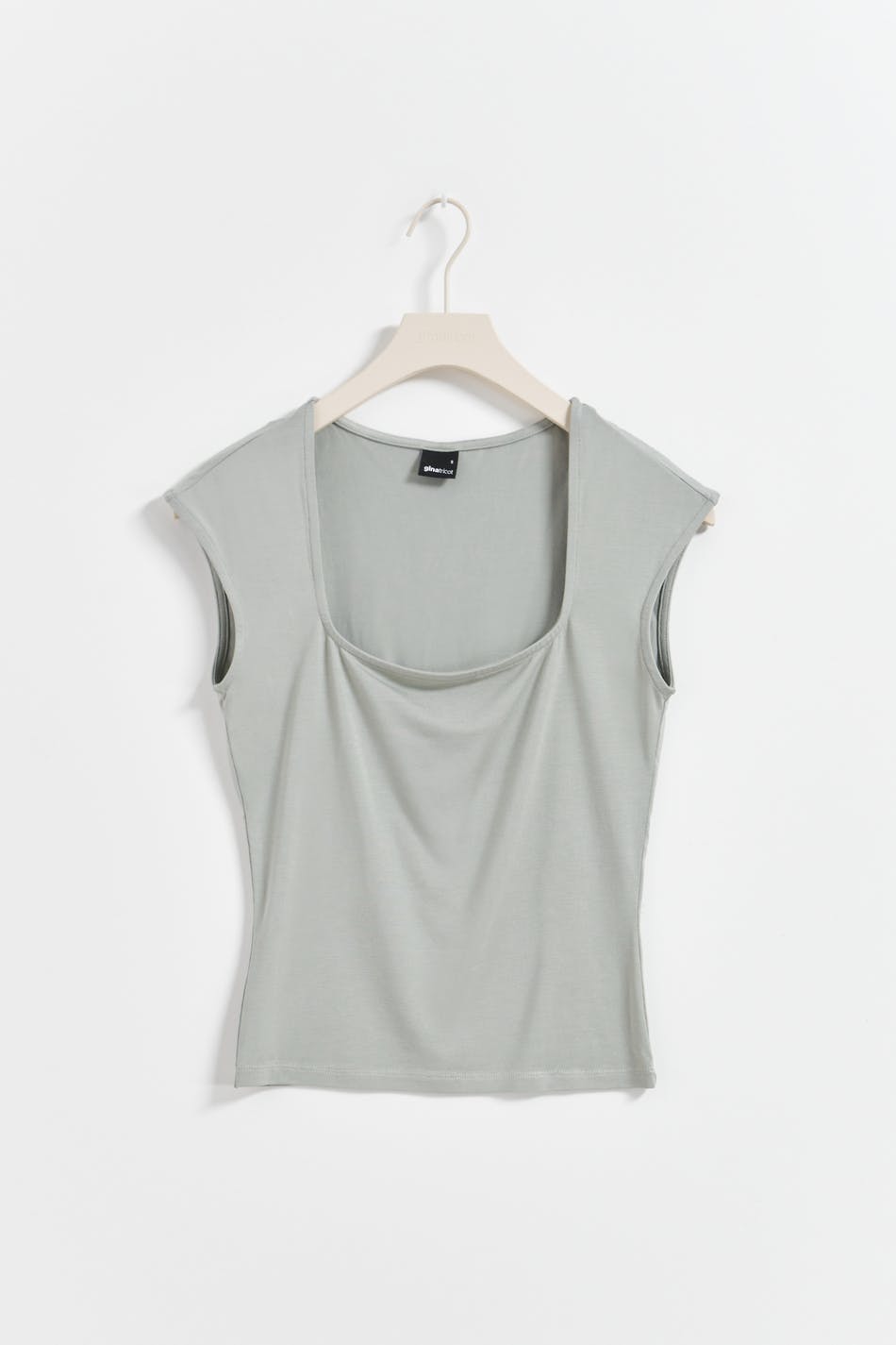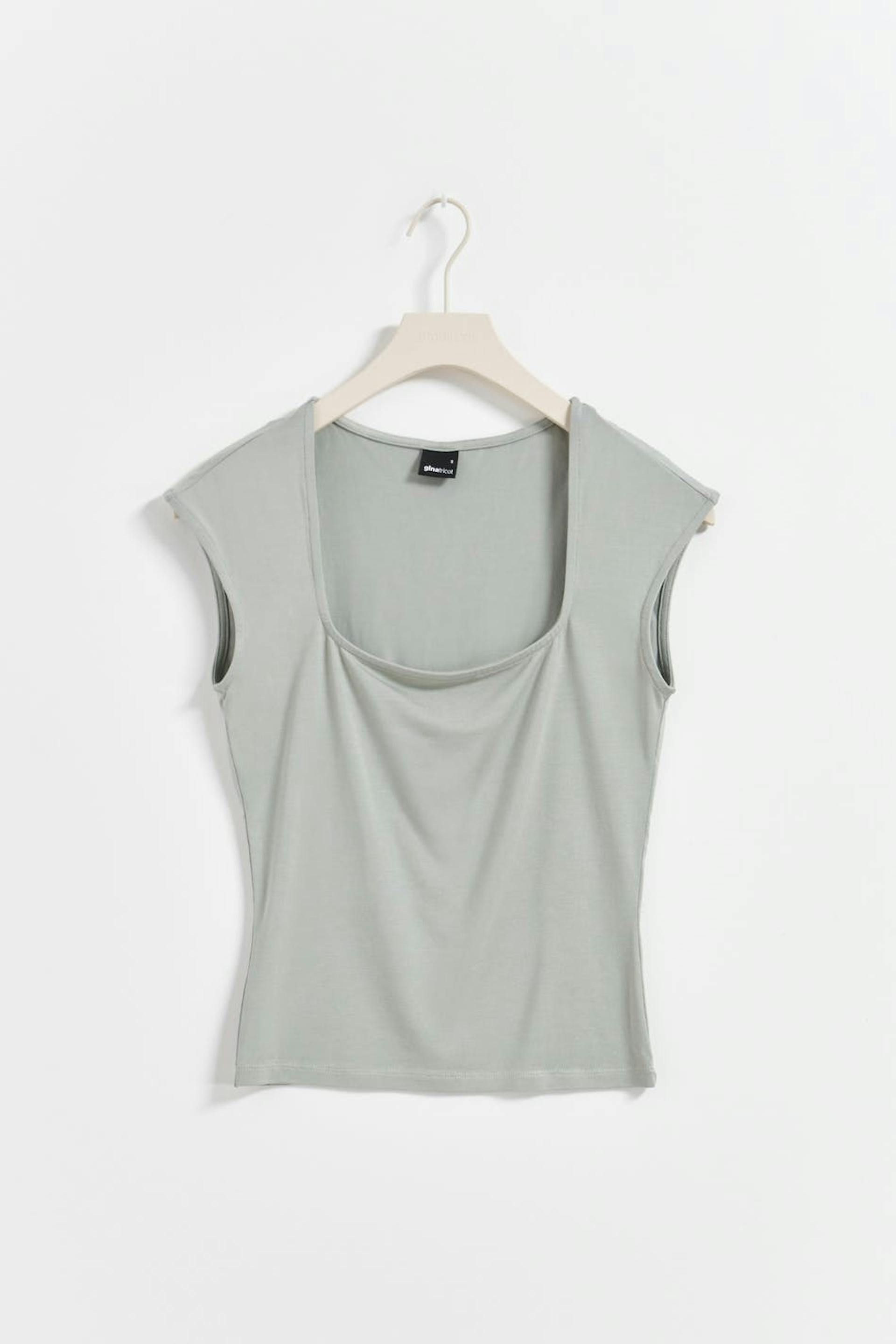 Soft touch – second skin comfort. Kortermet topp i myk viskose med firkantet hals. Toppen er grå og har figurnær passform.