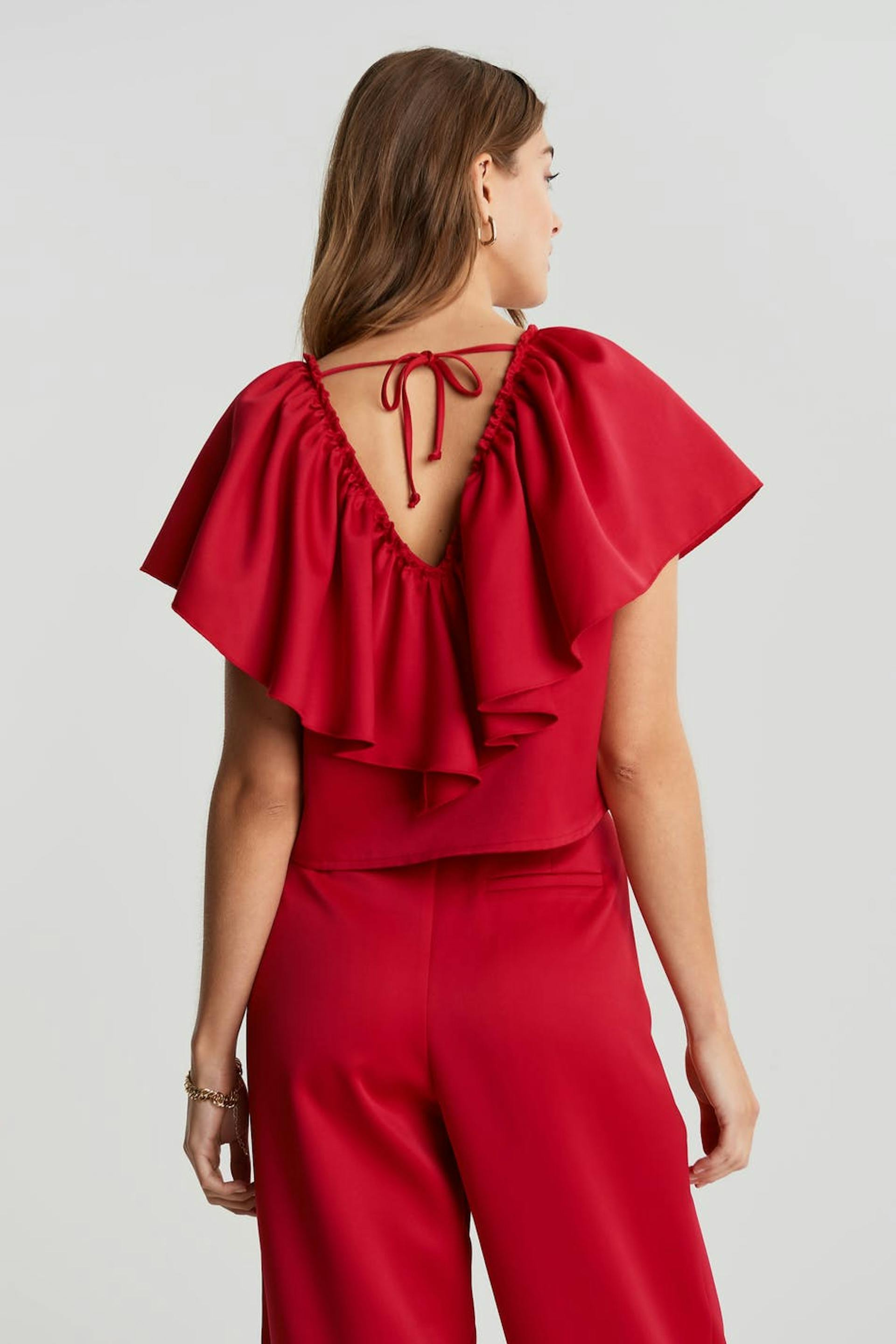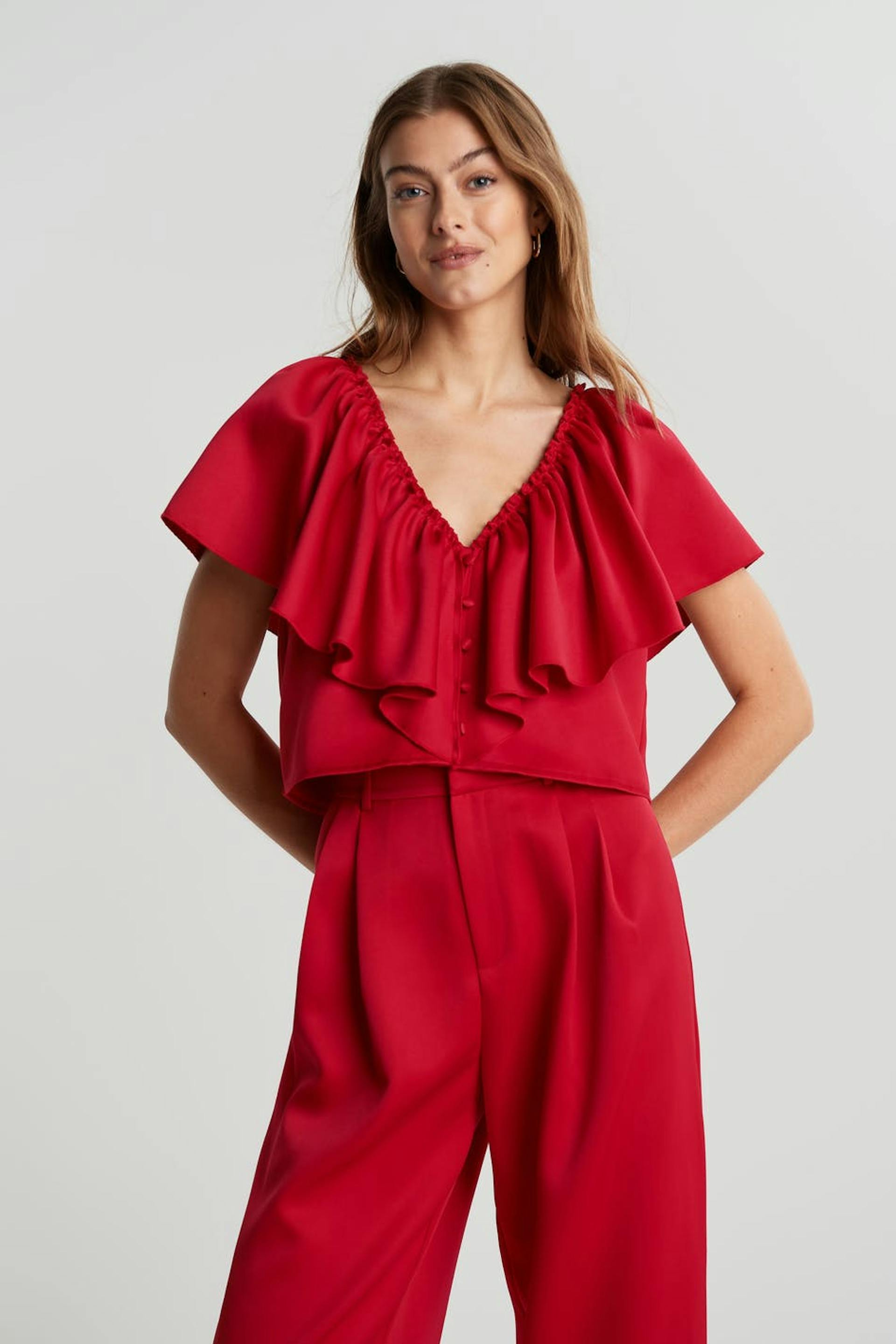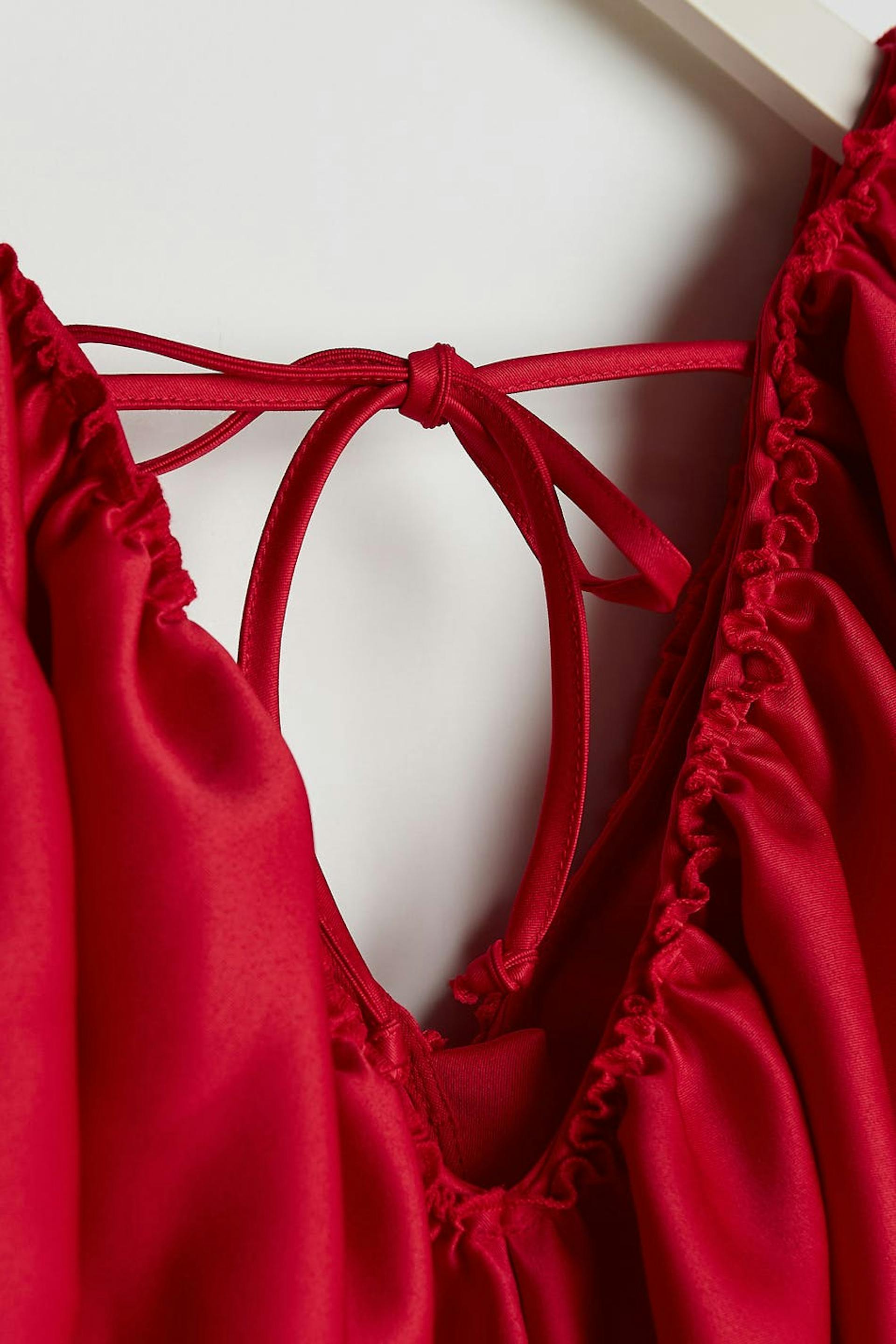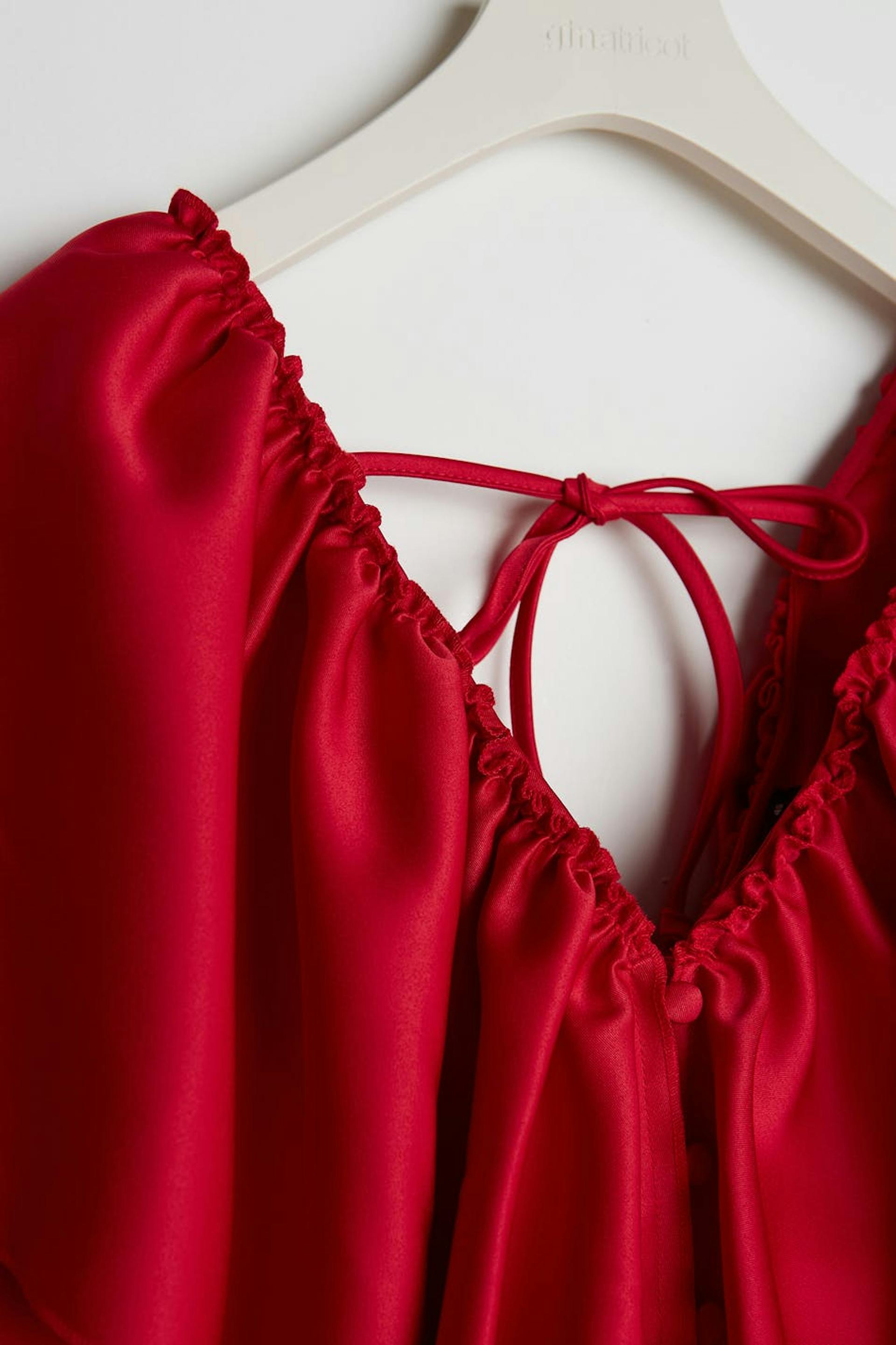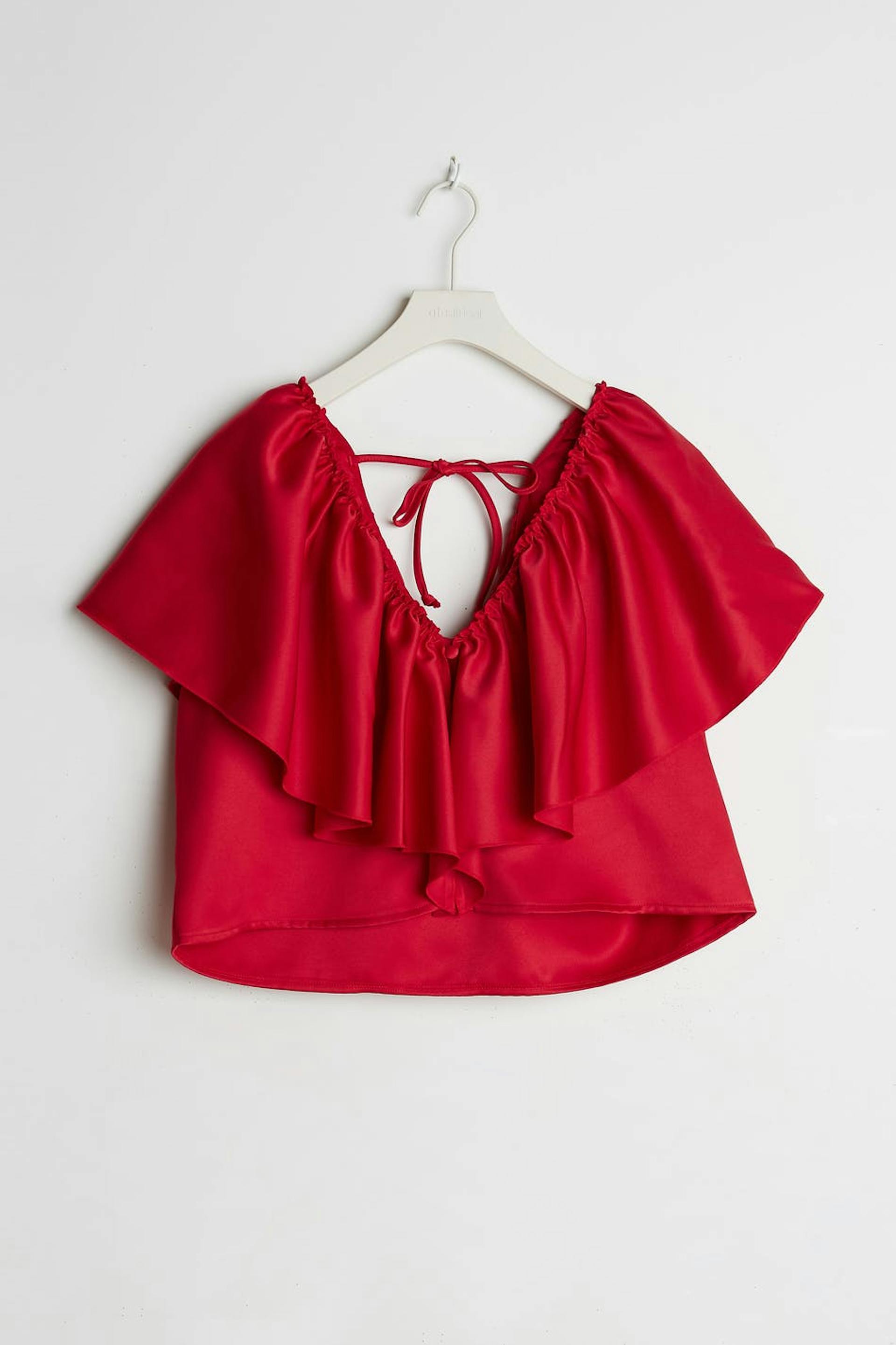 Kortermet topp med en volang på toppen. Toppen er rød og har knapper foran. Den er laget av sateng og har en knytbar stropp i ryggen og en v-hals.