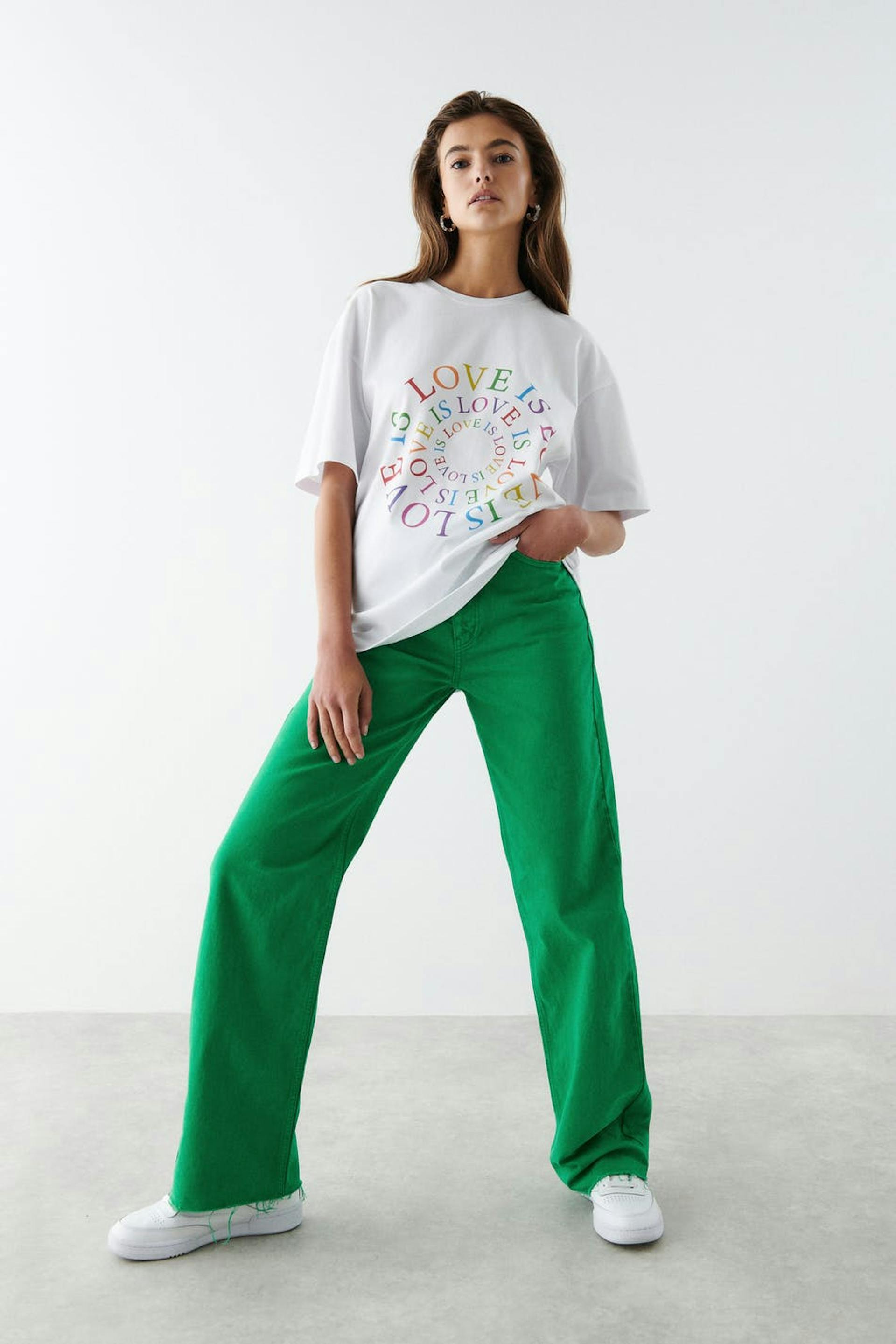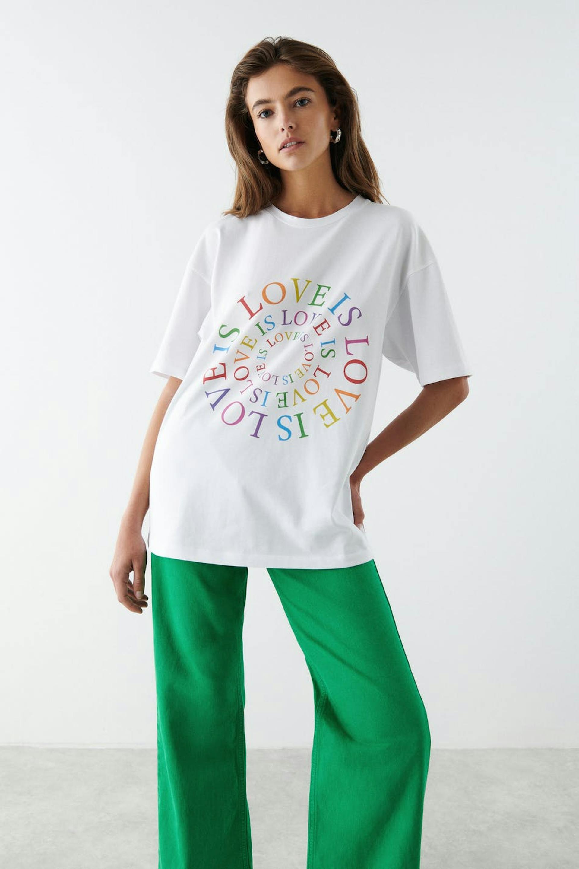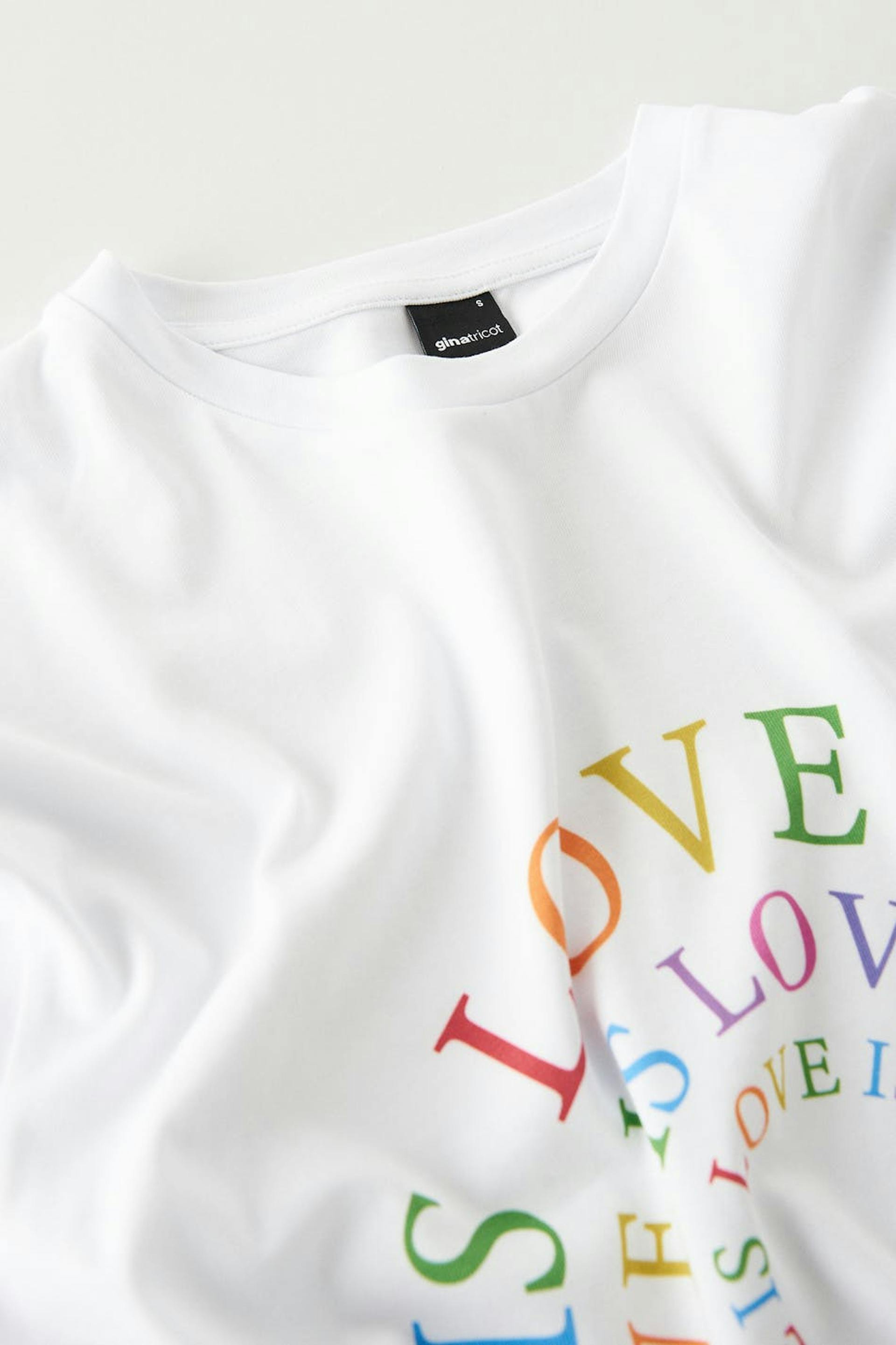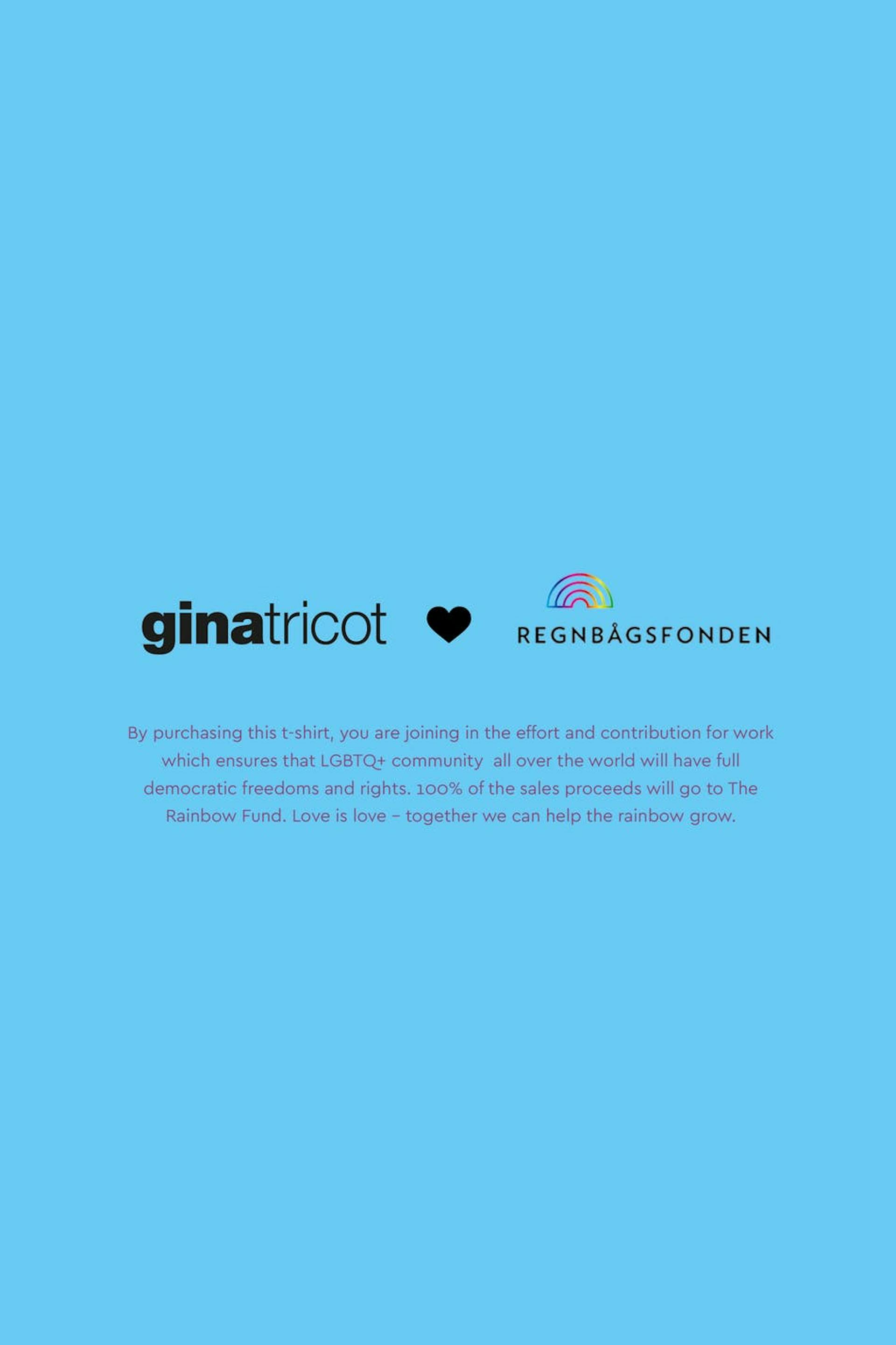 Regnbågsfonden X Gina Tricot. Unisex t-skjorte i myk jersey med en oversized passform. T-skjorten er hvit og har tekstutskrift foran. Den har en rund, ribbet hals og korte ermer. Gjennom å handle t-skjorten er du med og bidrar til The Rainbow Funds arbeid for å sikre at LHBT-personer over hele verden har fullstendige menneskelige friheter og demokratiske rettigheter. 100 % av salget går uavkortet til The Rainbow Fund. Love is love – sammen hjelper vi regnbuen å vokse.