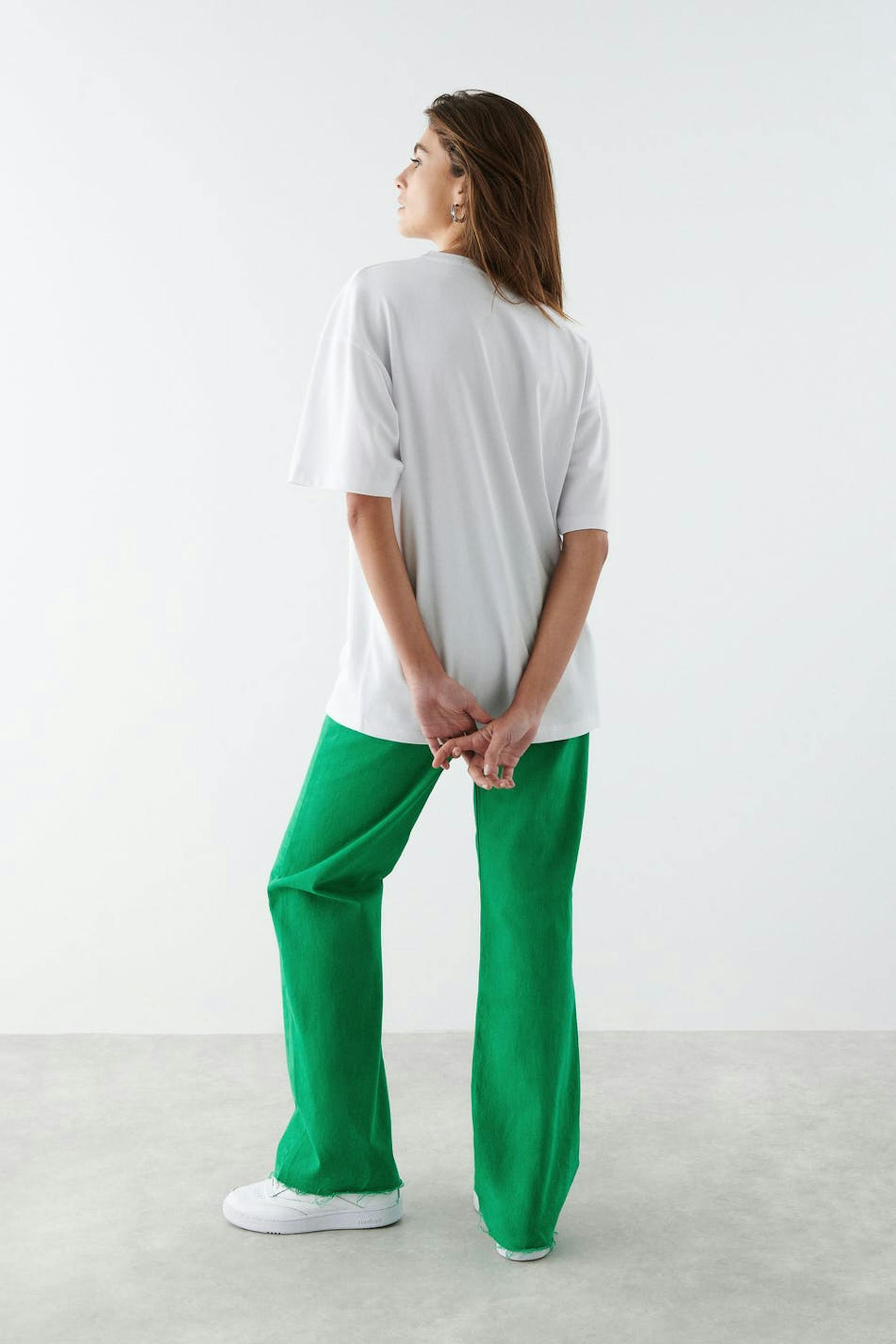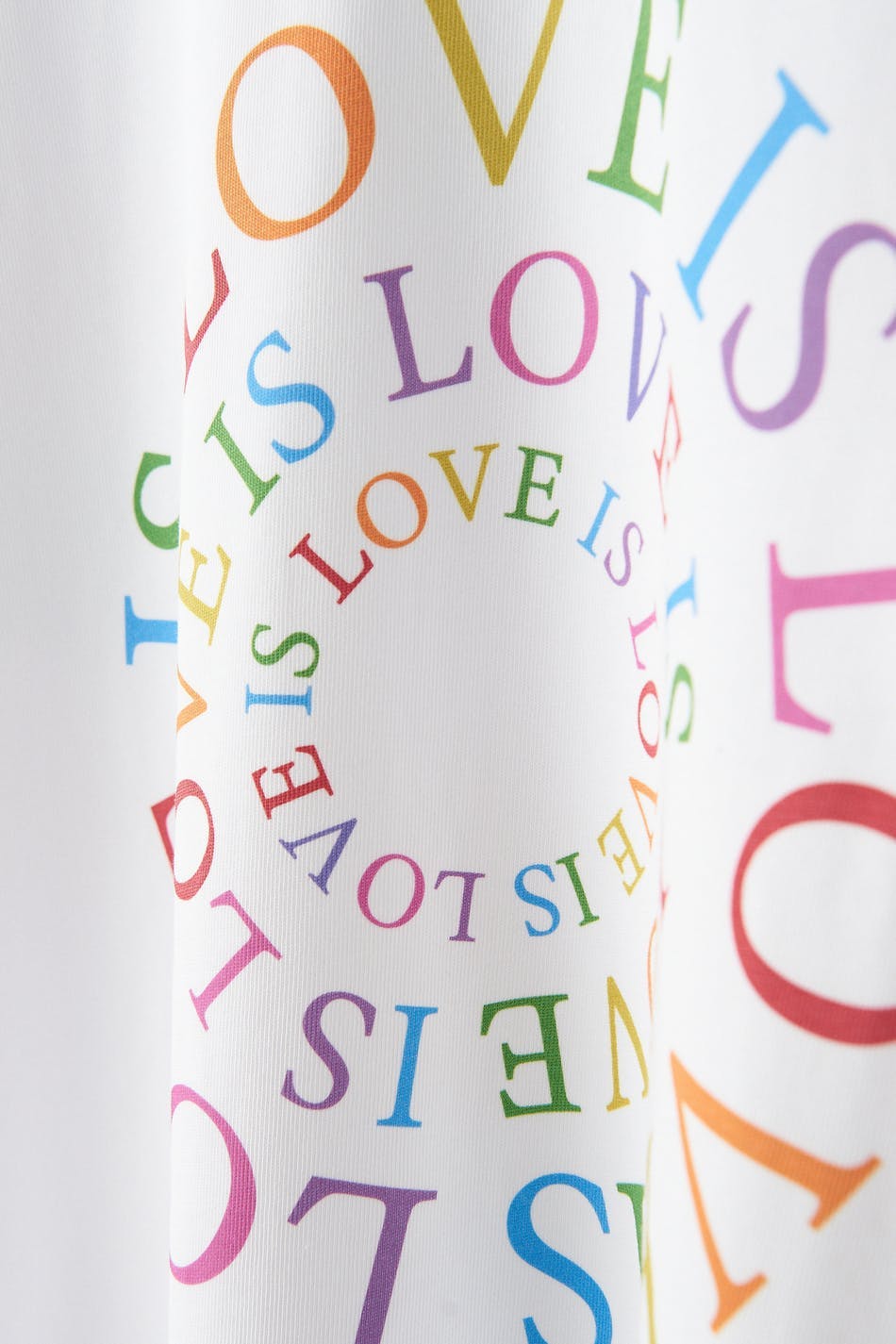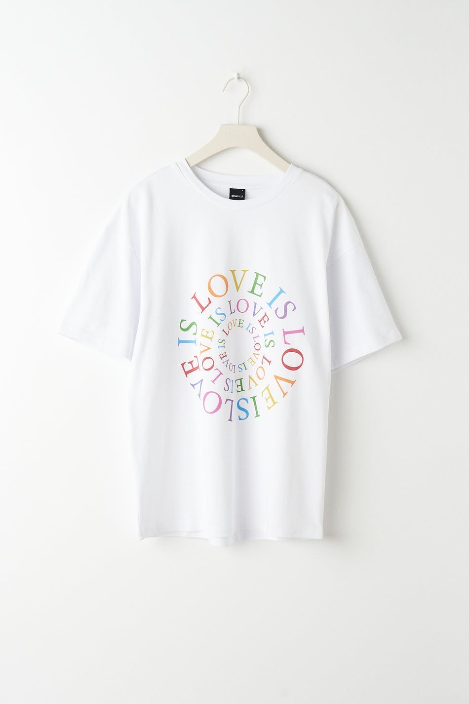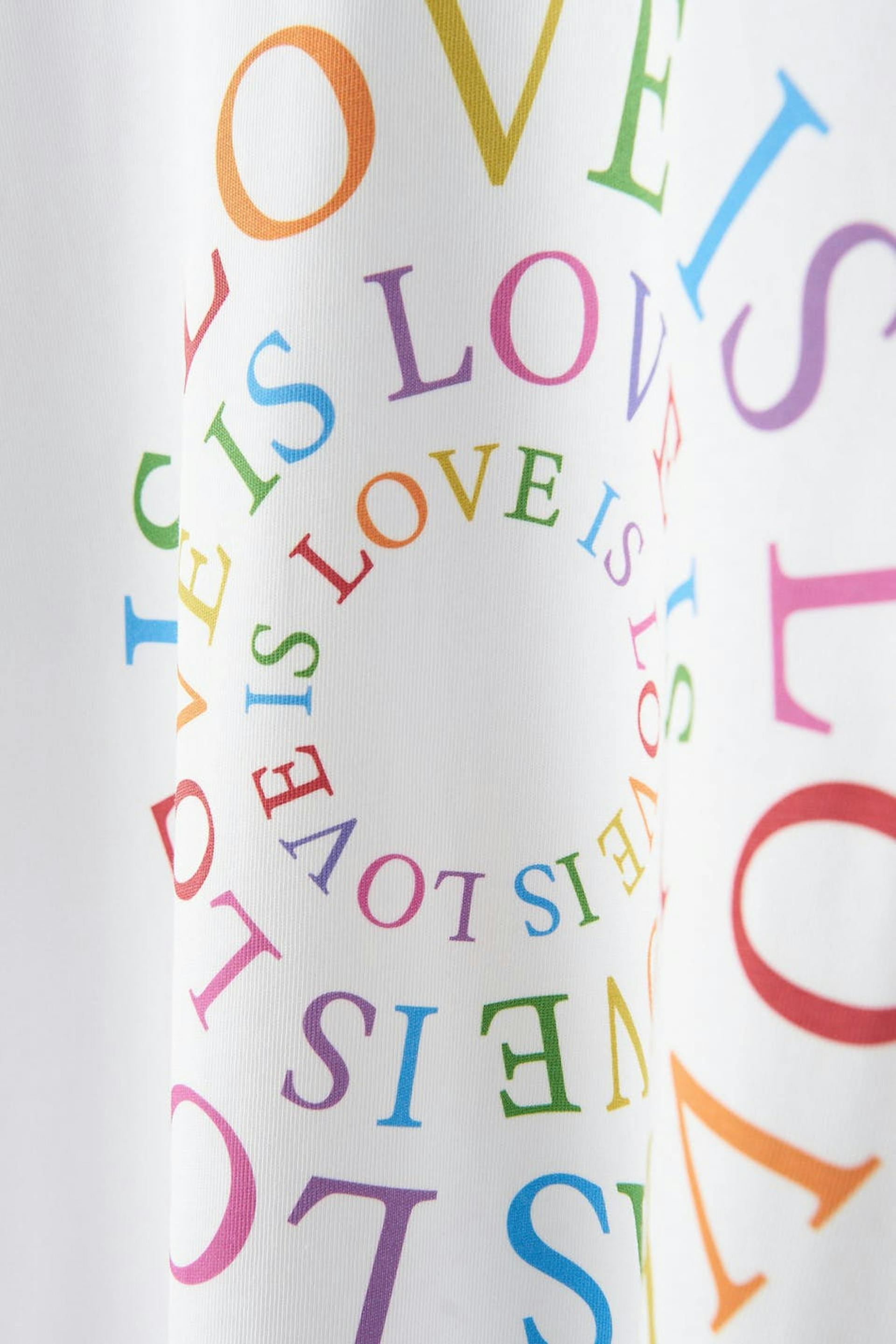 Regnbågsfonden X Gina Tricot. Unisex t-skjorte i myk jersey med en oversized passform. T-skjorten er hvit og har tekstutskrift foran. Den har en rund, ribbet hals og korte ermer. Gjennom å handle t-skjorten er du med og bidrar til The Rainbow Funds arbeid for å sikre at LHBT-personer over hele verden har fullstendige menneskelige friheter og demokratiske rettigheter. 100 % av salget går uavkortet til The Rainbow Fund. Love is love – sammen hjelper vi regnbuen å vokse.