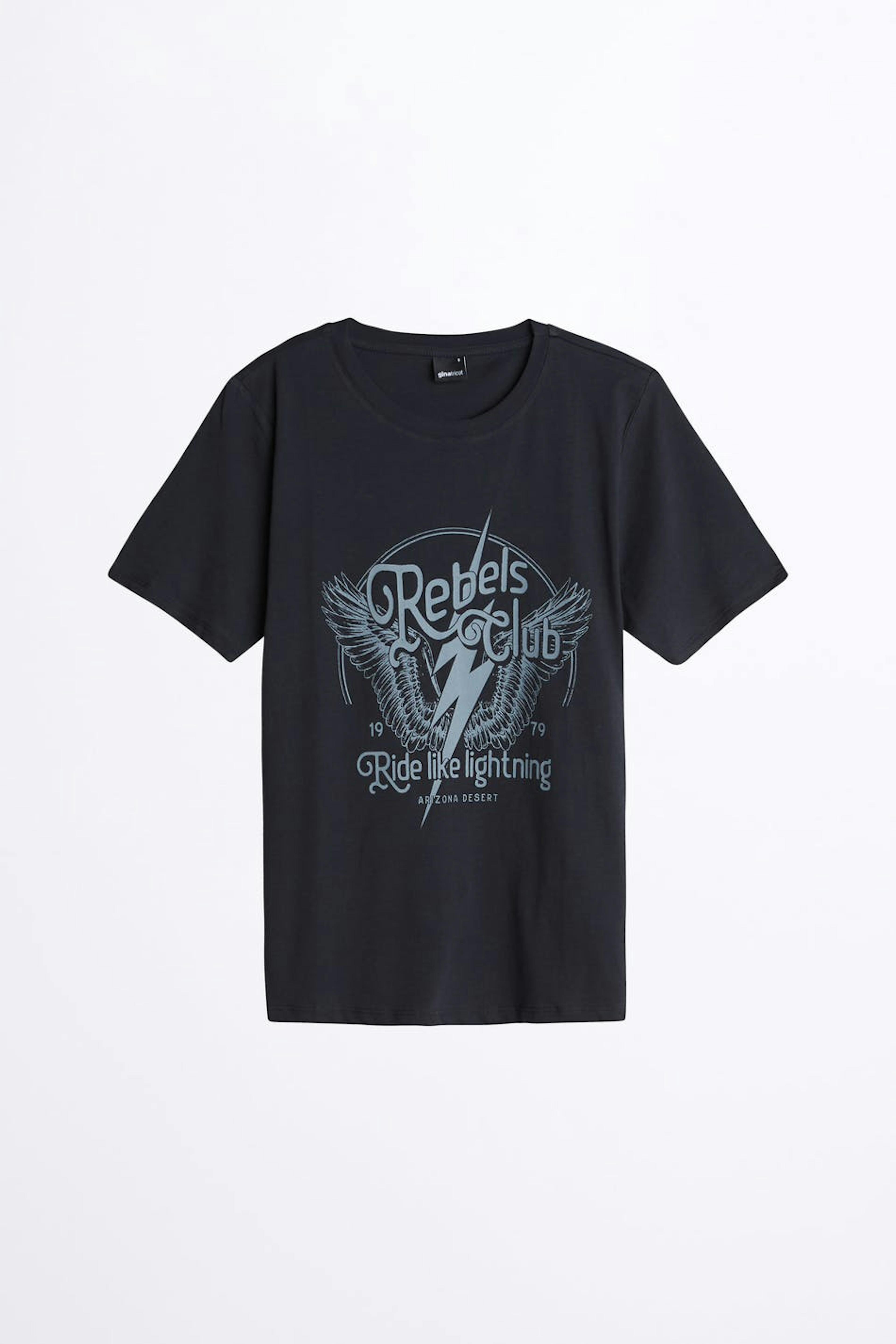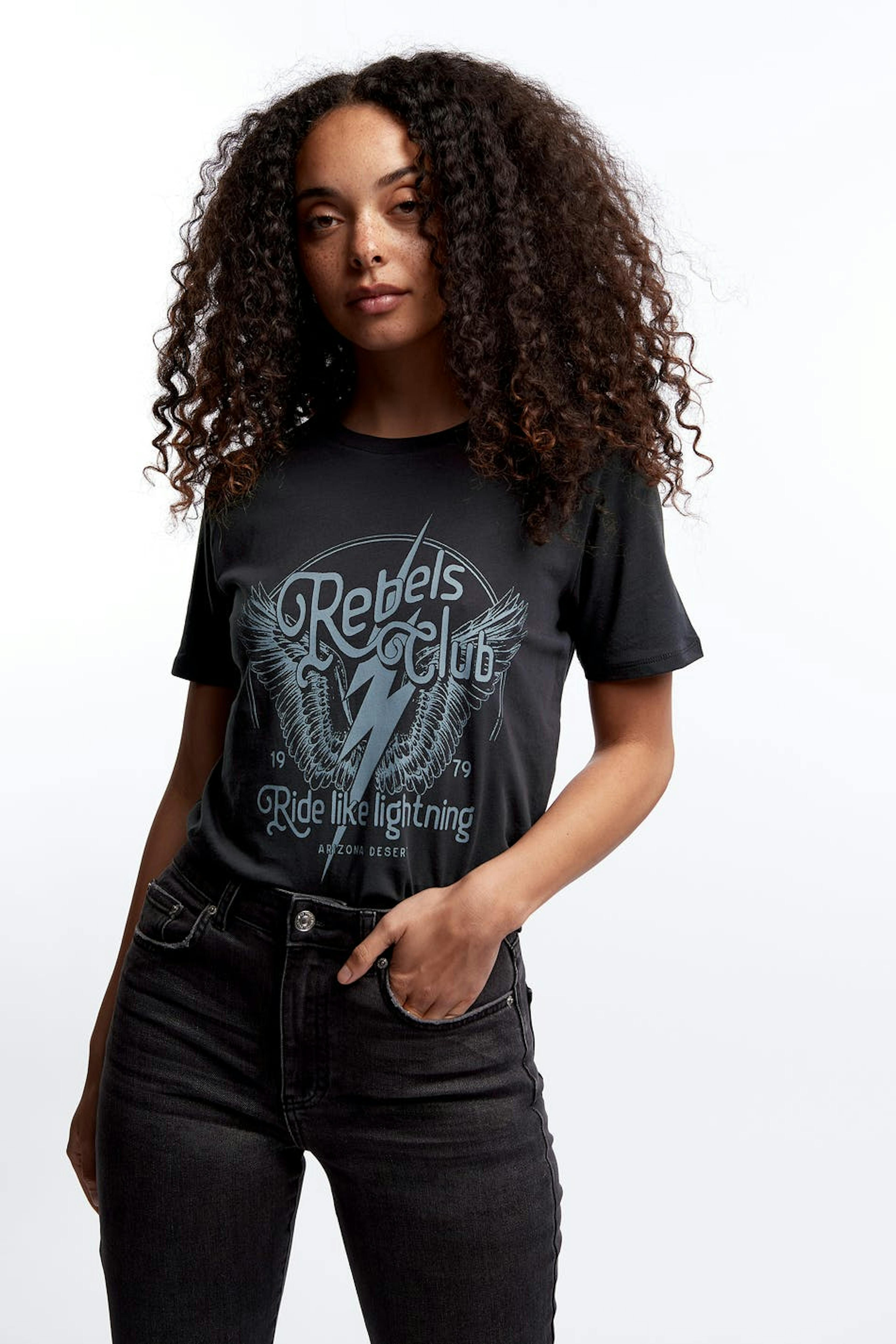 T-skjorte med en vanlig passform. T-skjorten er svart og har en rund halsringning. Den har en smal ribbet mansjett og et trykk på framsiden.