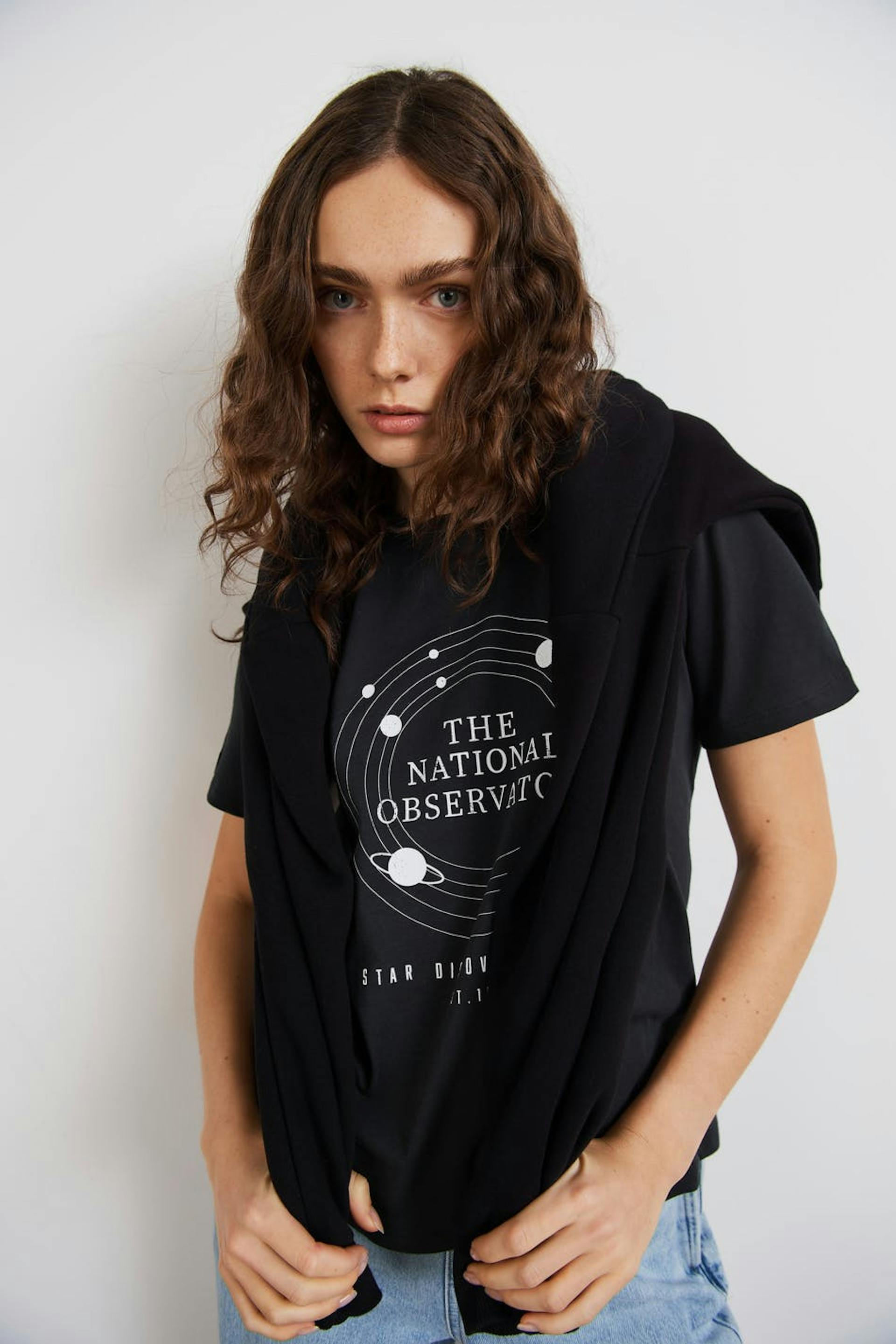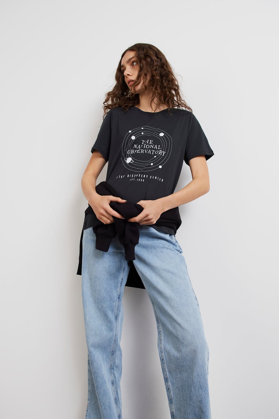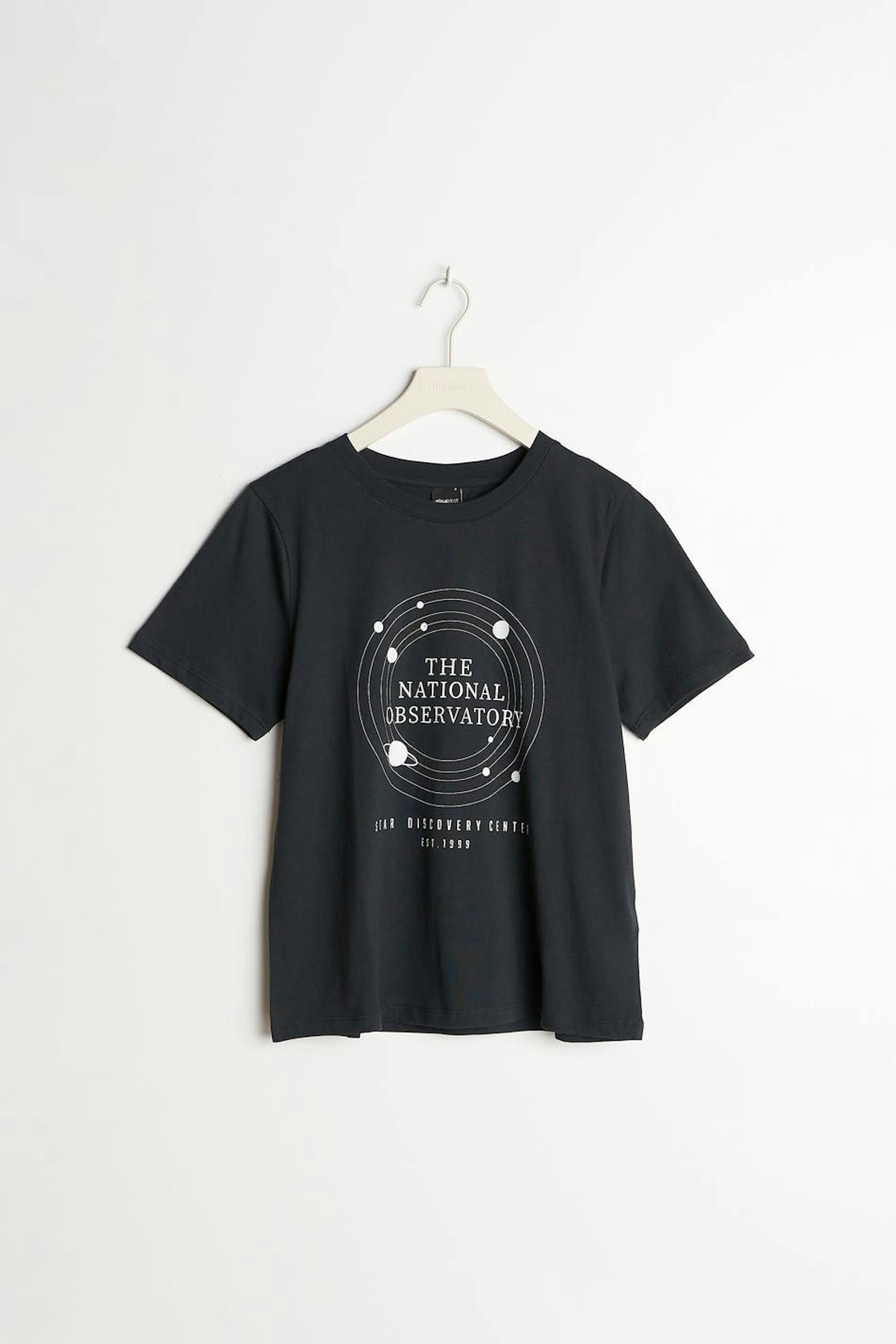 T-skjorte med et verdensrom-inspirert trykk. T-skjorten er svart og har en vanlig passform. Den har en rund halsringning med en smal, ribbet mansjett og et mykt materiale i jersey.
