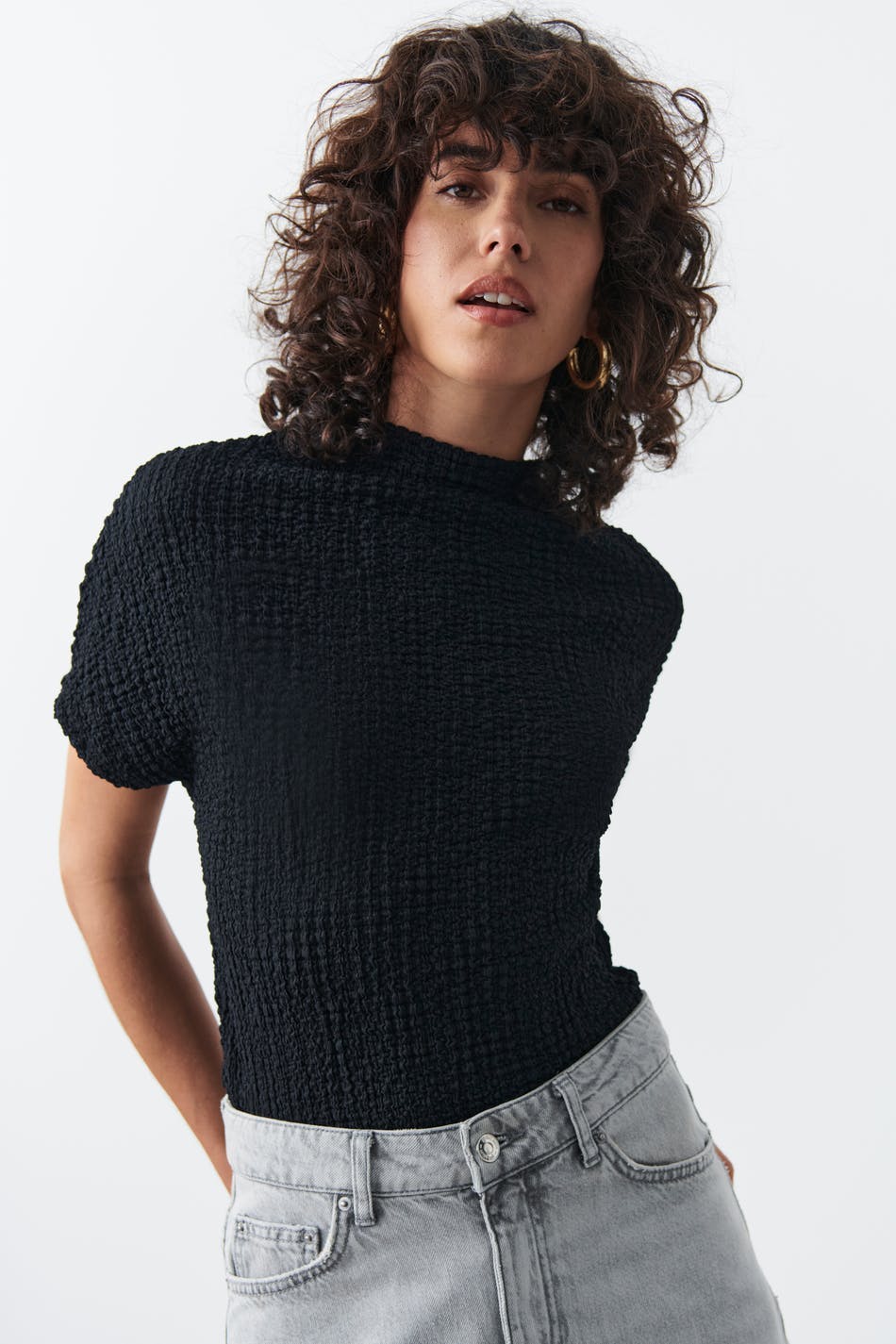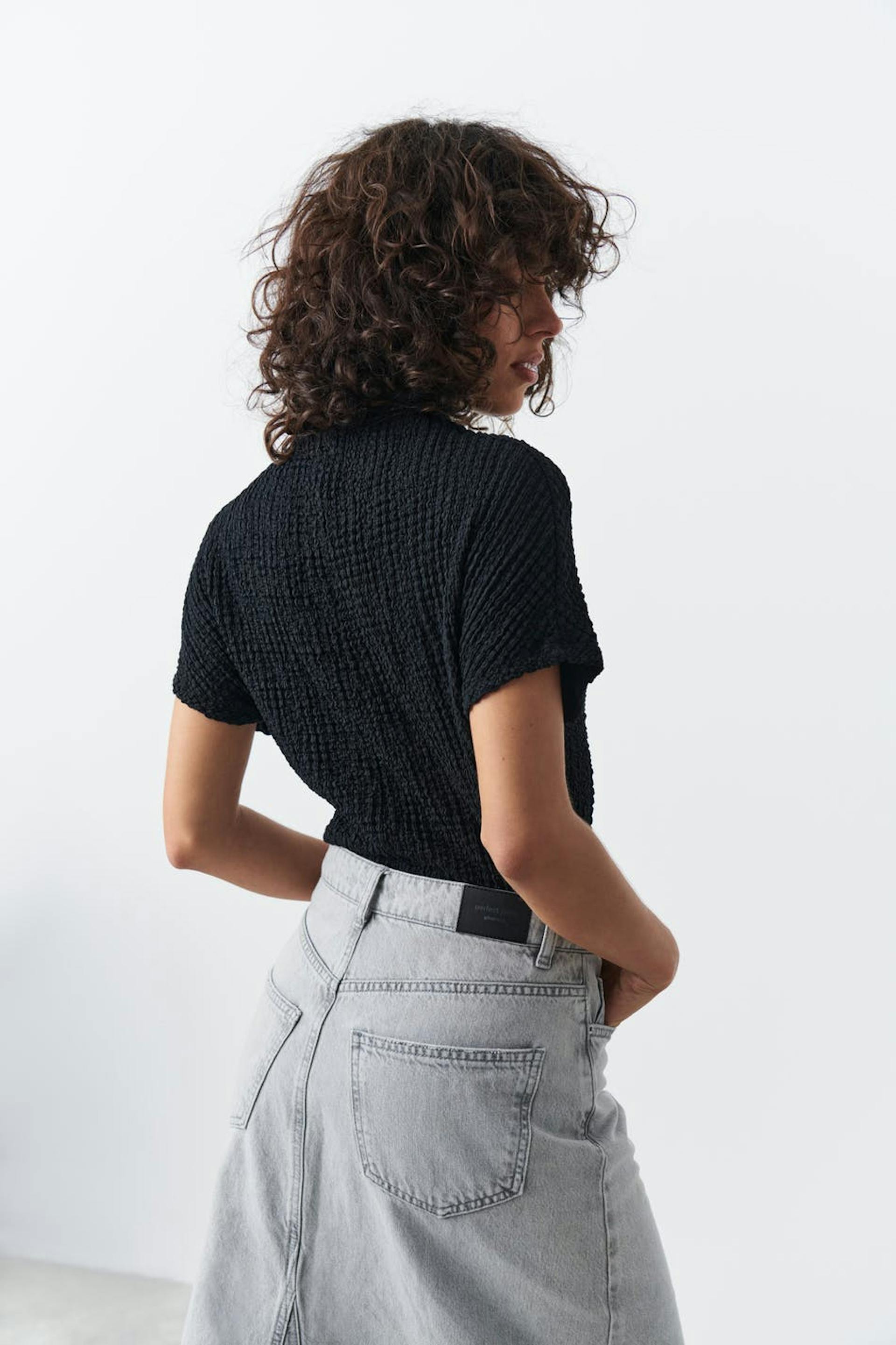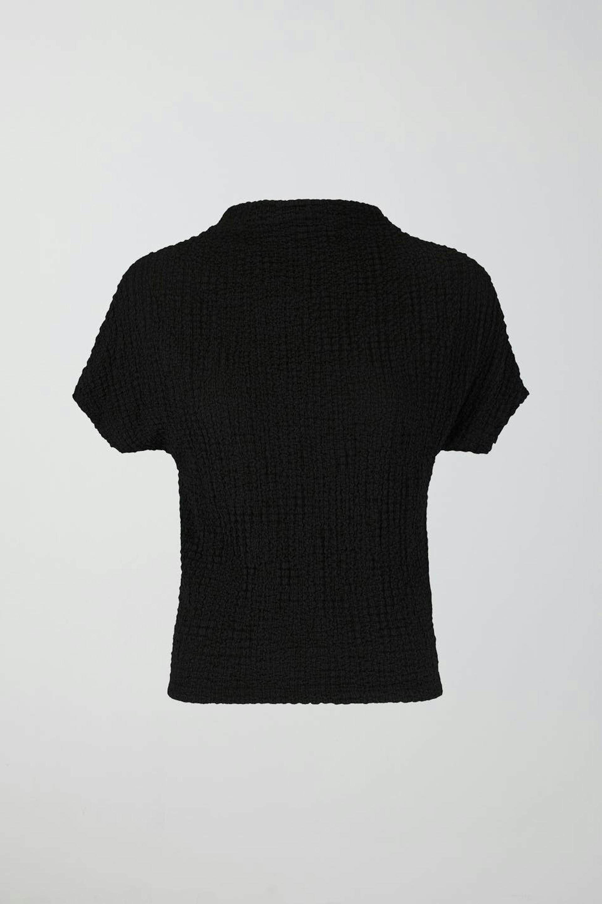 Kortermet topp med pologenser. Toppen er svart og har normal passform. Den har myk, elastisk kvalitet med tekstur.