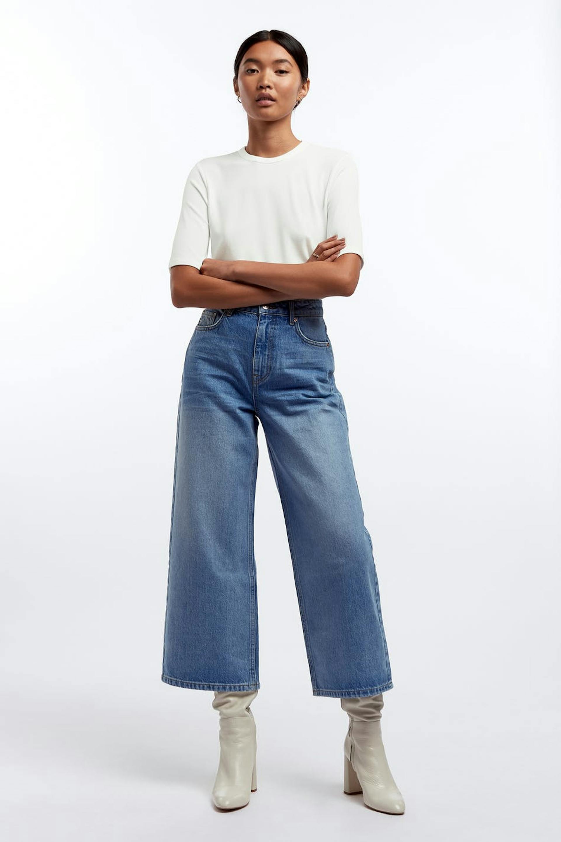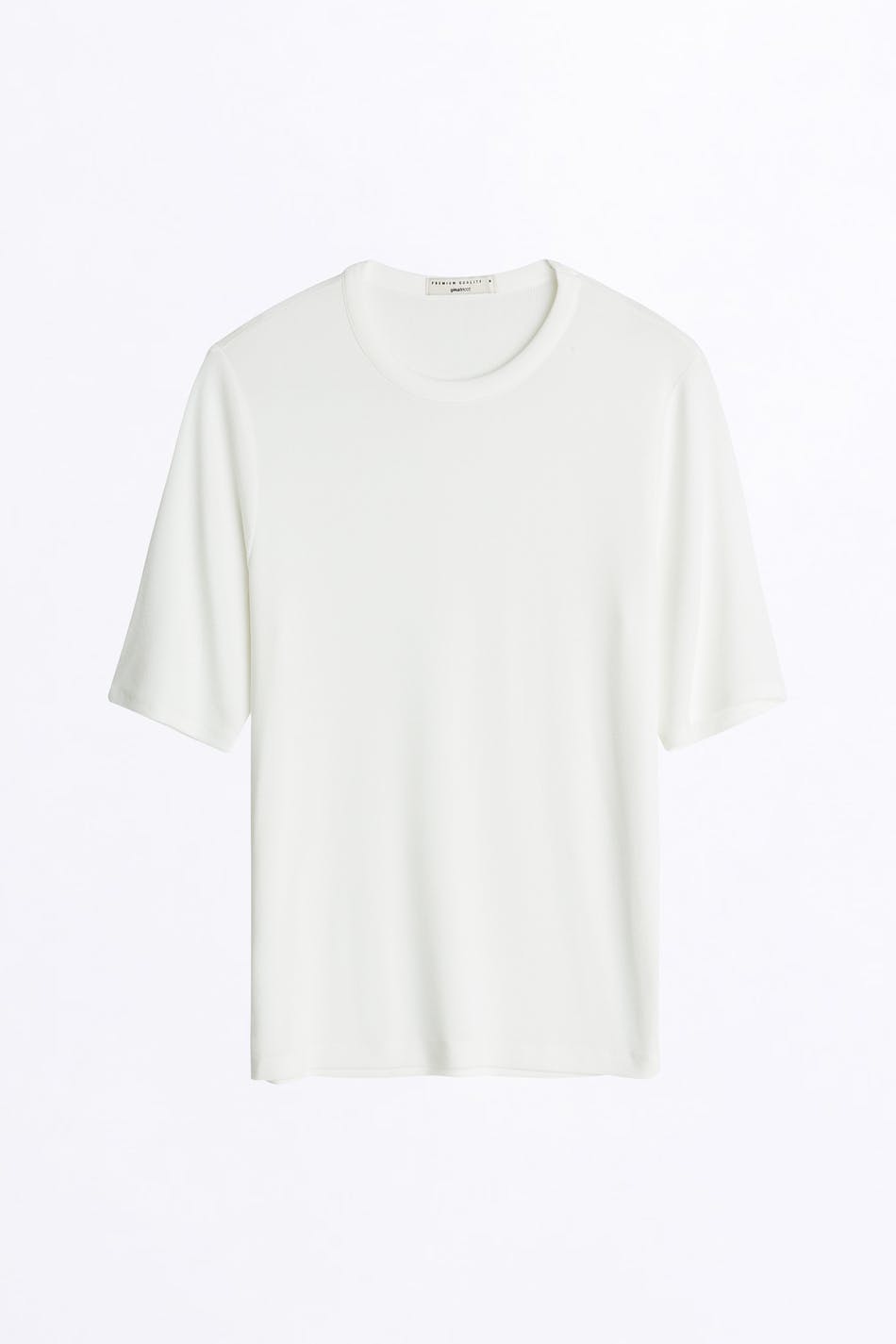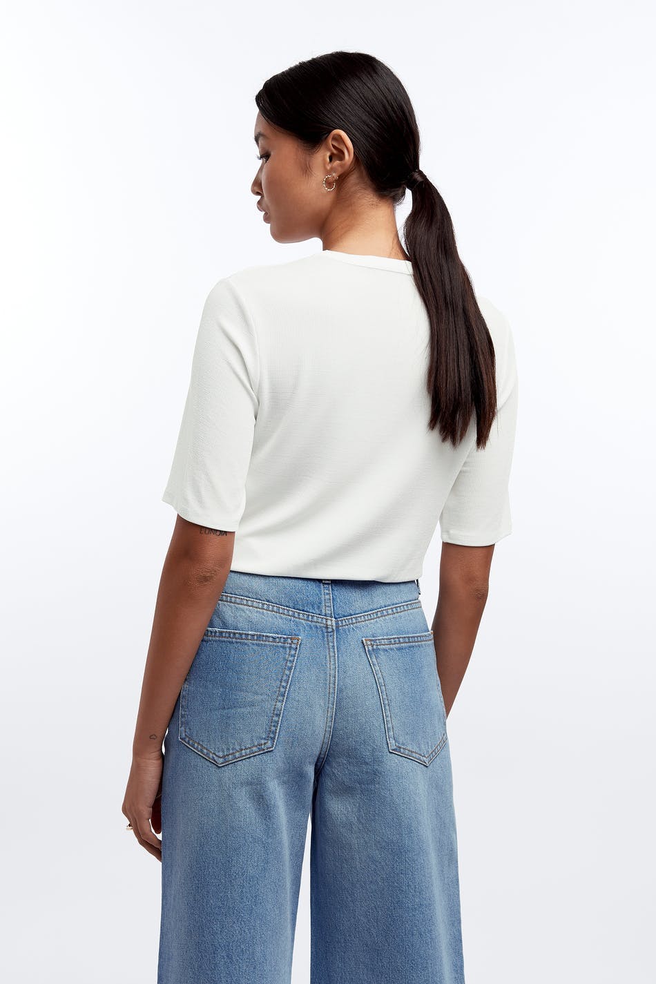 Kortermet t-skjorte med en tilpasset passform. T-skjorten er hvit og har en rund halsringning.