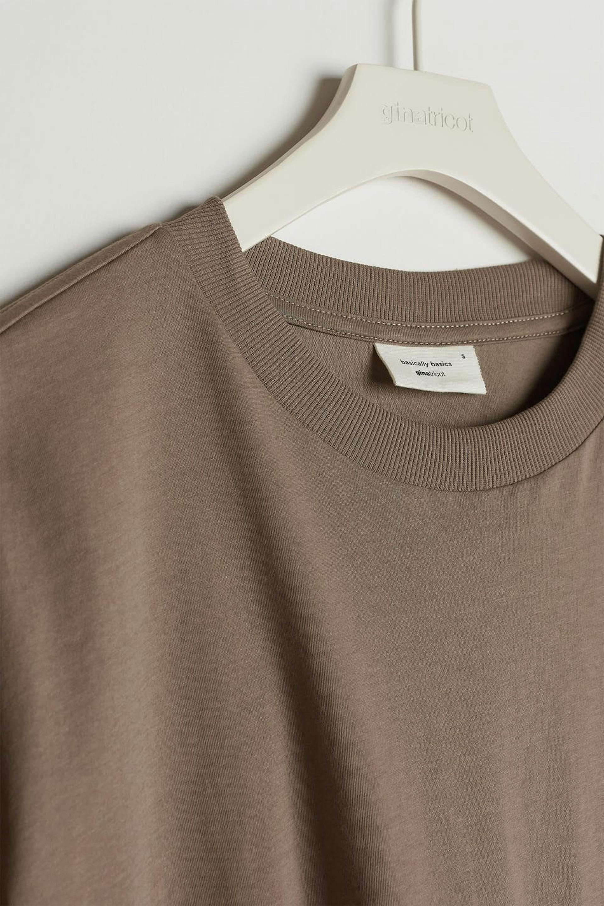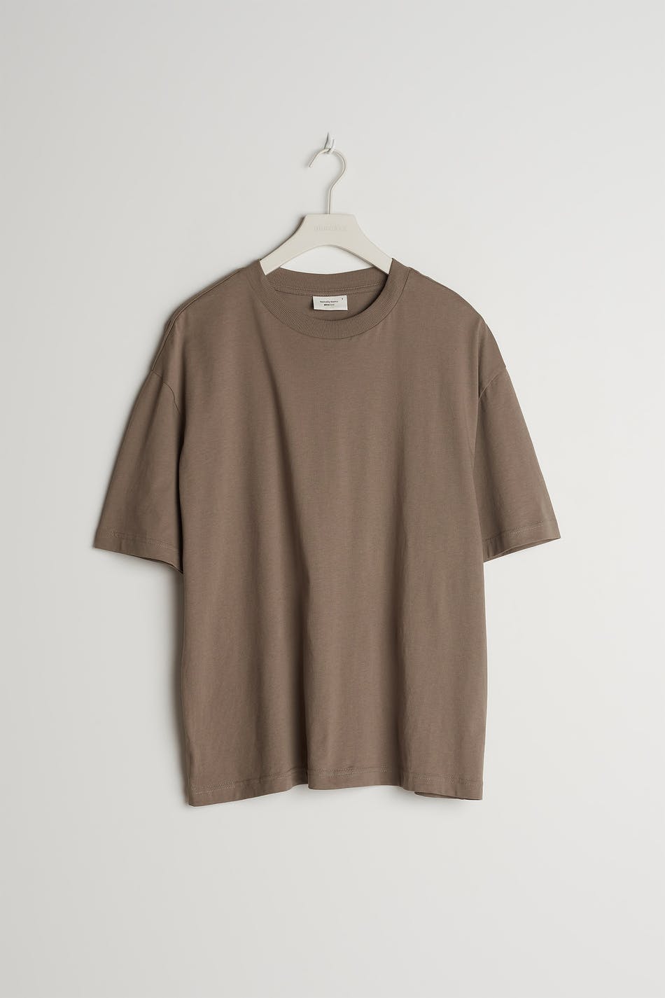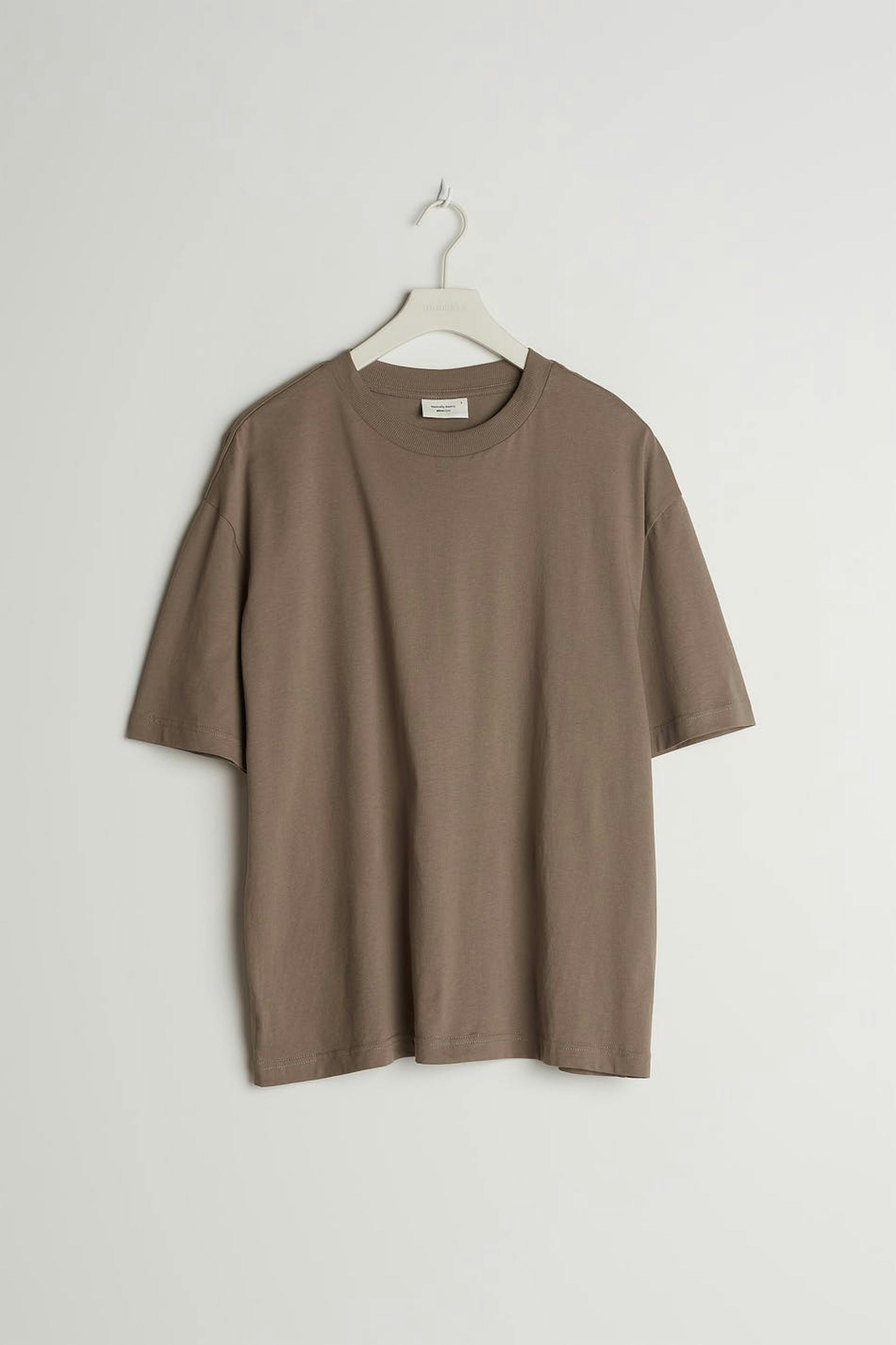 Kortermet t-skjorte med en oversized passform. T-skjorten er brun og har et mykt materiale i bomull. Den har en ribbet mansjett på halslinjen.