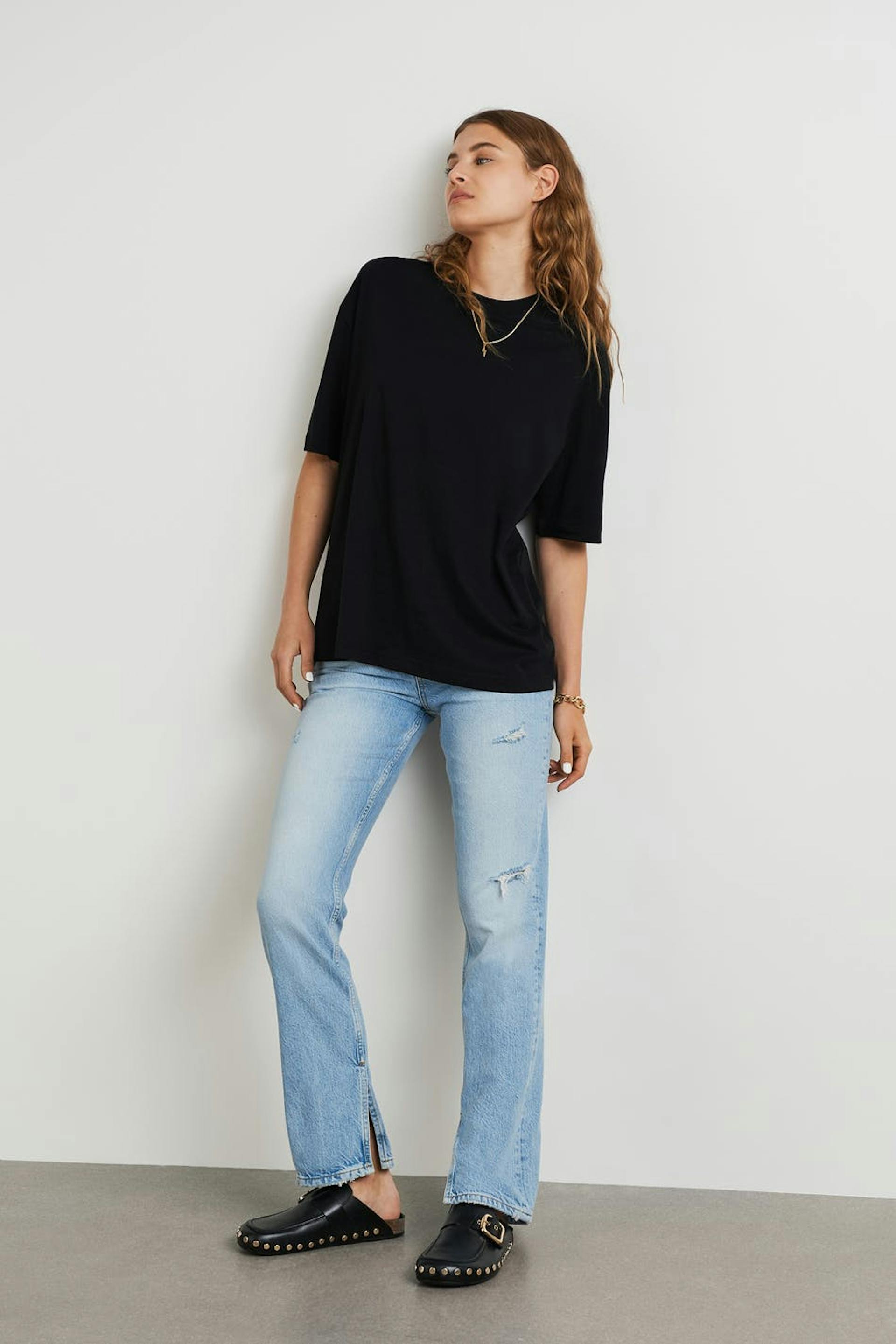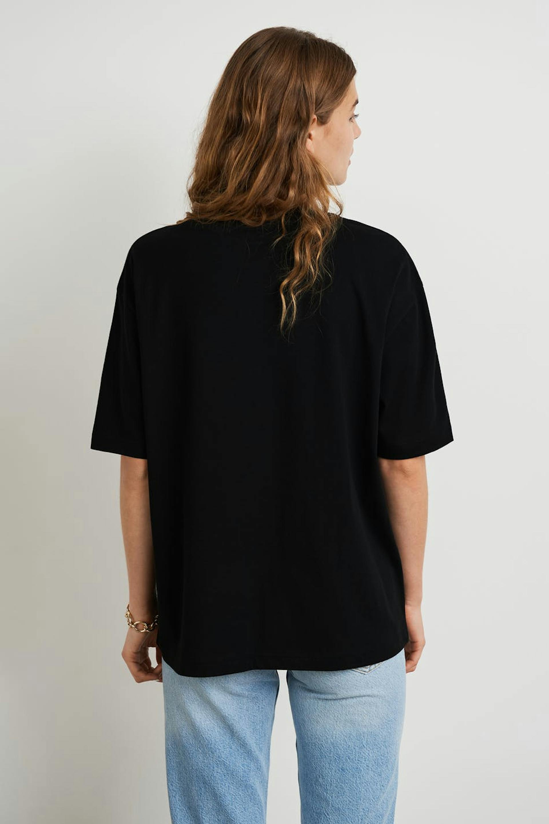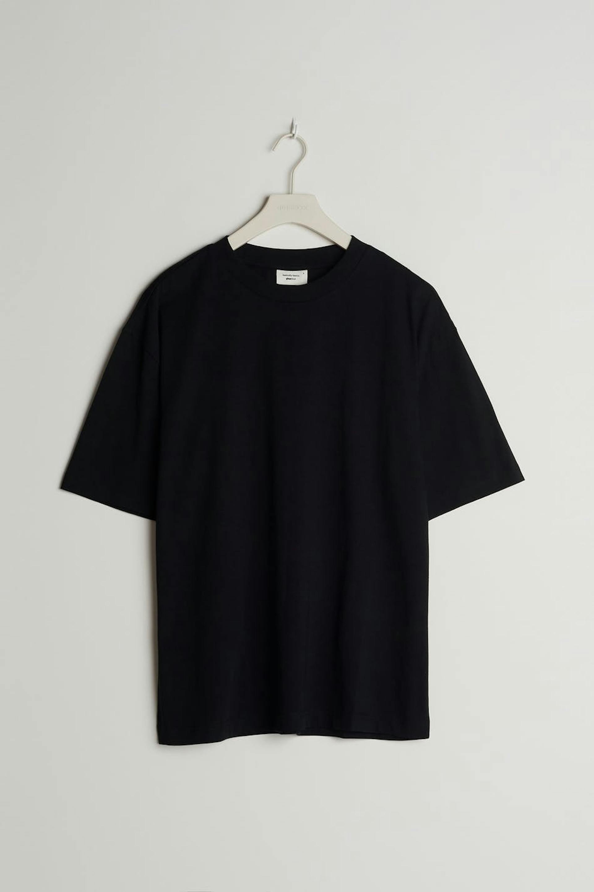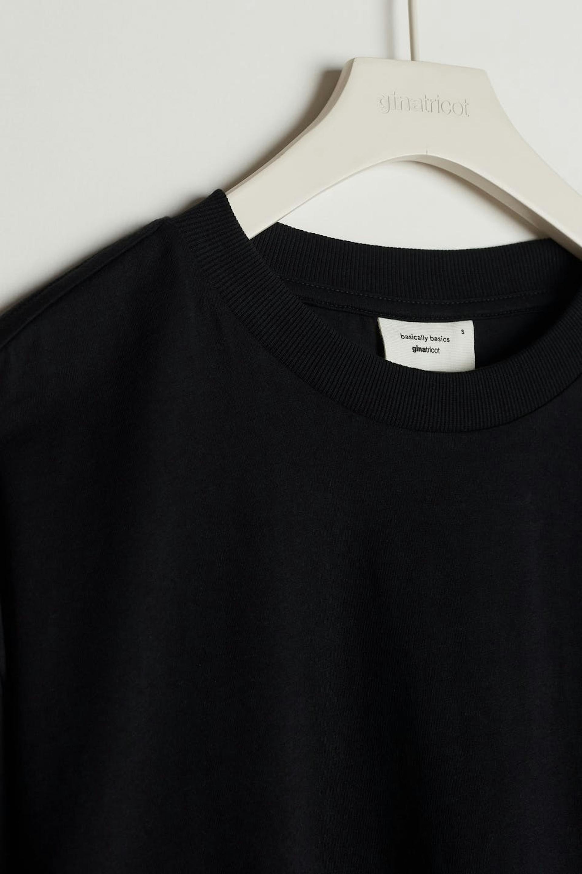Kortermet t-skjorte med en oversized passform. T-skjorten er svart og har et mykt materiale i bomull. Den har en ribbet mansjett på halslinjen.