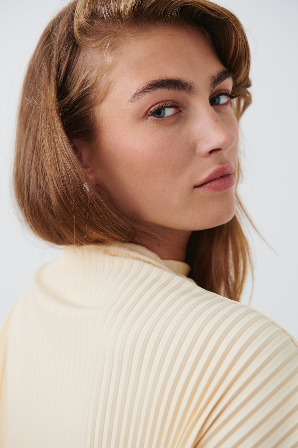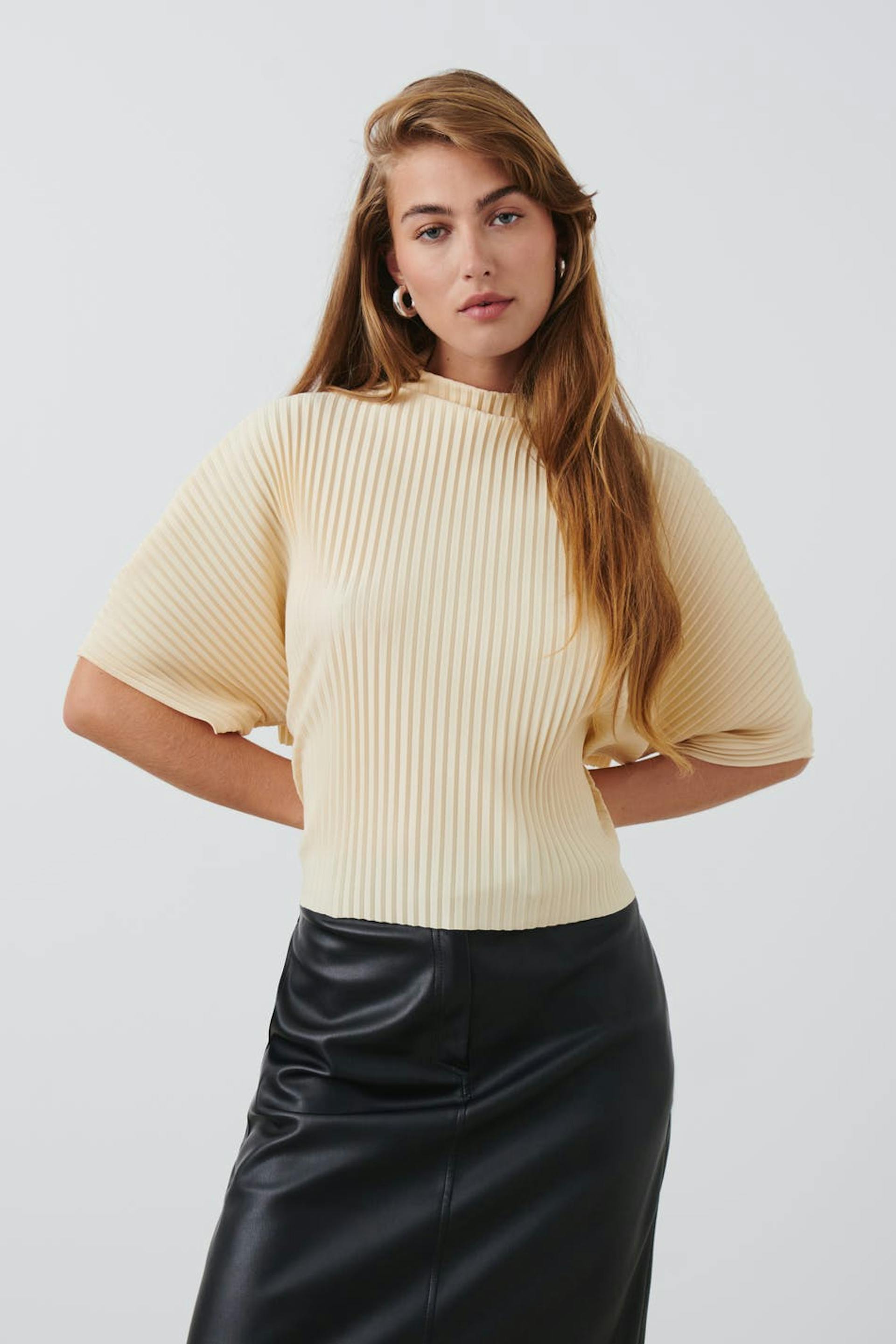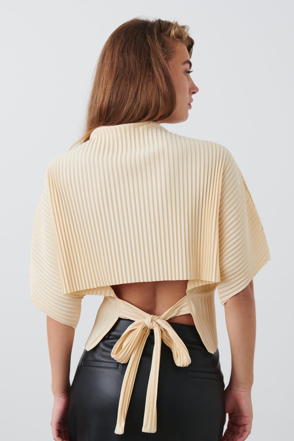 Plissert topp i jersey med løs passform. Toppen er hvit, kortermet og avkortet. Den har traktkrage og åpen rygg med knutedetalj.