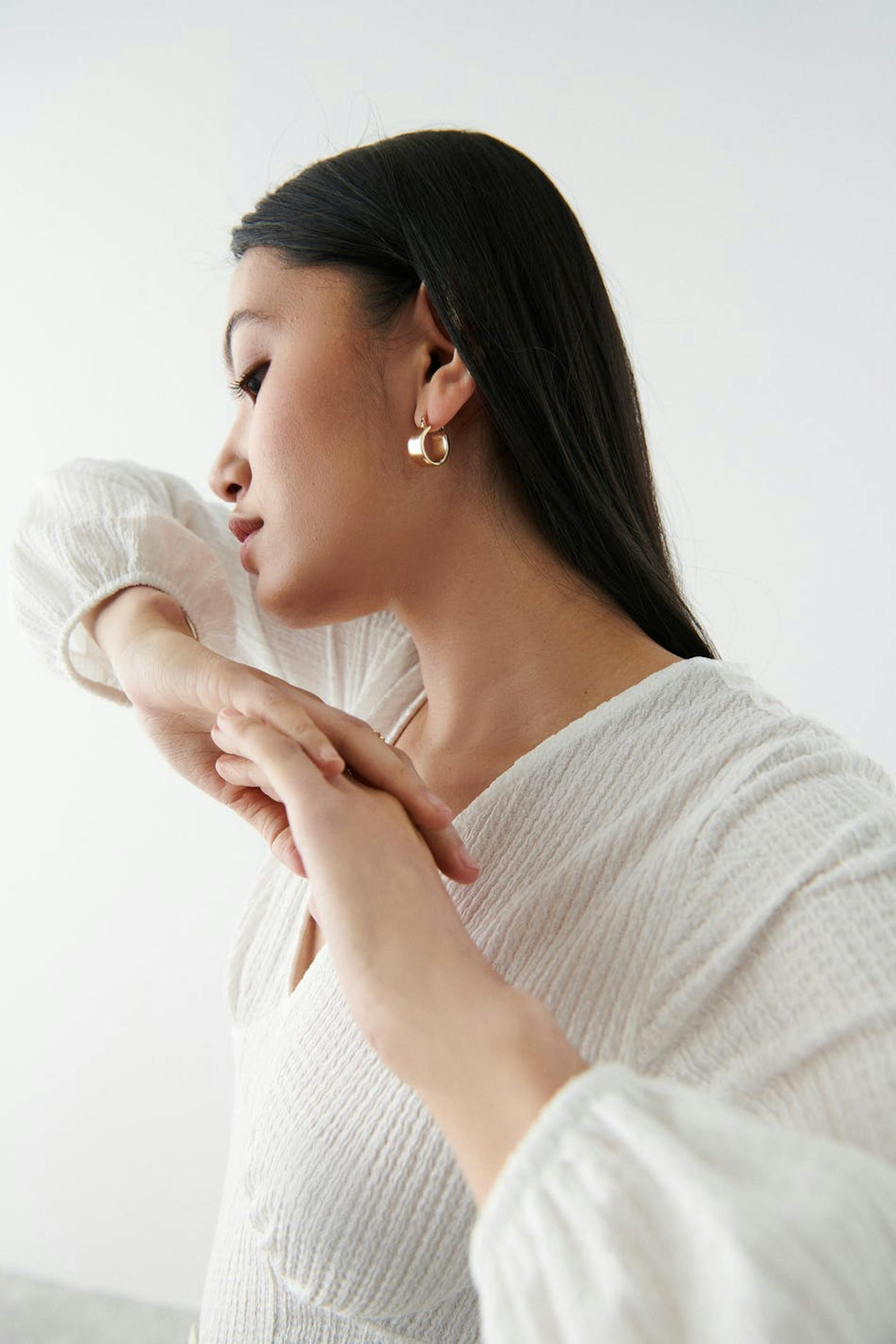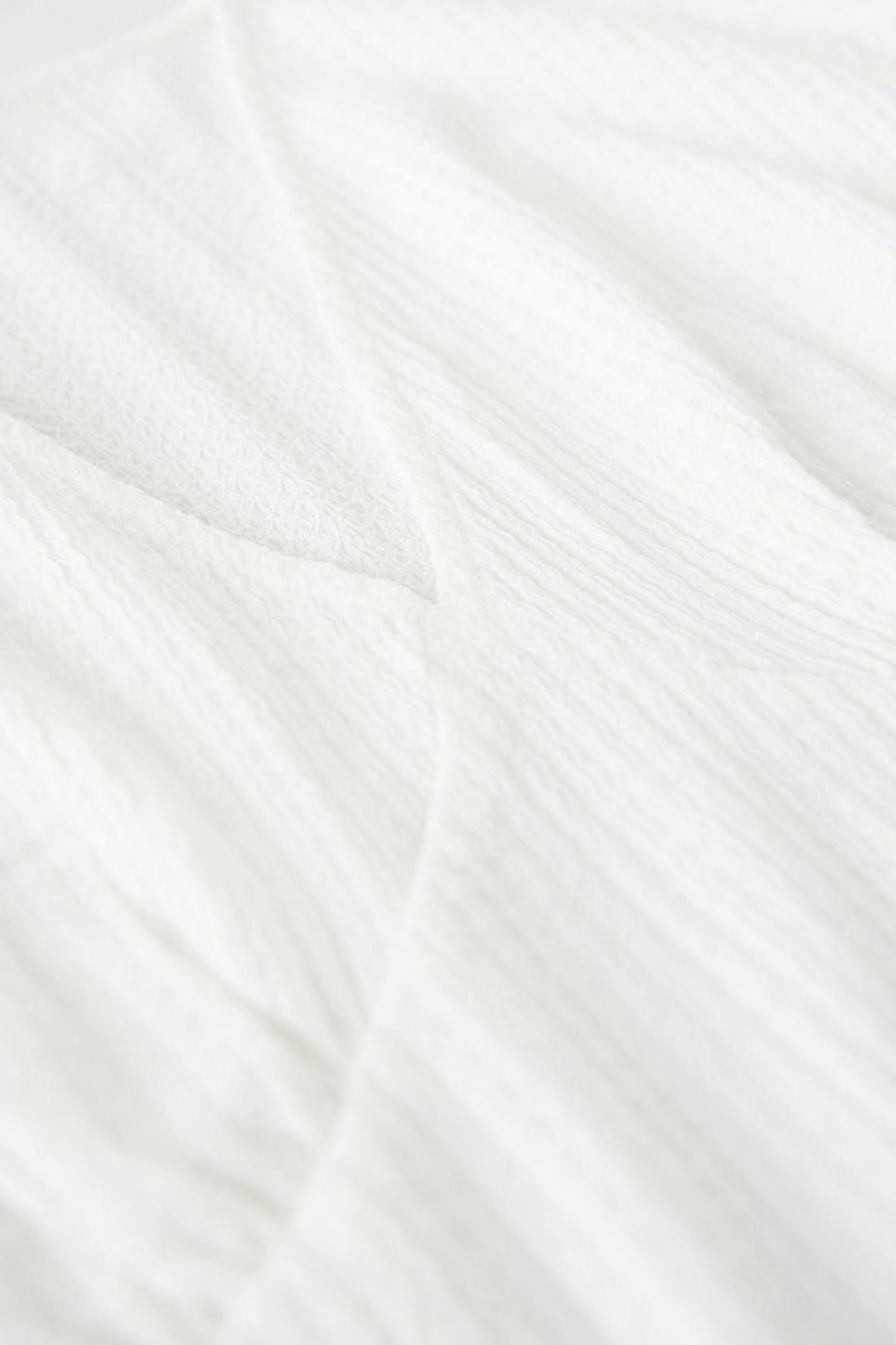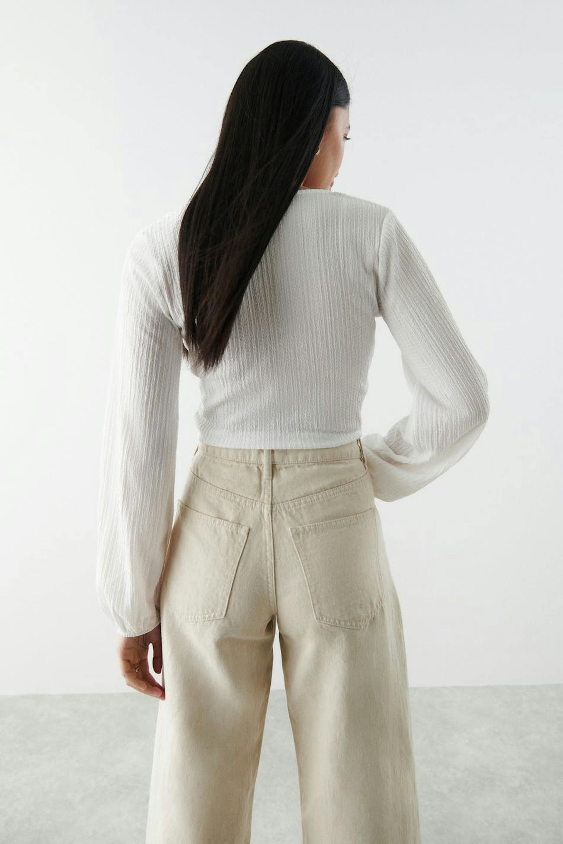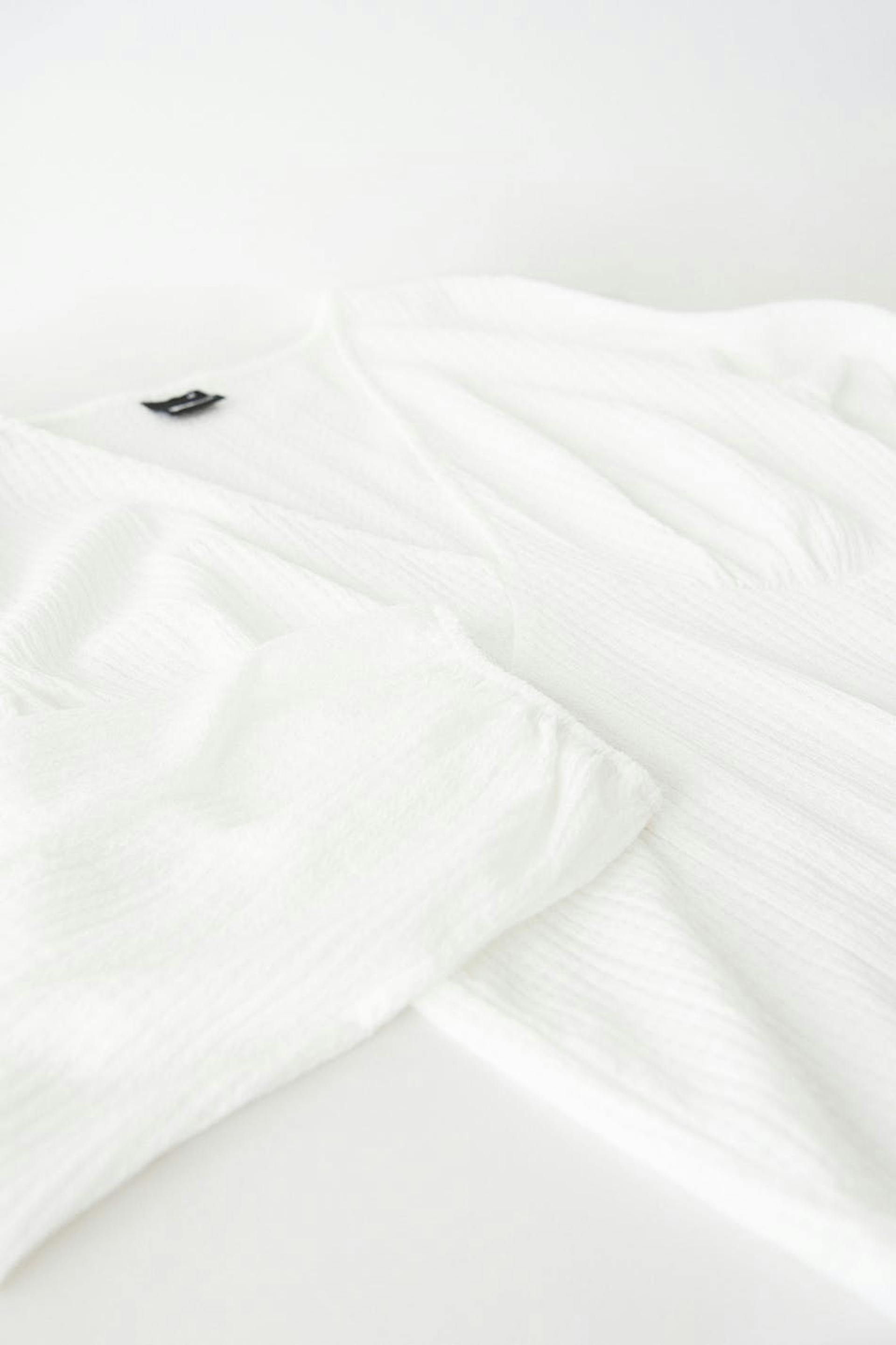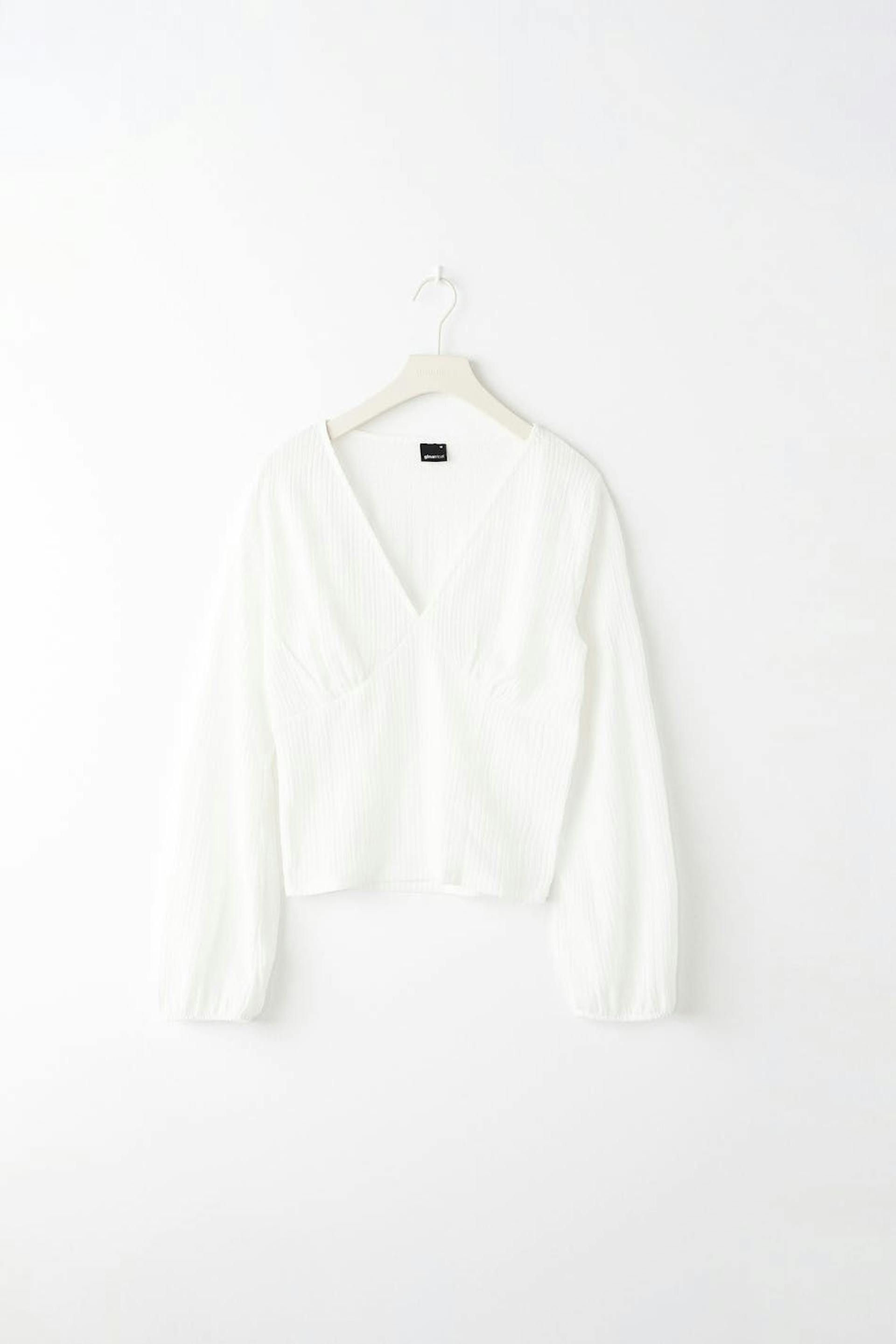 Topp med en vanlig passform. Toppen er hvit og har ballongermer. Den er laget av jersey og har v-ringning og dekorative sømdetaljer nedenfor bysten med rynker.
