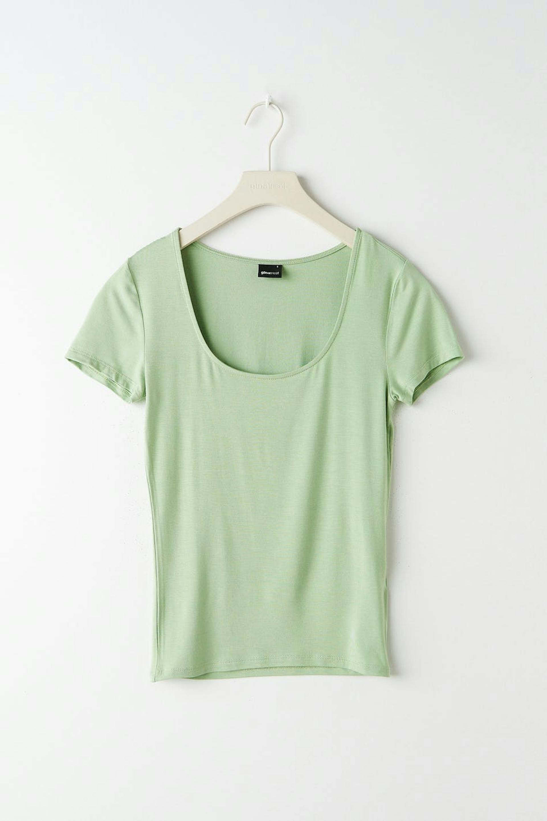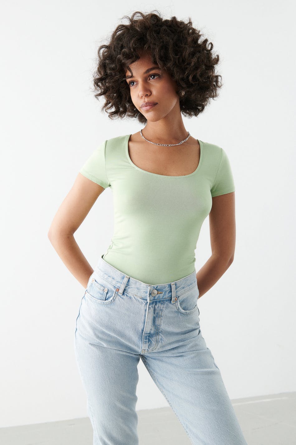 Kortermet jerseytopp med en tilpasset passform. Jerseytoppen er grønn og har en rund hals.
