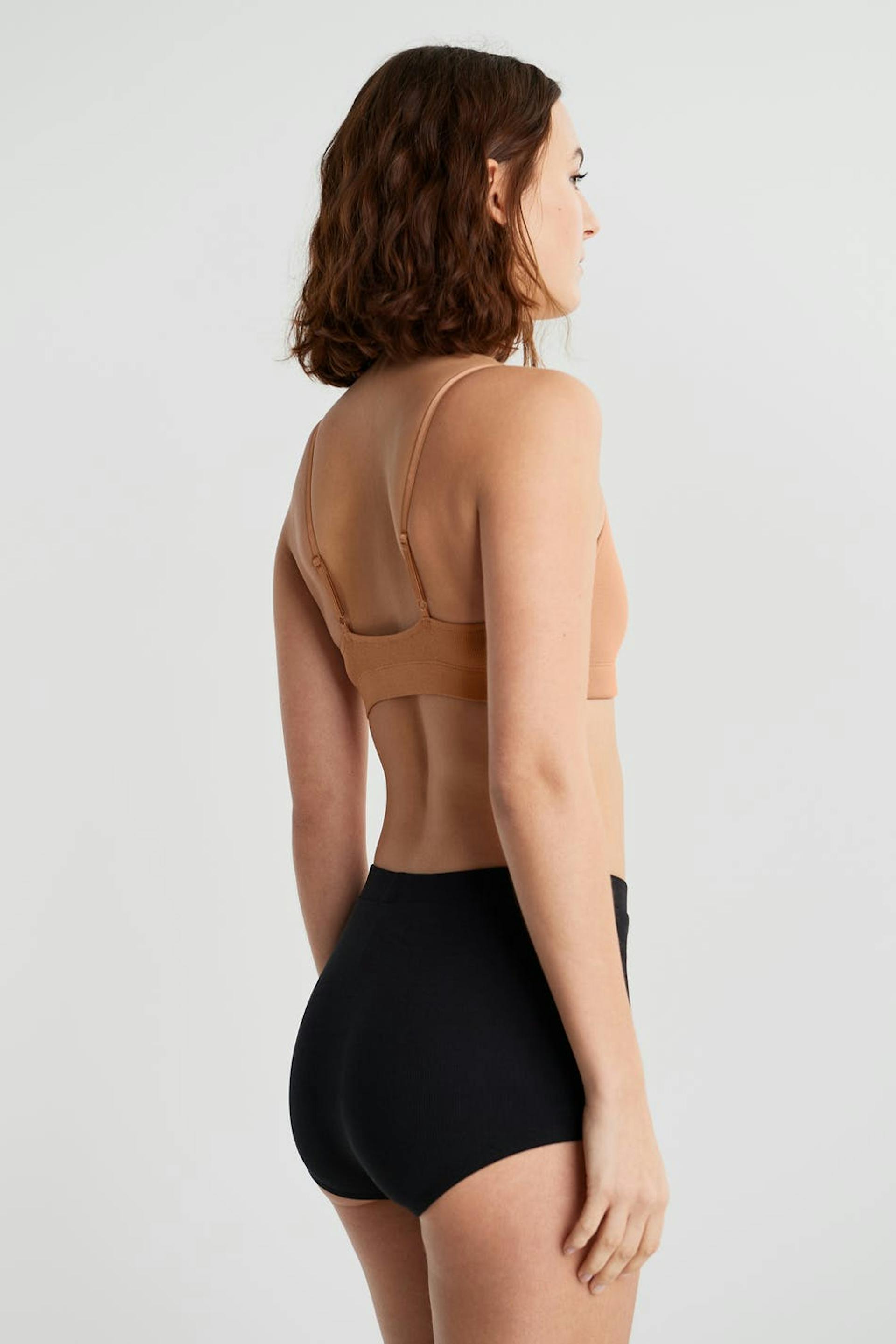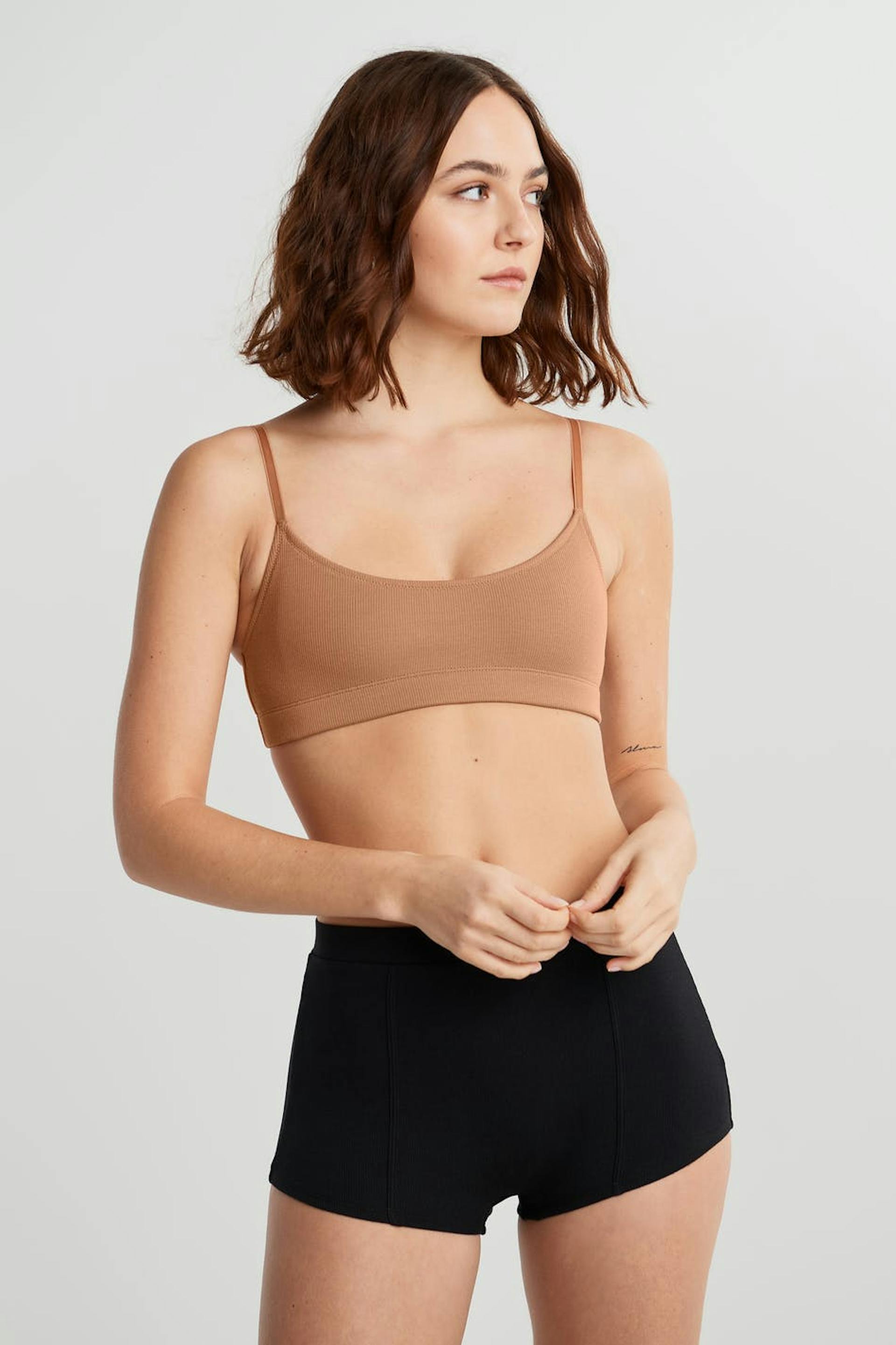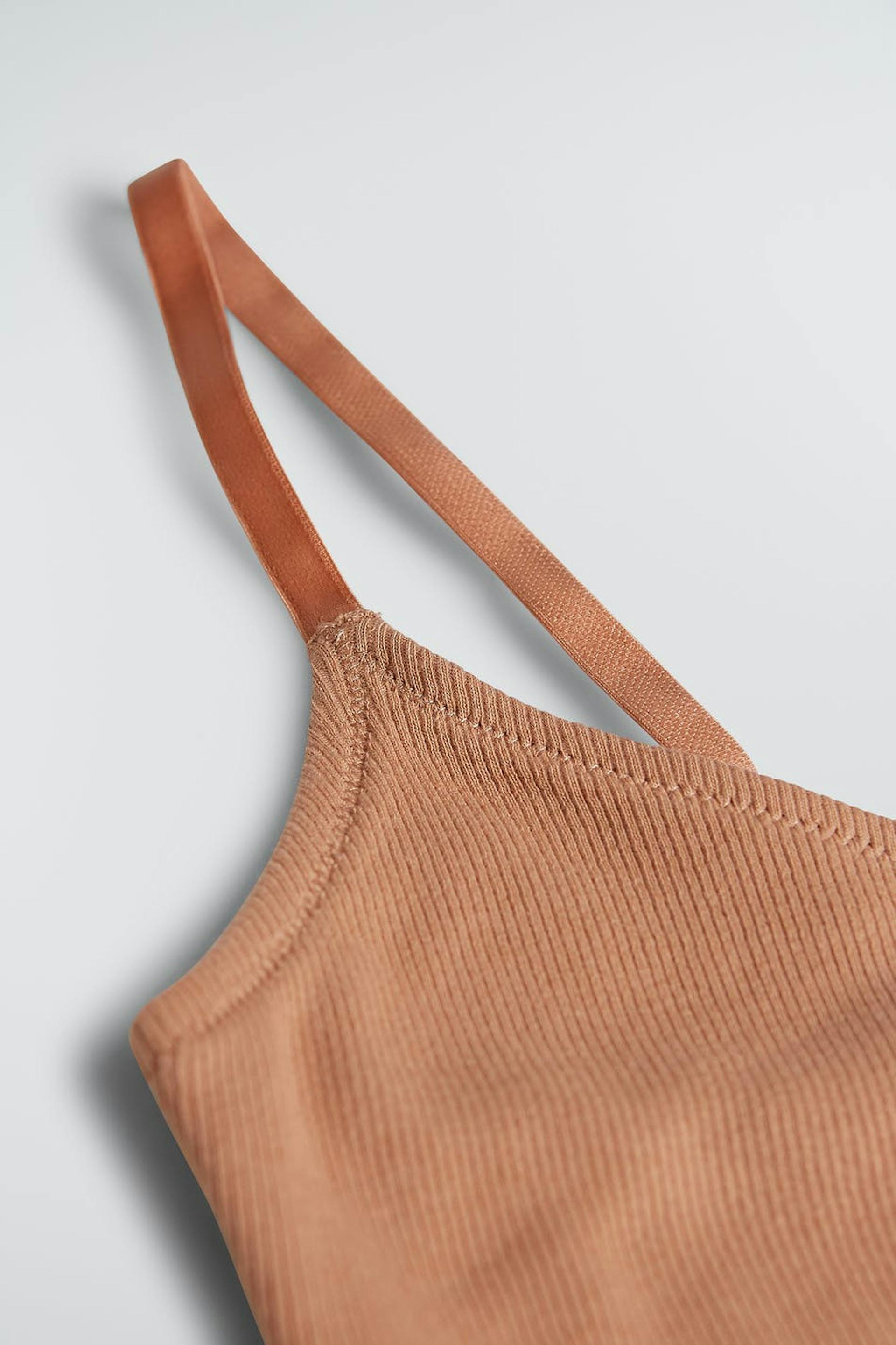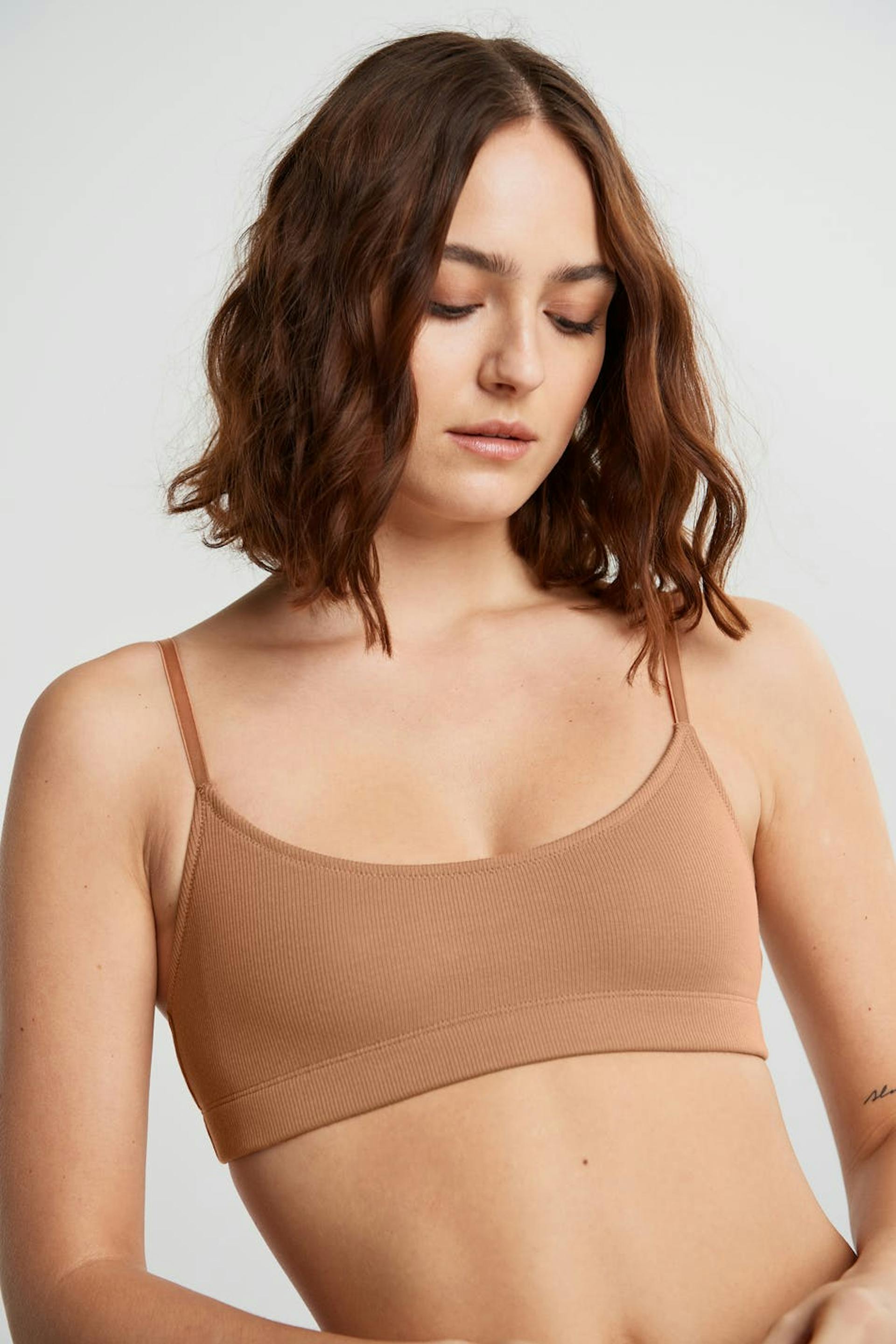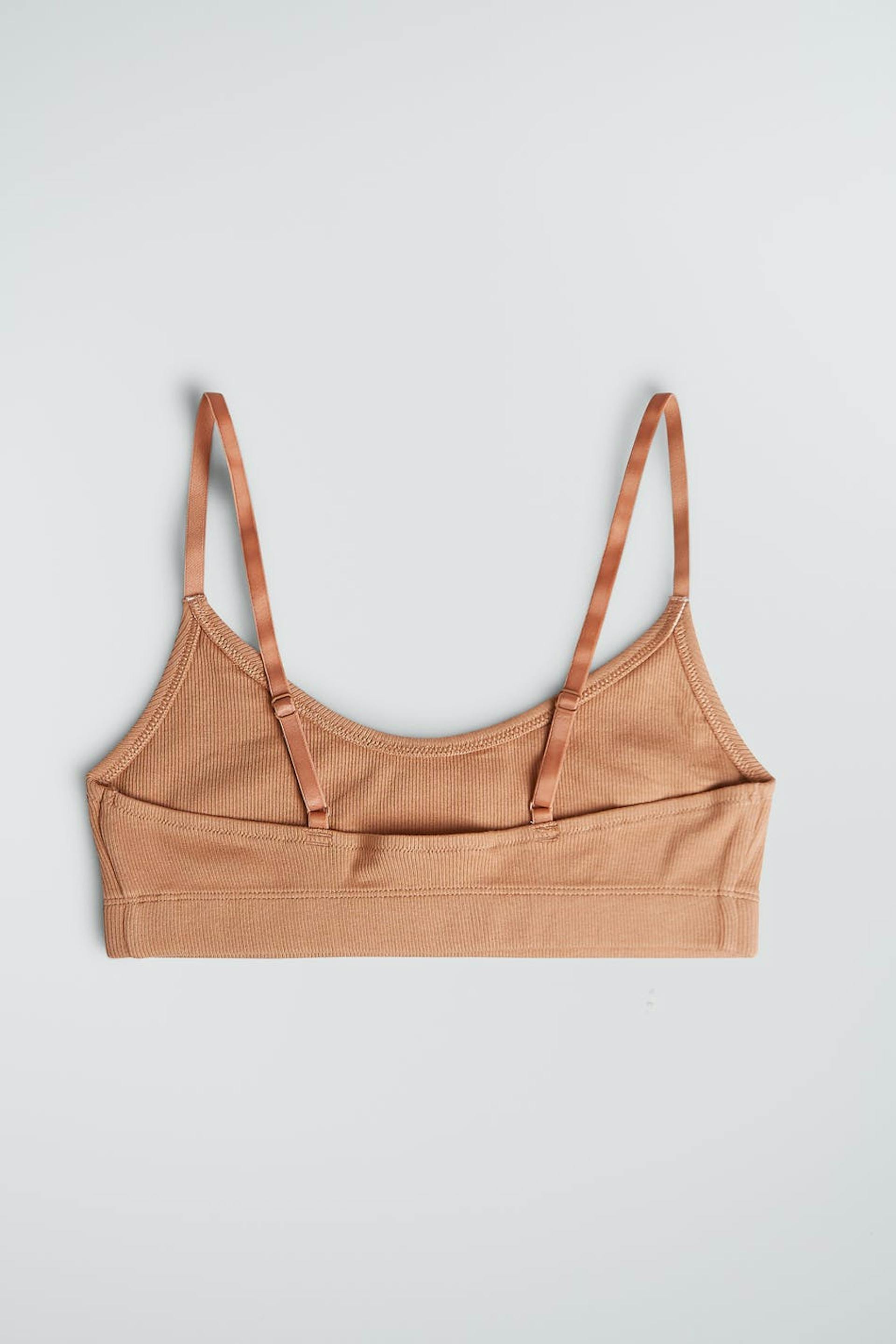 Myk BH-en. BH er brun og ribbet. Den er laget av bomull.