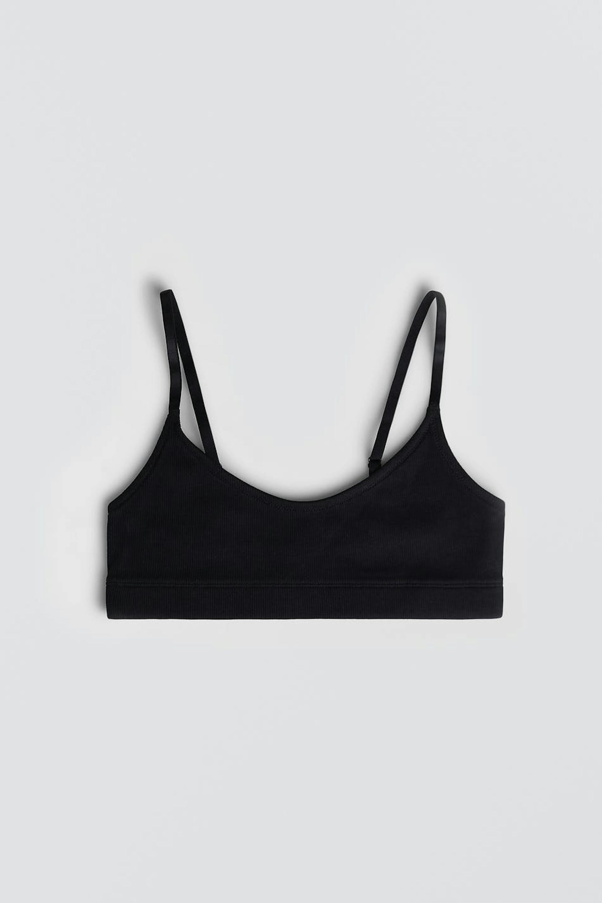 Myk BH-en. BH er svart og ribbet. Den er laget av bomull.