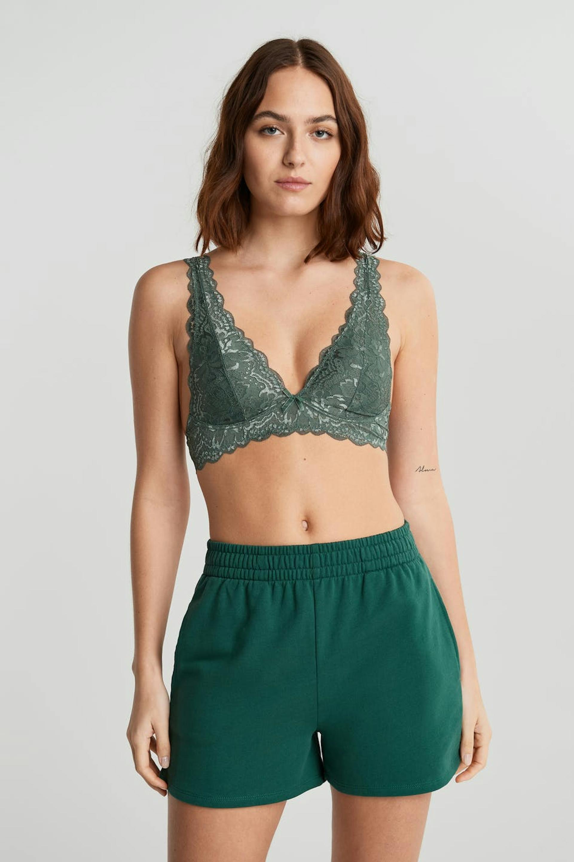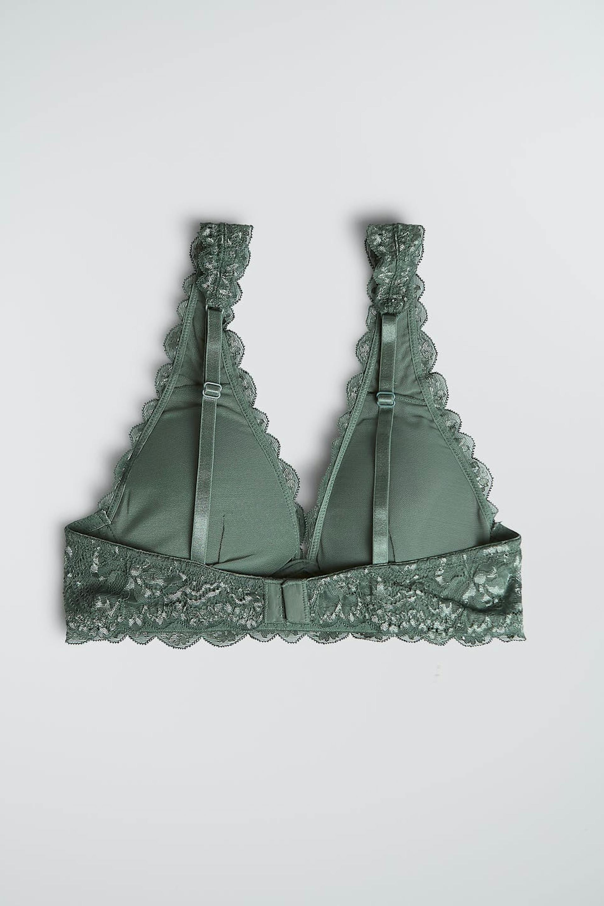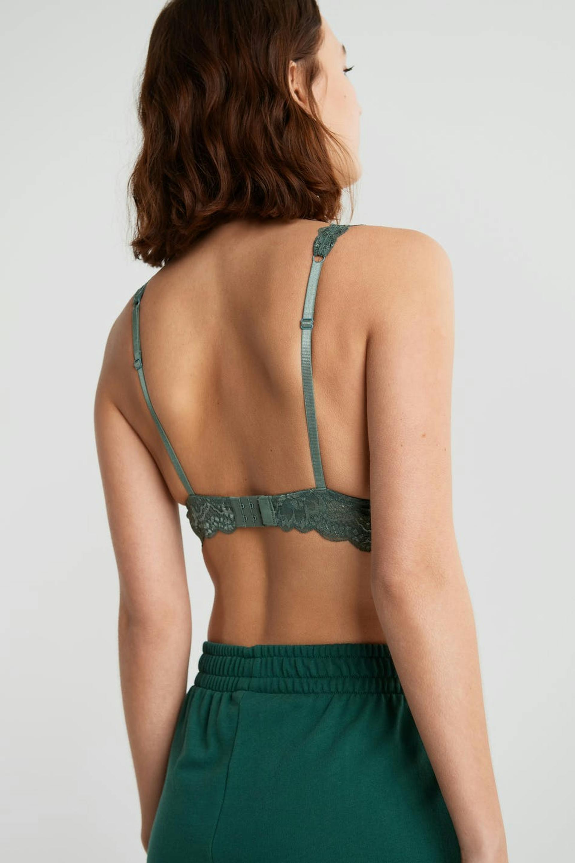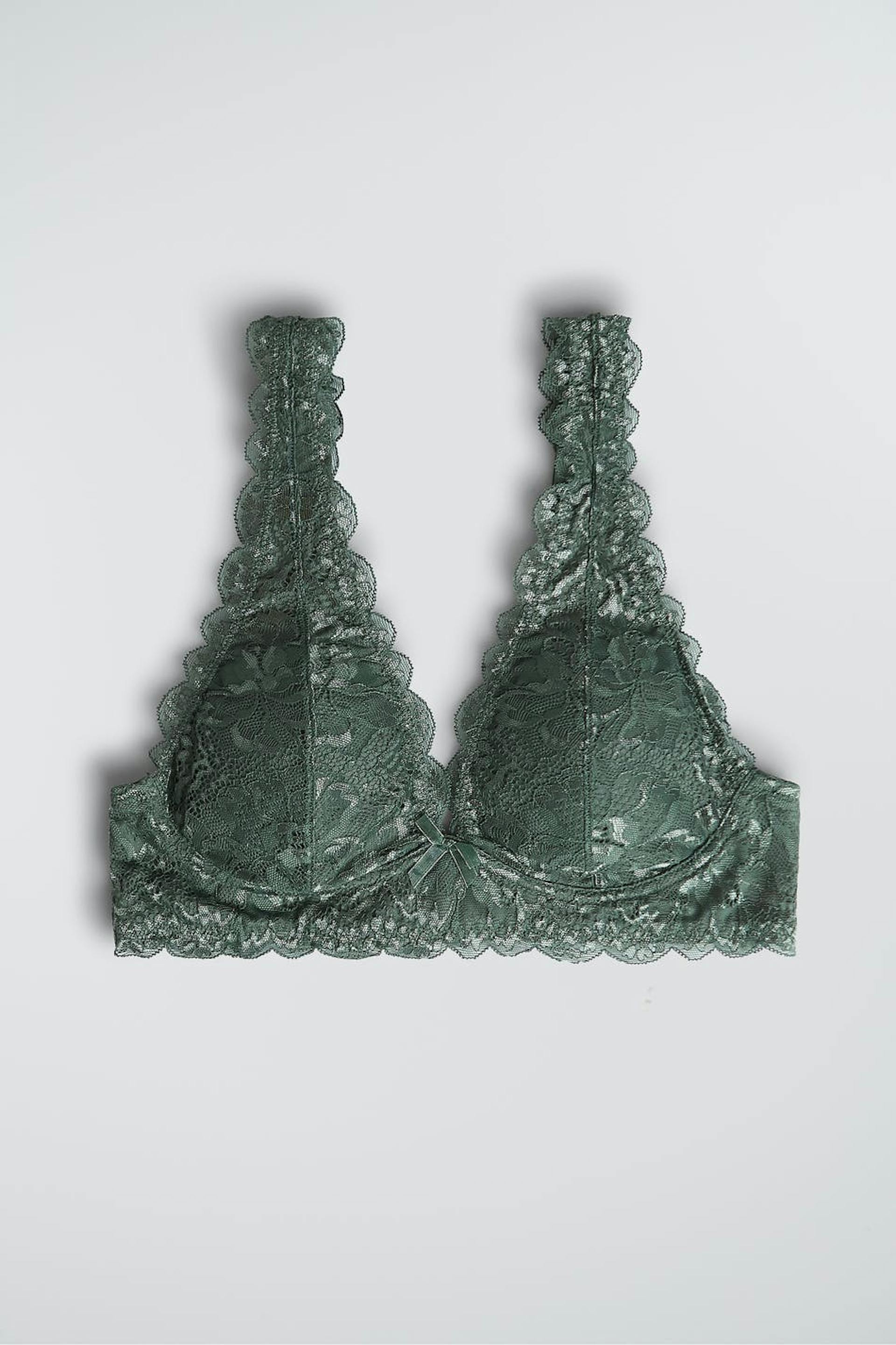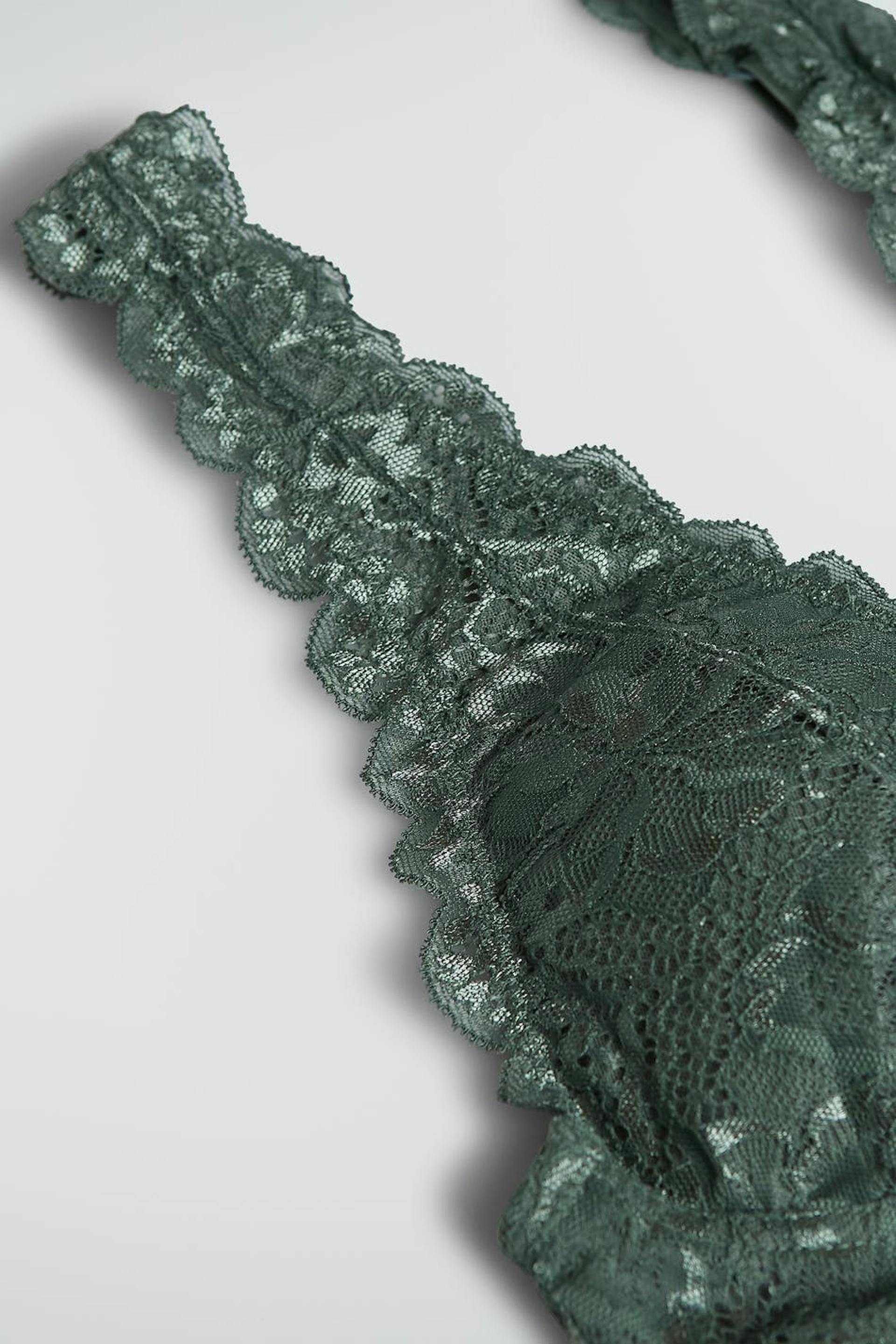 BH-en med en myk polstring. BH er grønn og har en elastisk strikk ved kantene. Den er laget av blonde og har justerbare skulderstropper, en justerbar lukning i ryggen og ei dekorativ sløyfe.