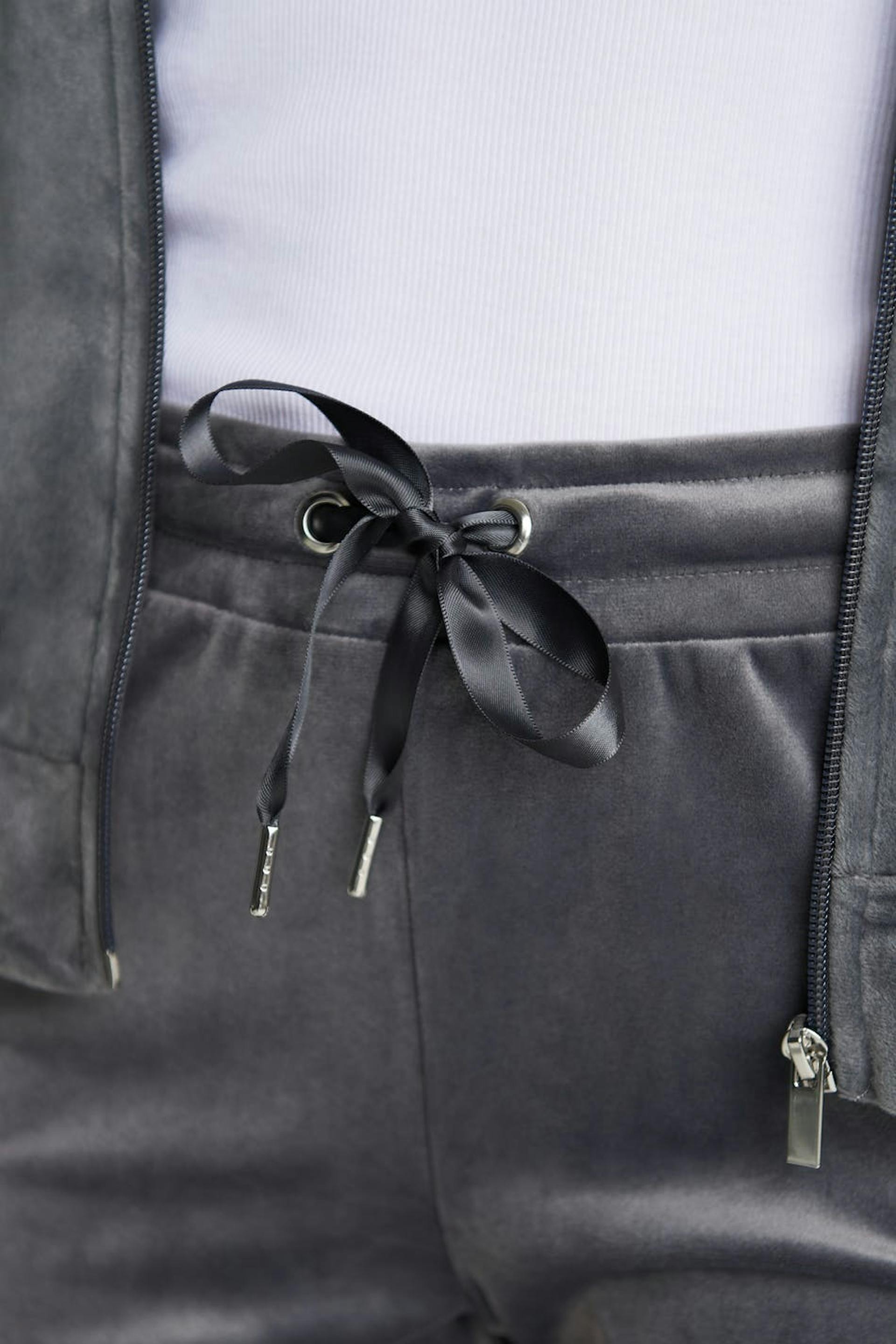 Kort shorts med et rett snitt. Shortsen er mørke grå og grå og har en elastisk midje med en snøring i sateng. Den er laget av velur. Holdes unna åpen ild.
