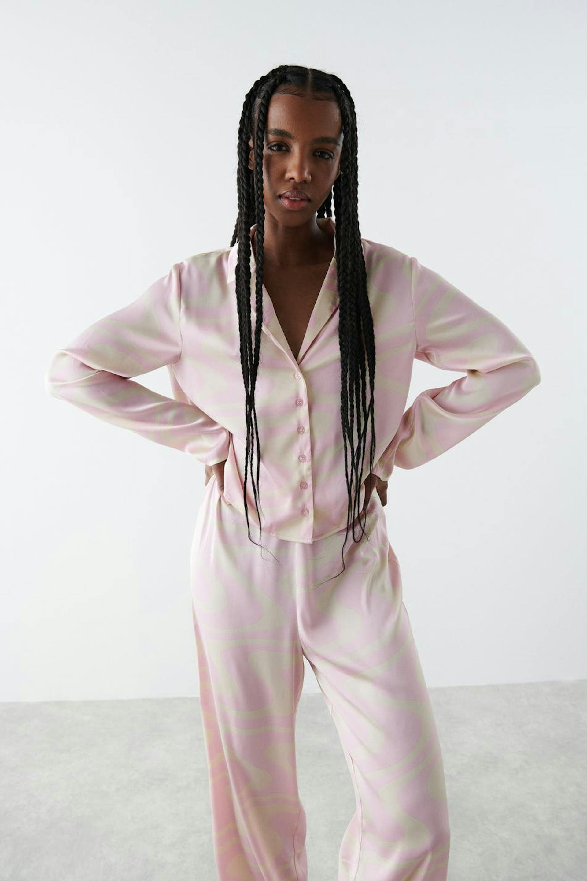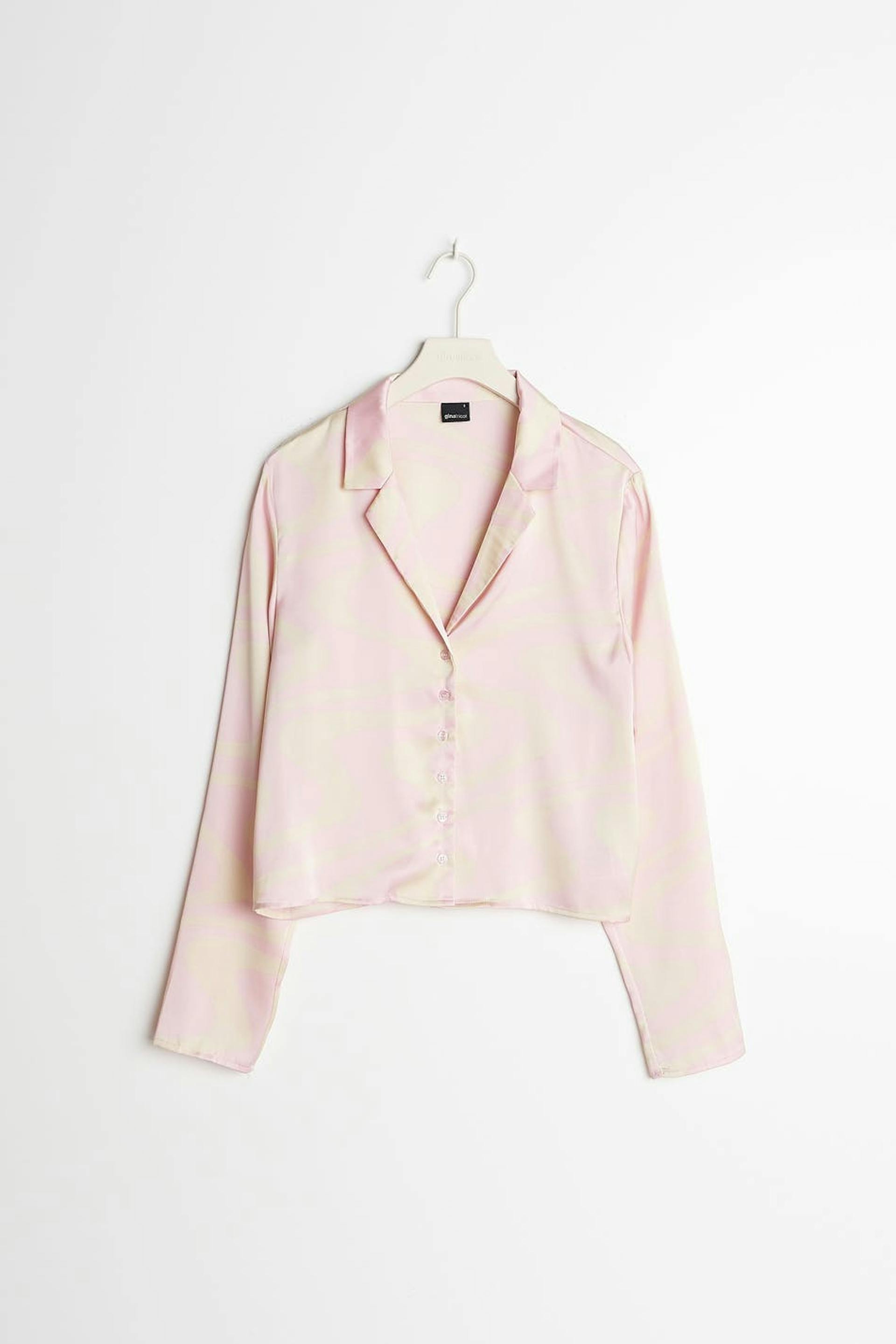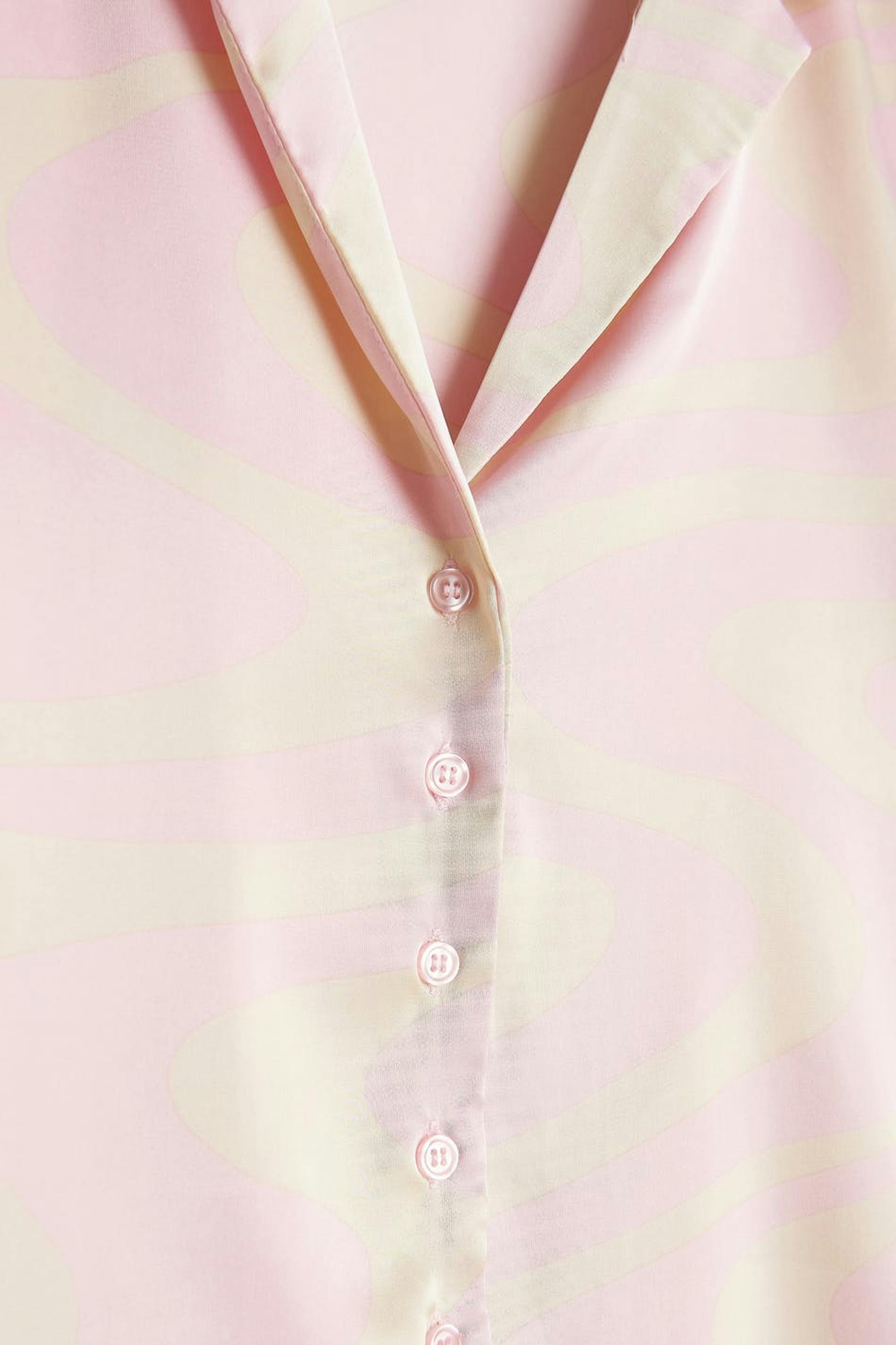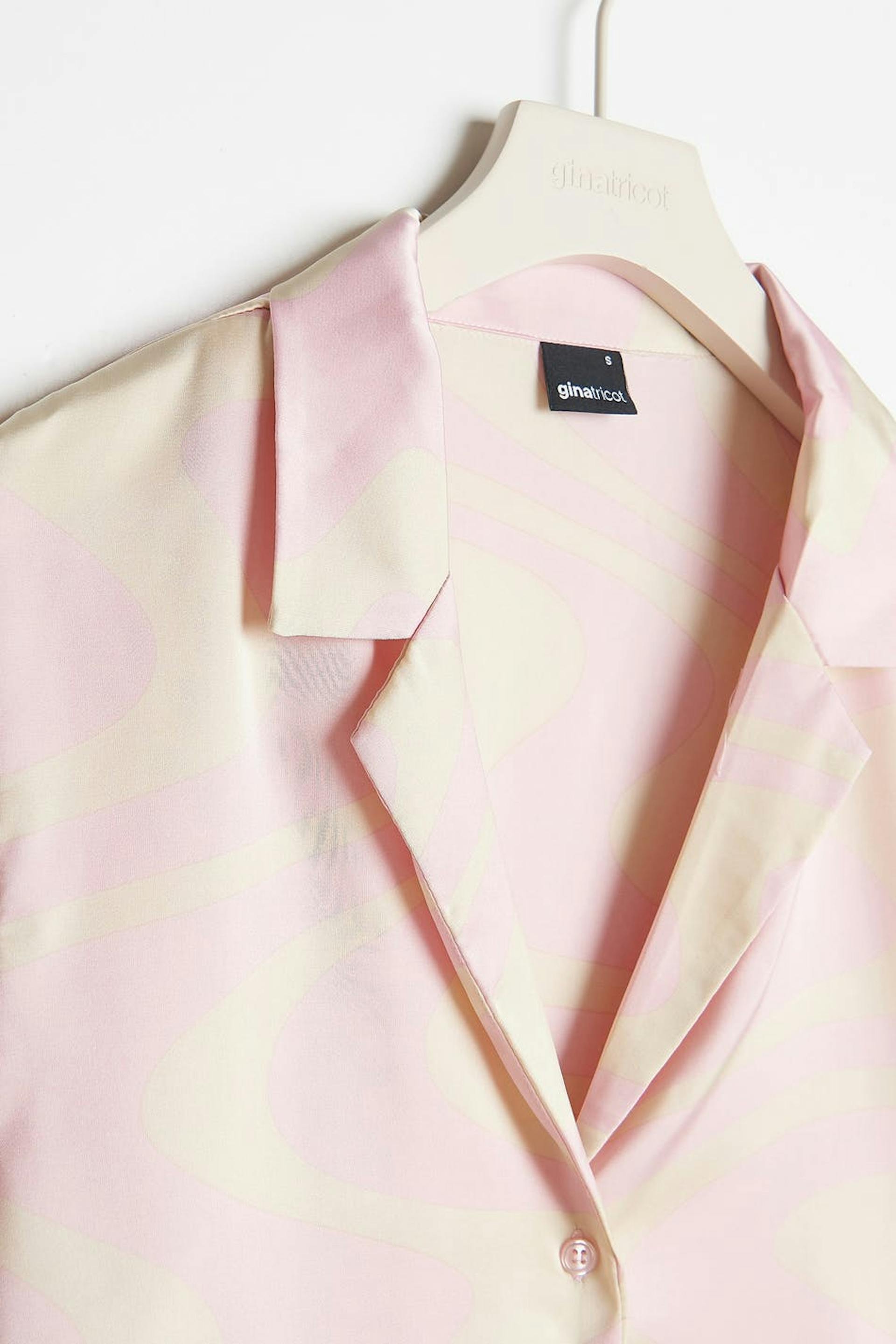 Pysjamasskjorte i sateng med knappstolpe foran. Skjorten er rosa og har et bølgemønster. Den har en klassisk skjortekrage med jakkeslag og litt kortere lengde.