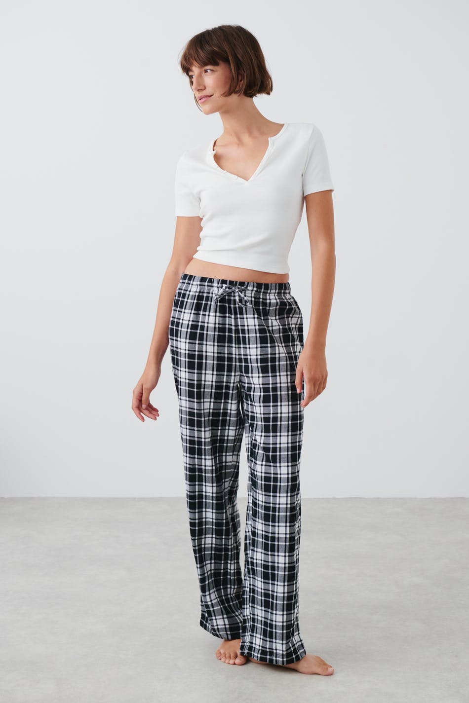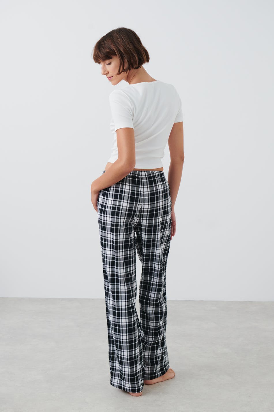 Rutete pyjamasbukser i flanell med myk gummistrikk ved midjen. Pyjamasbuksene er svarte og har knyting foran.