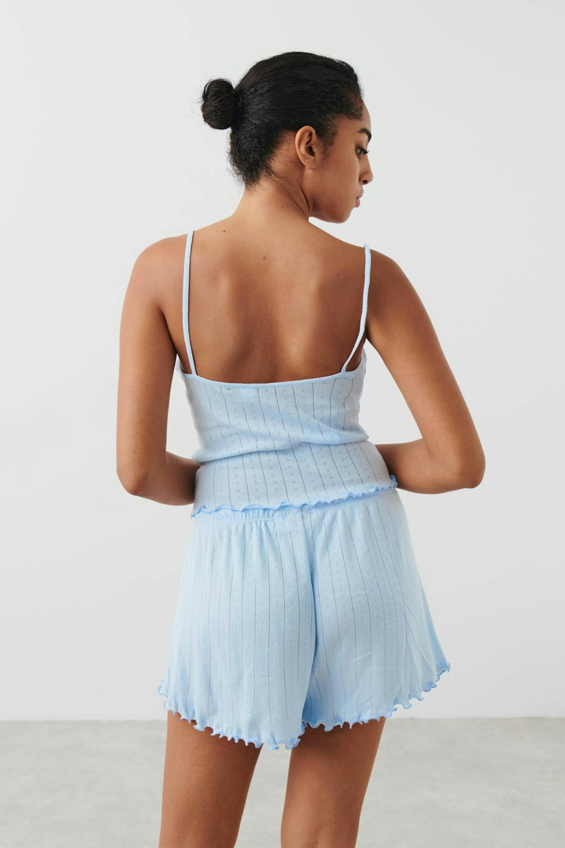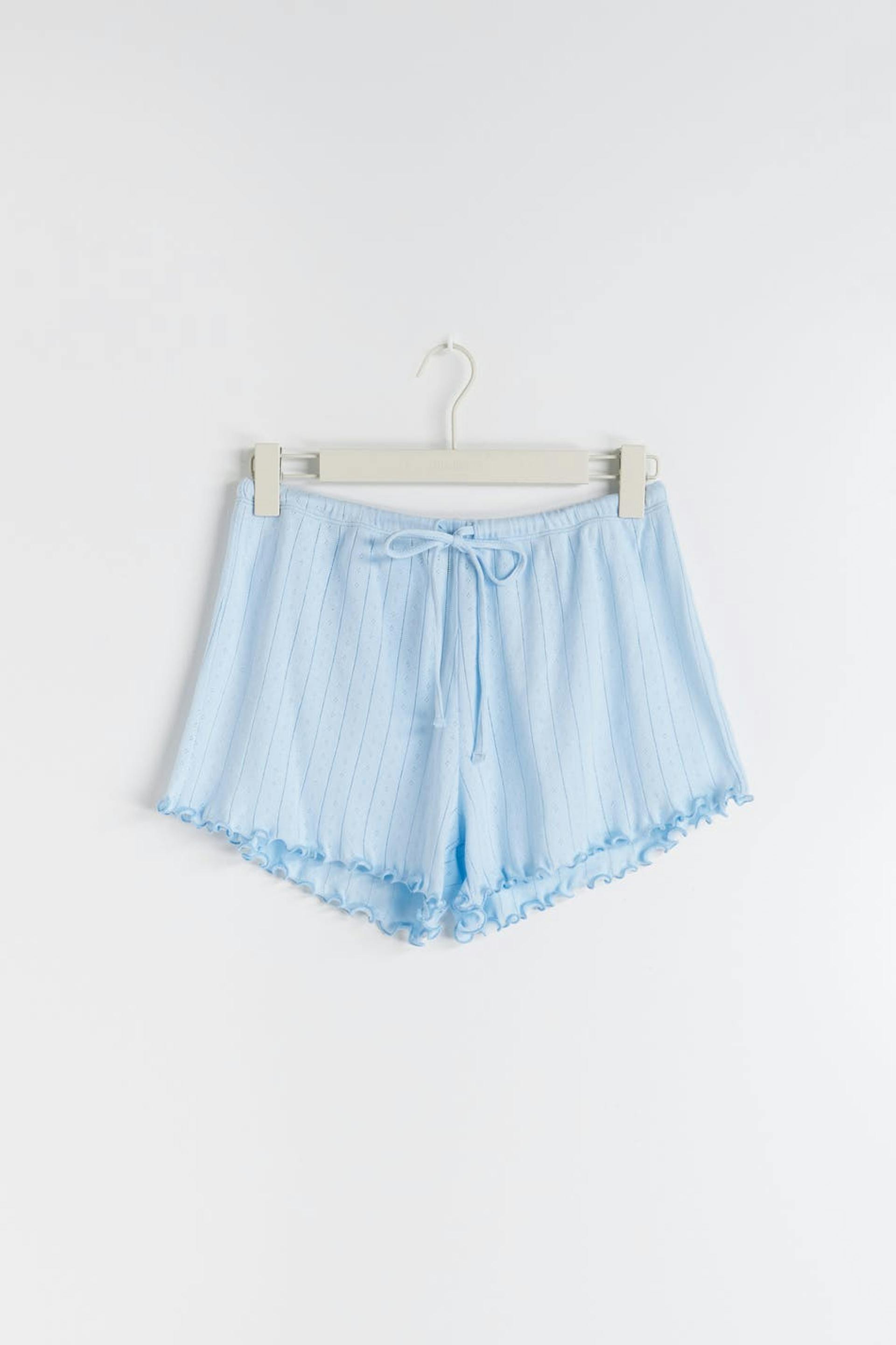 Pointellestrikkede pysjshorts i bomull med løs passform. Shortsen er blå og har gummistrikk ved midjen. Den har knyting på forsiden og overlocked hem.