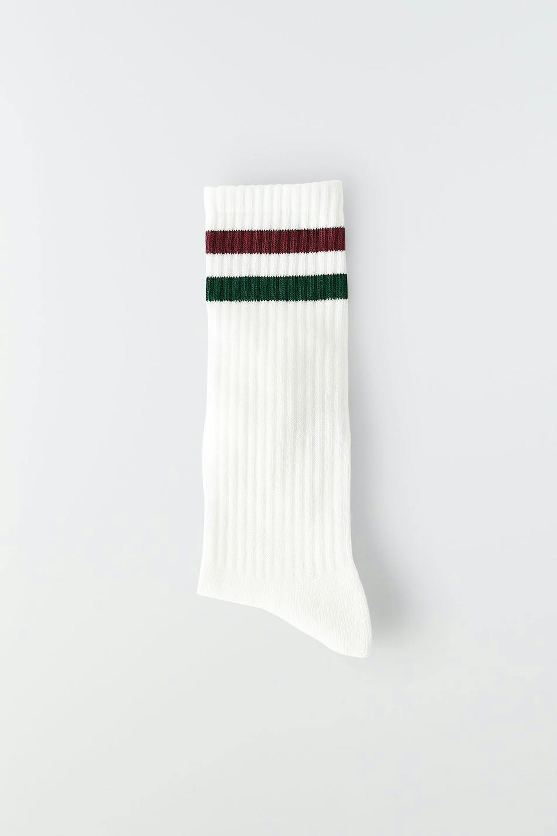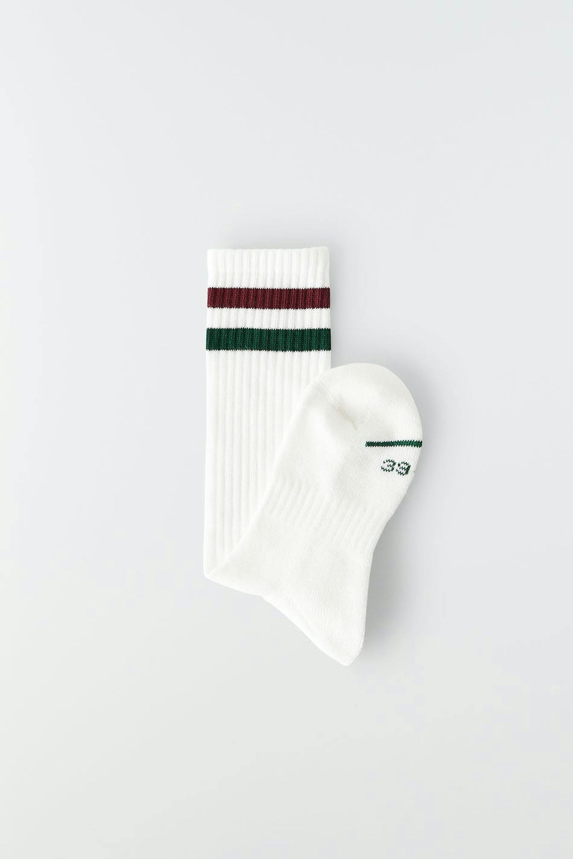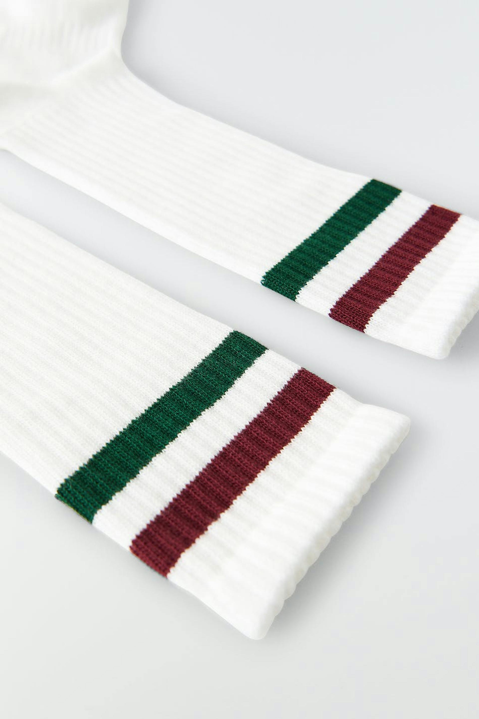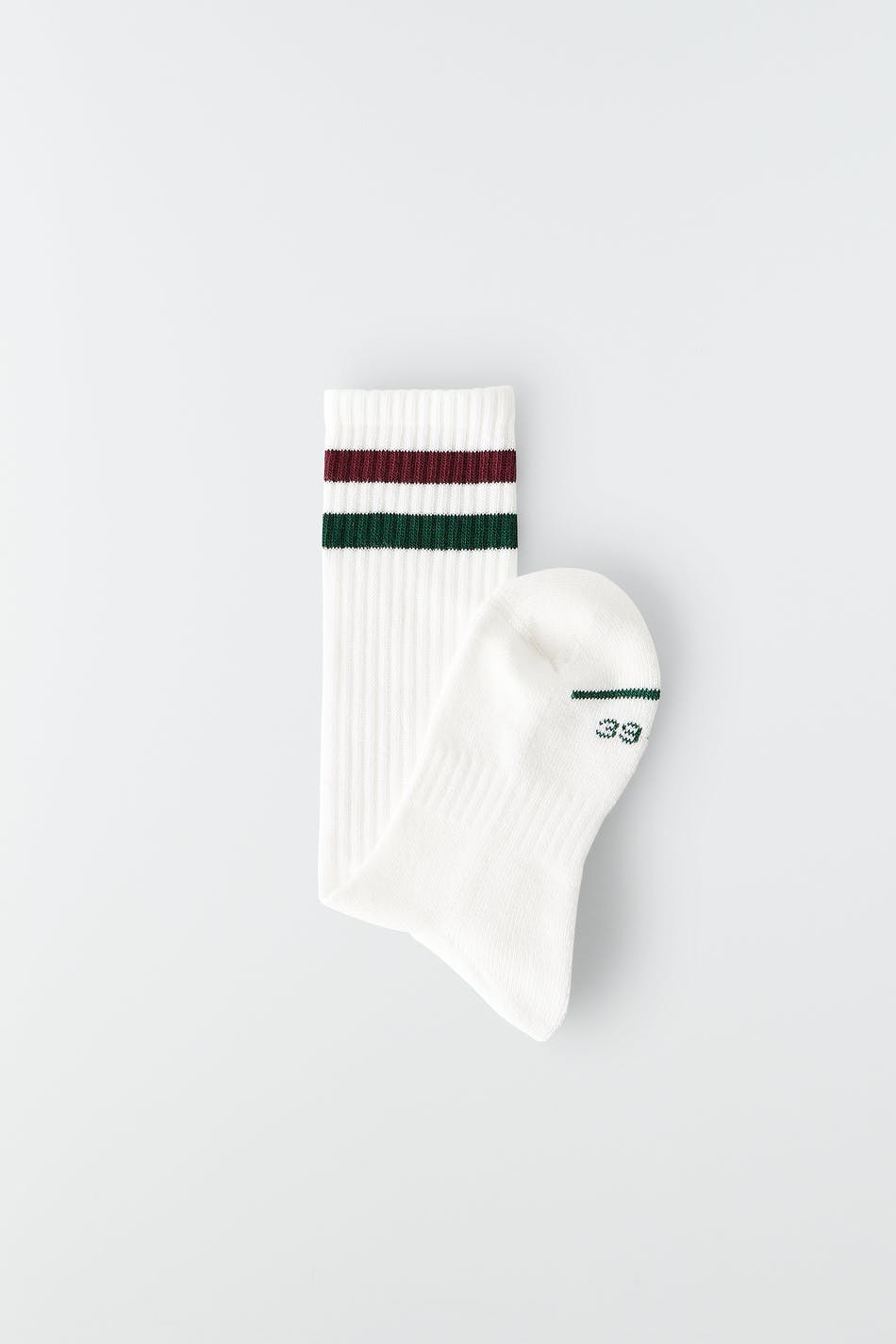 Sporty sokker med høyt, ribbestrikket skaft. Sokkene er hvite og har striper på toppen.