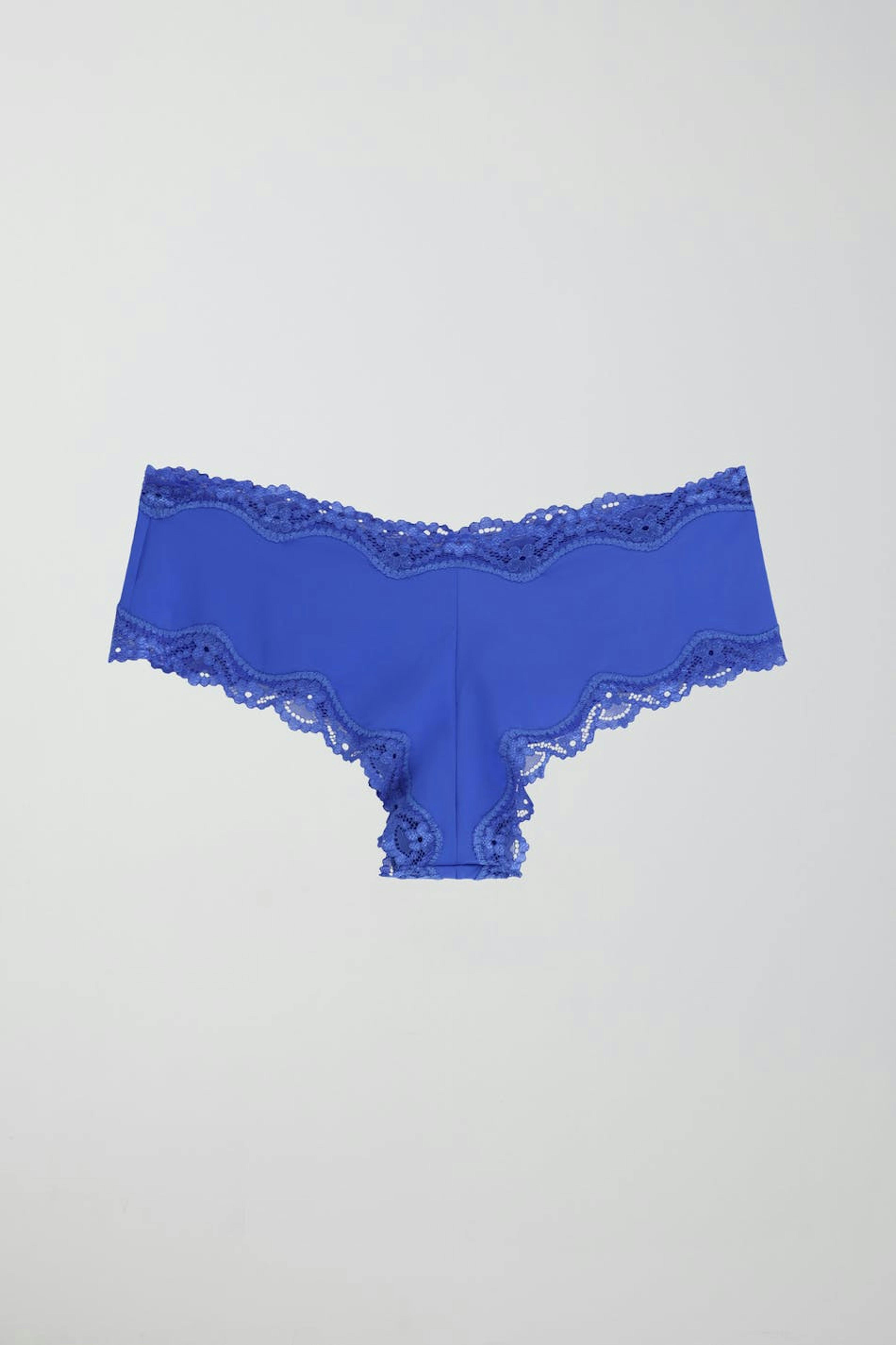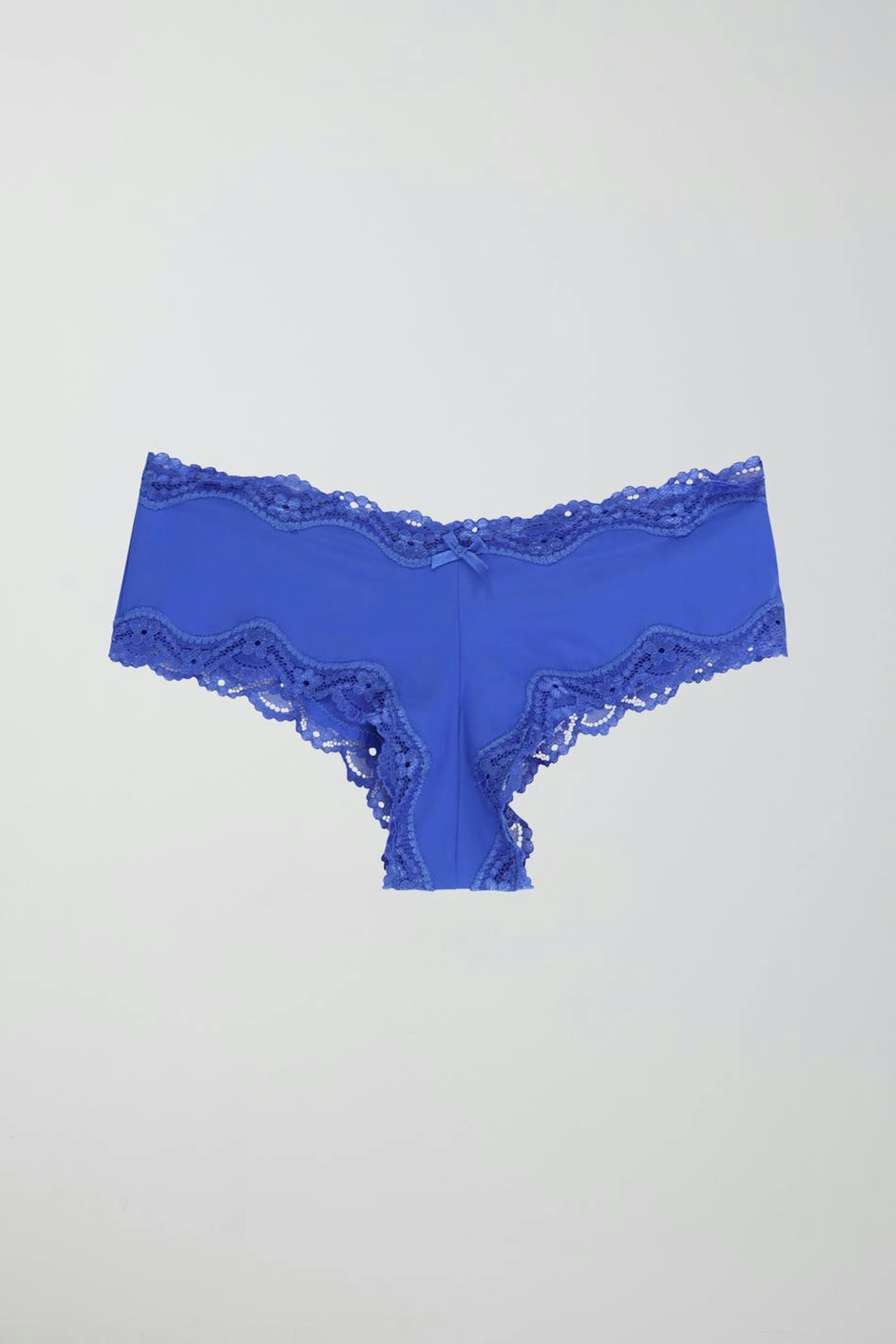 Myk brasiliansk truse i mikrofiber med blondekanter. Den brasilianske trusen er blå og har ei liten sløyfe foran.