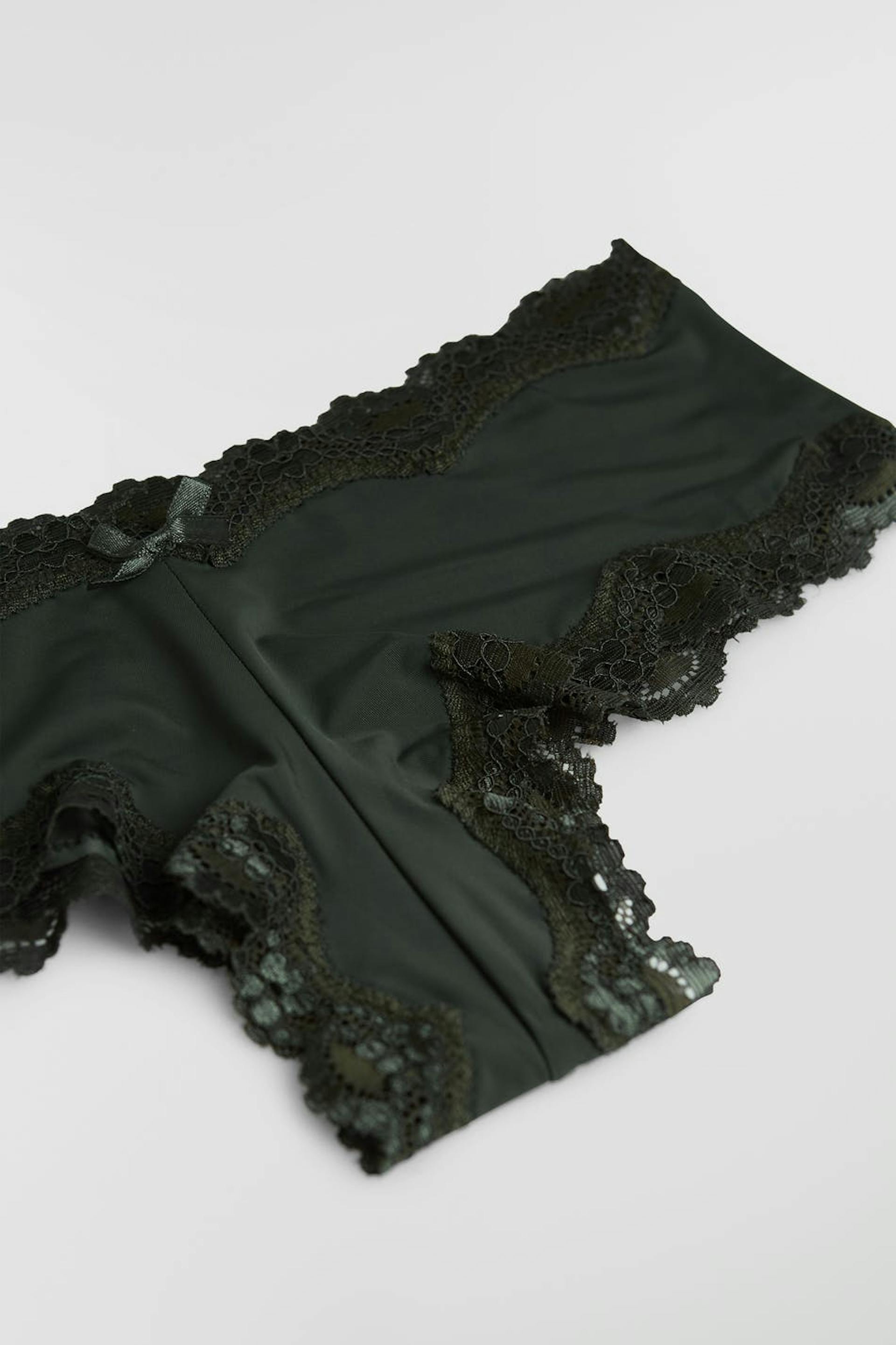 Truse med en tilpasset passform. Trusen er grønn og har kanter i blonde. Den er laget av mikrofiber og har en lav midje.