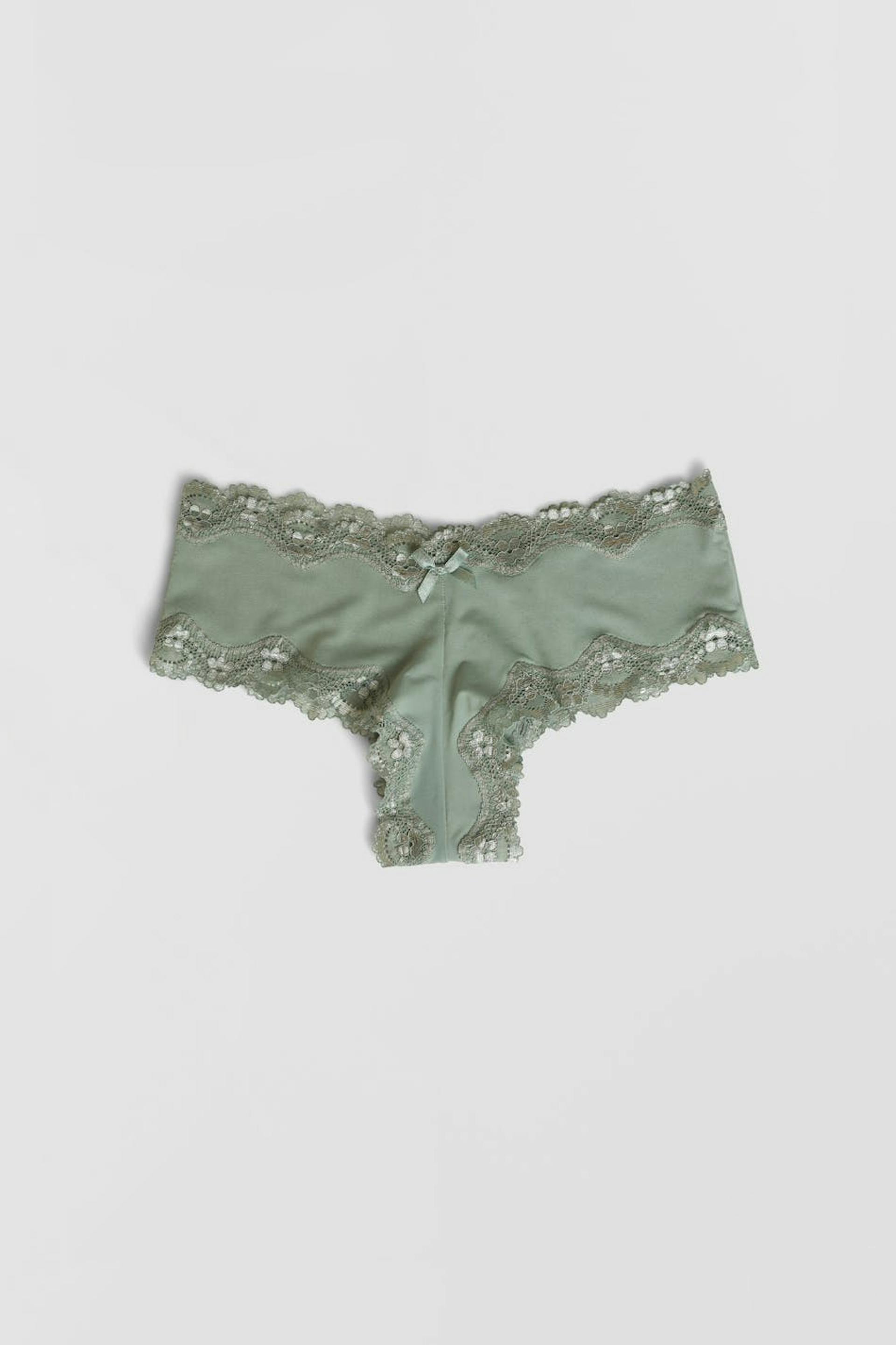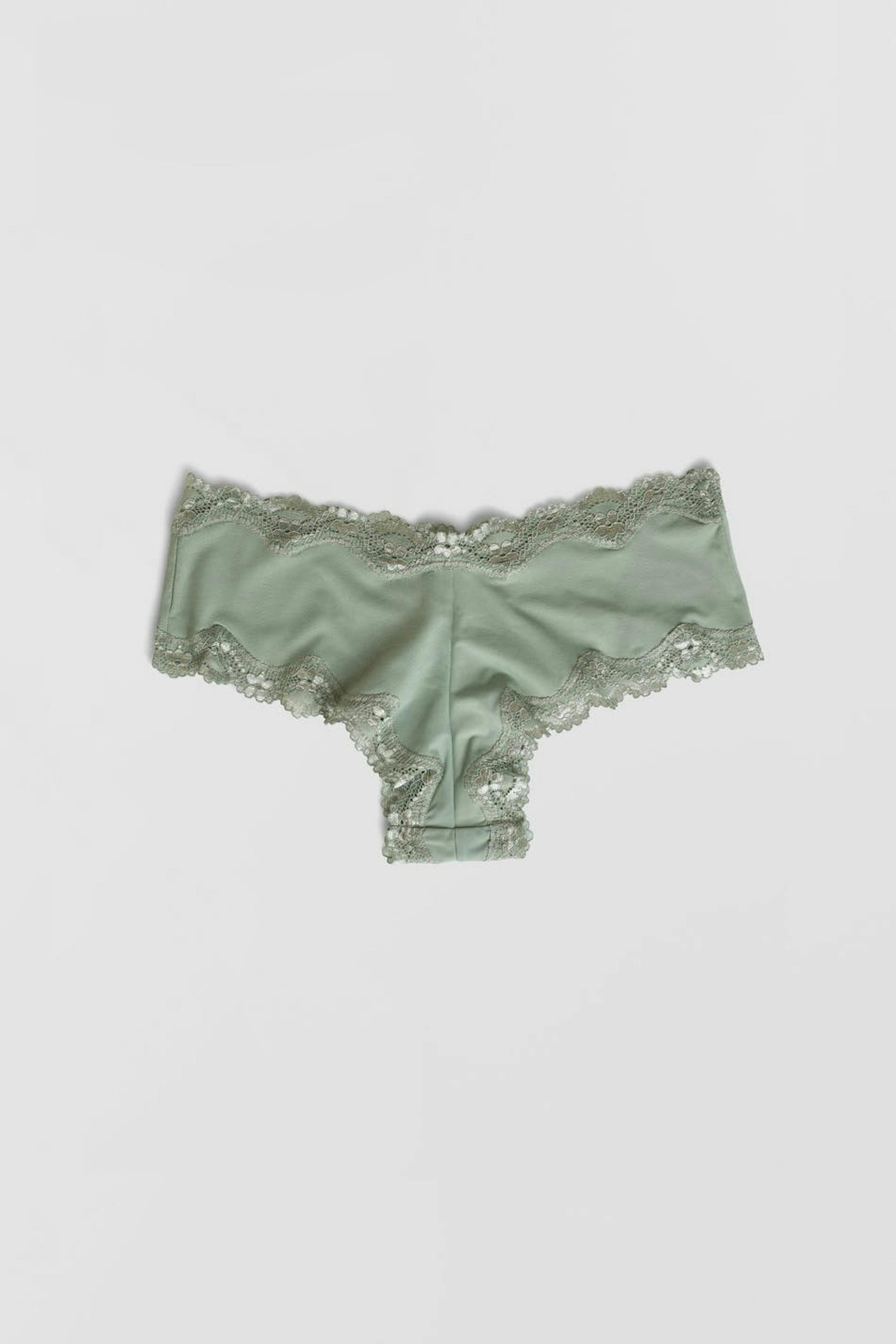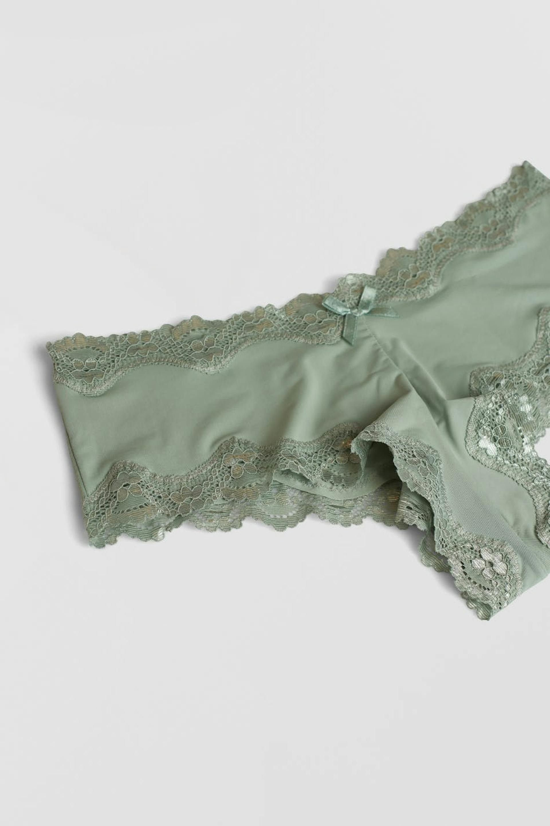 Truse med en tilpasset passform. Trusen er grønn og har kanter i blonde. Den er laget av mikrofiber og har en lav midje.