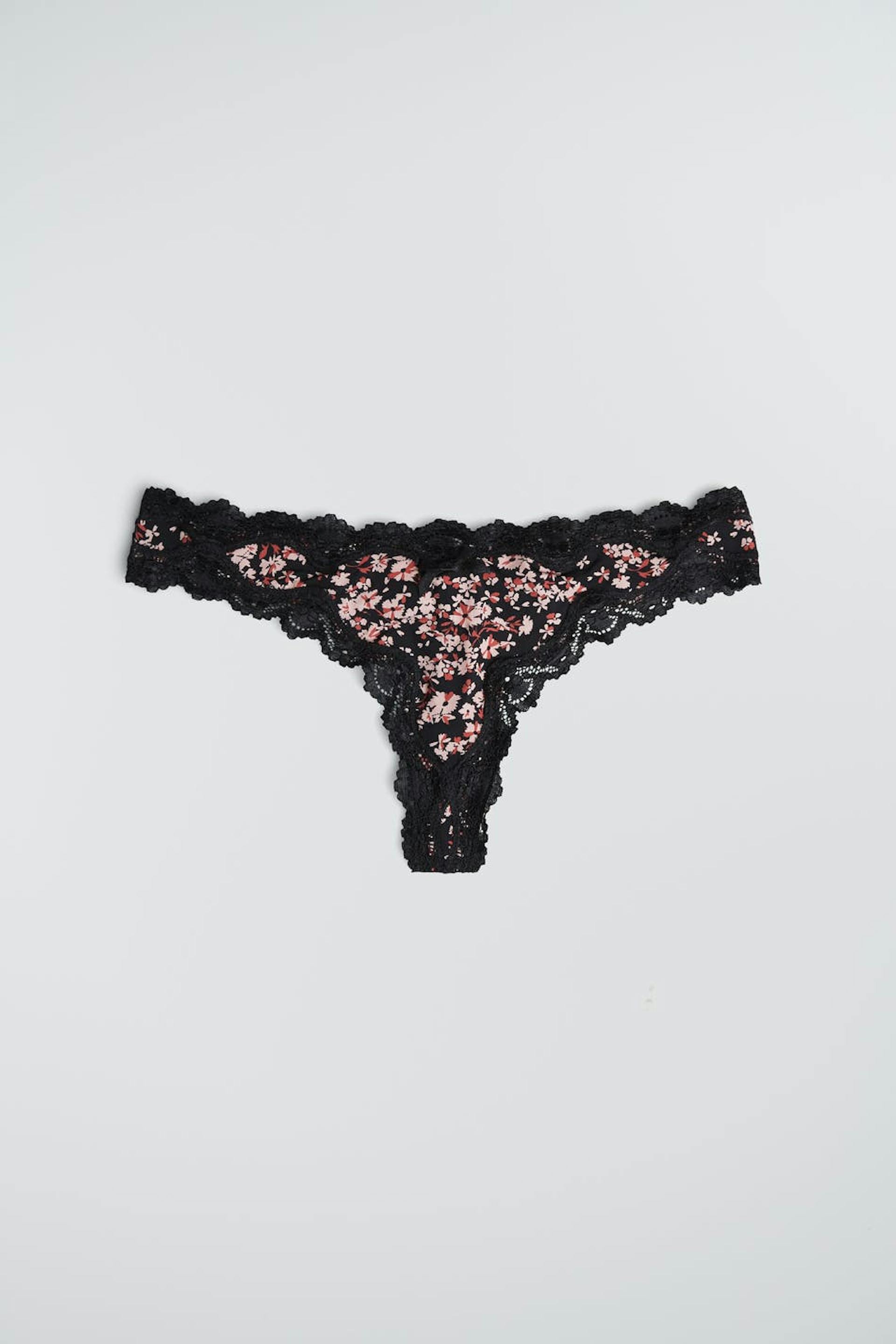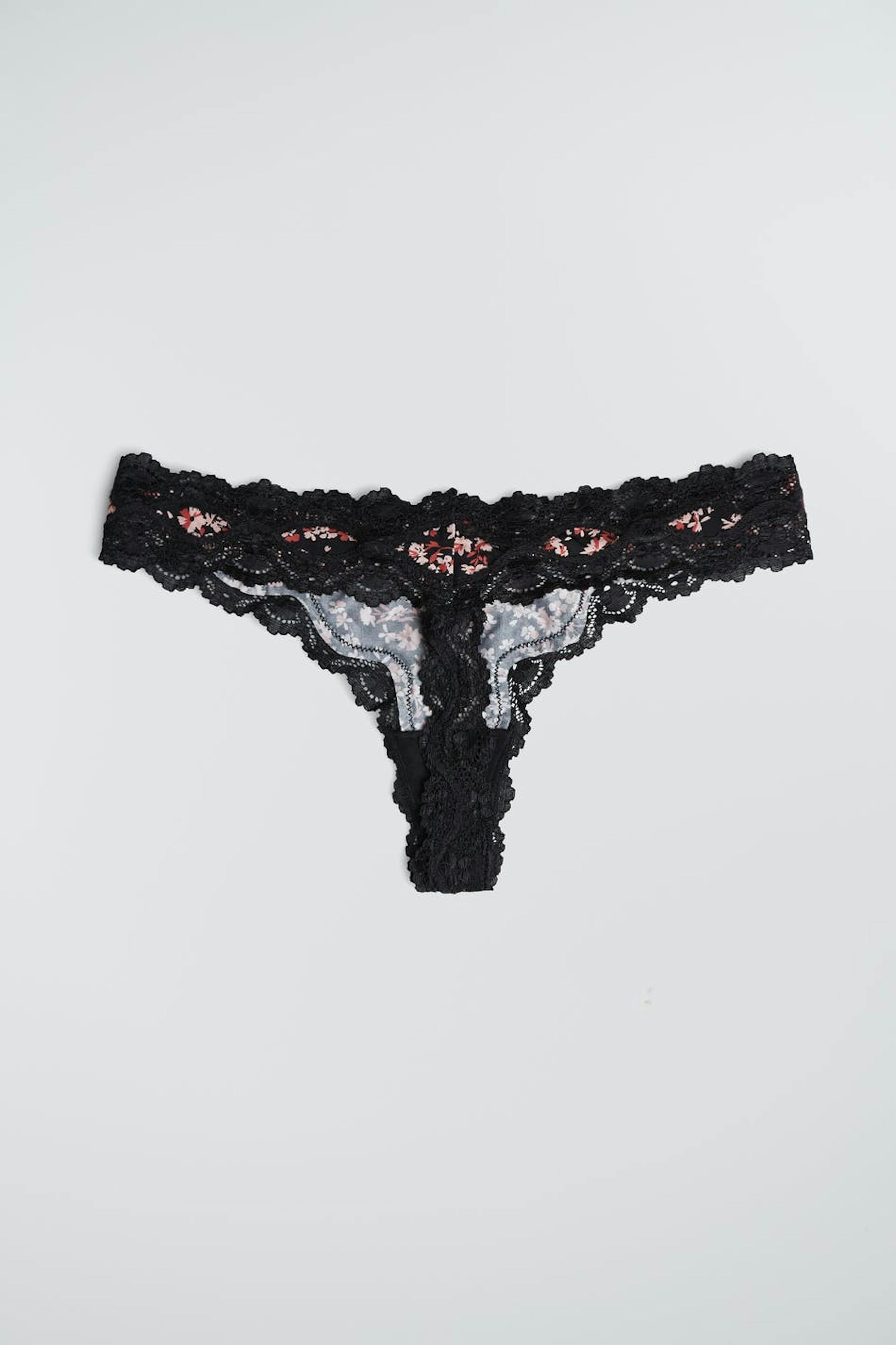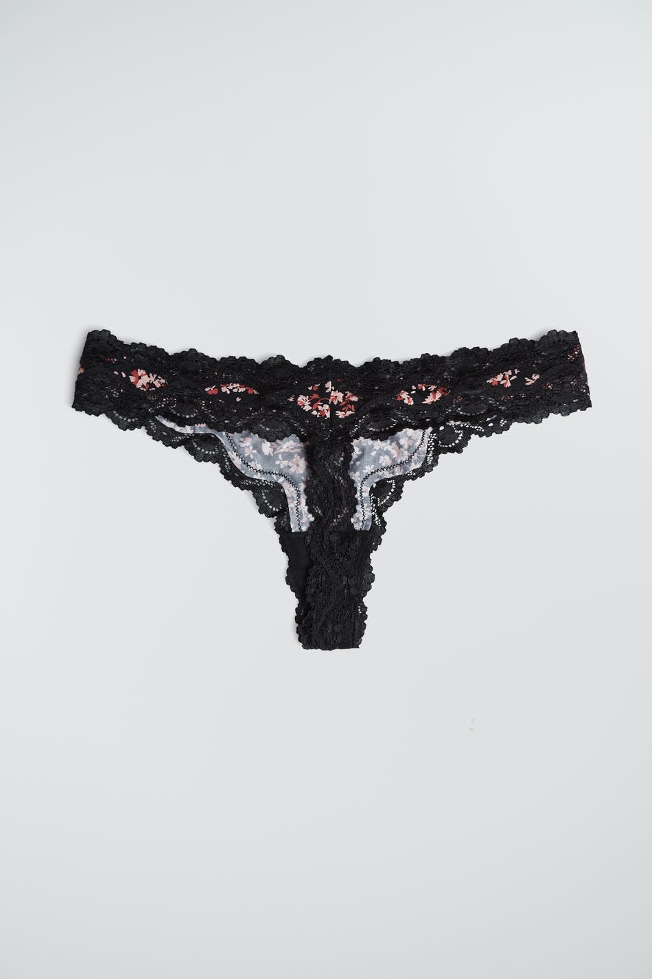 Truser med en g-streng design. Trusene er svarte og har rosa blomster. De er laget av mikrofiber og har kanter i blonde.