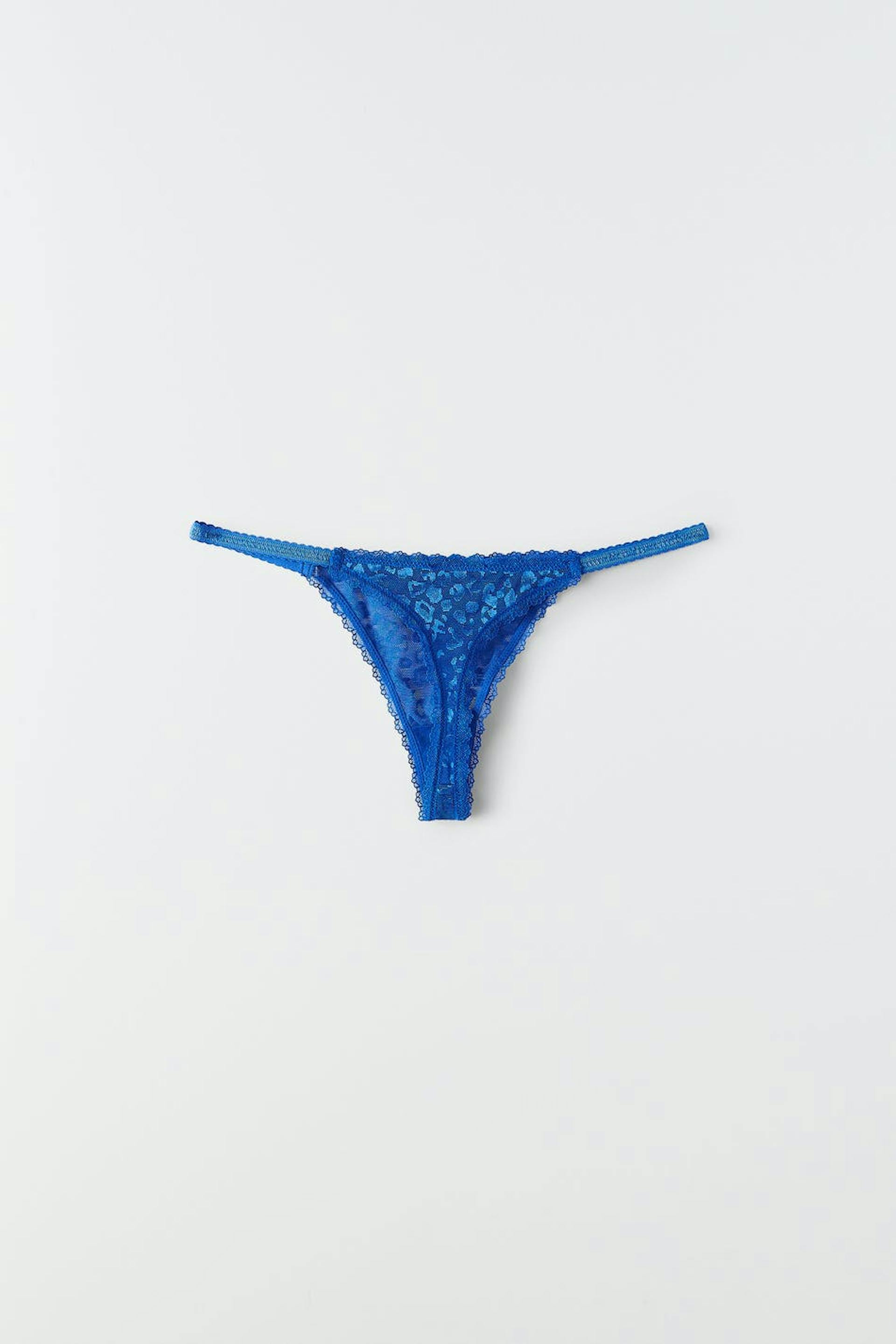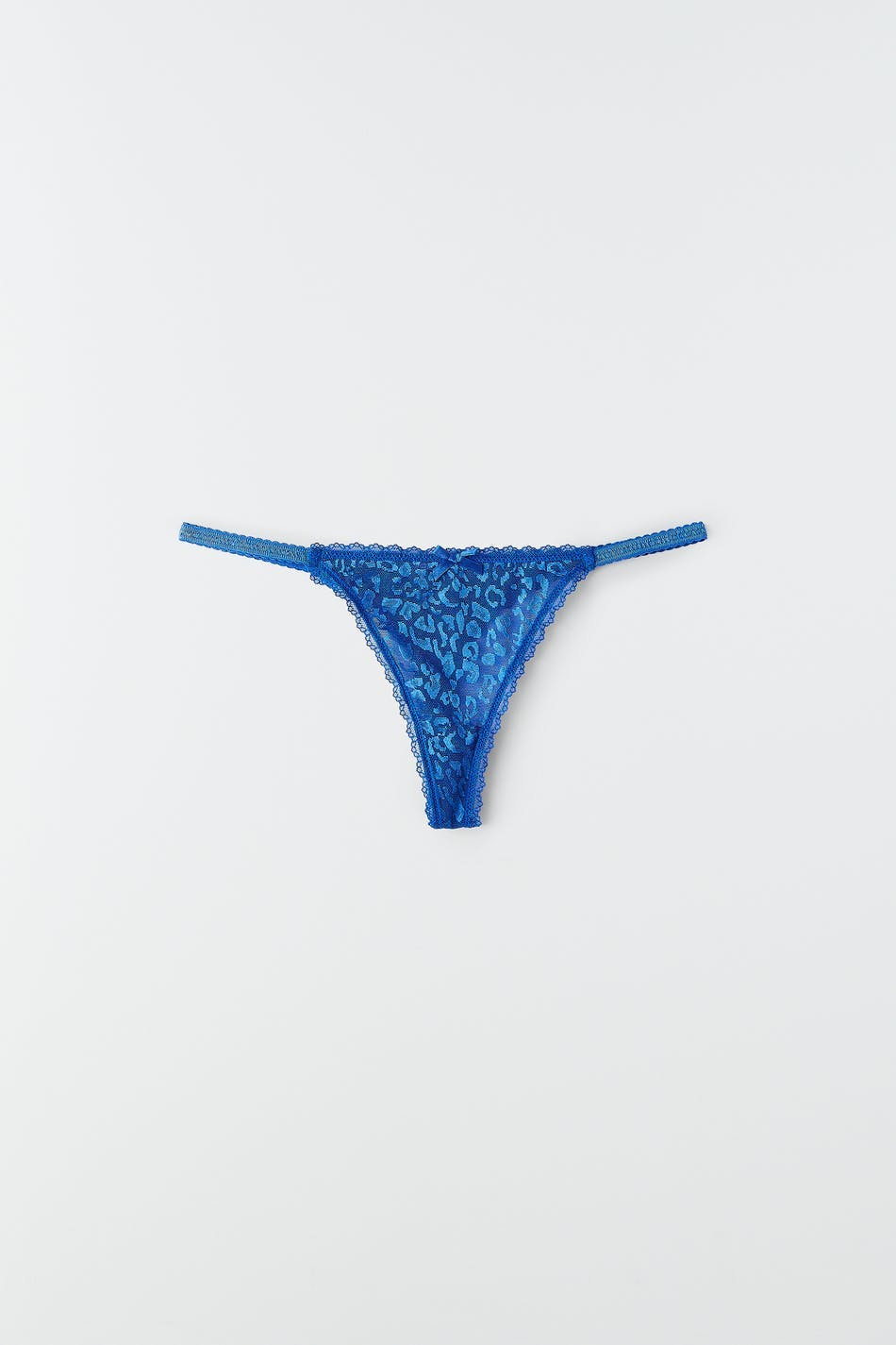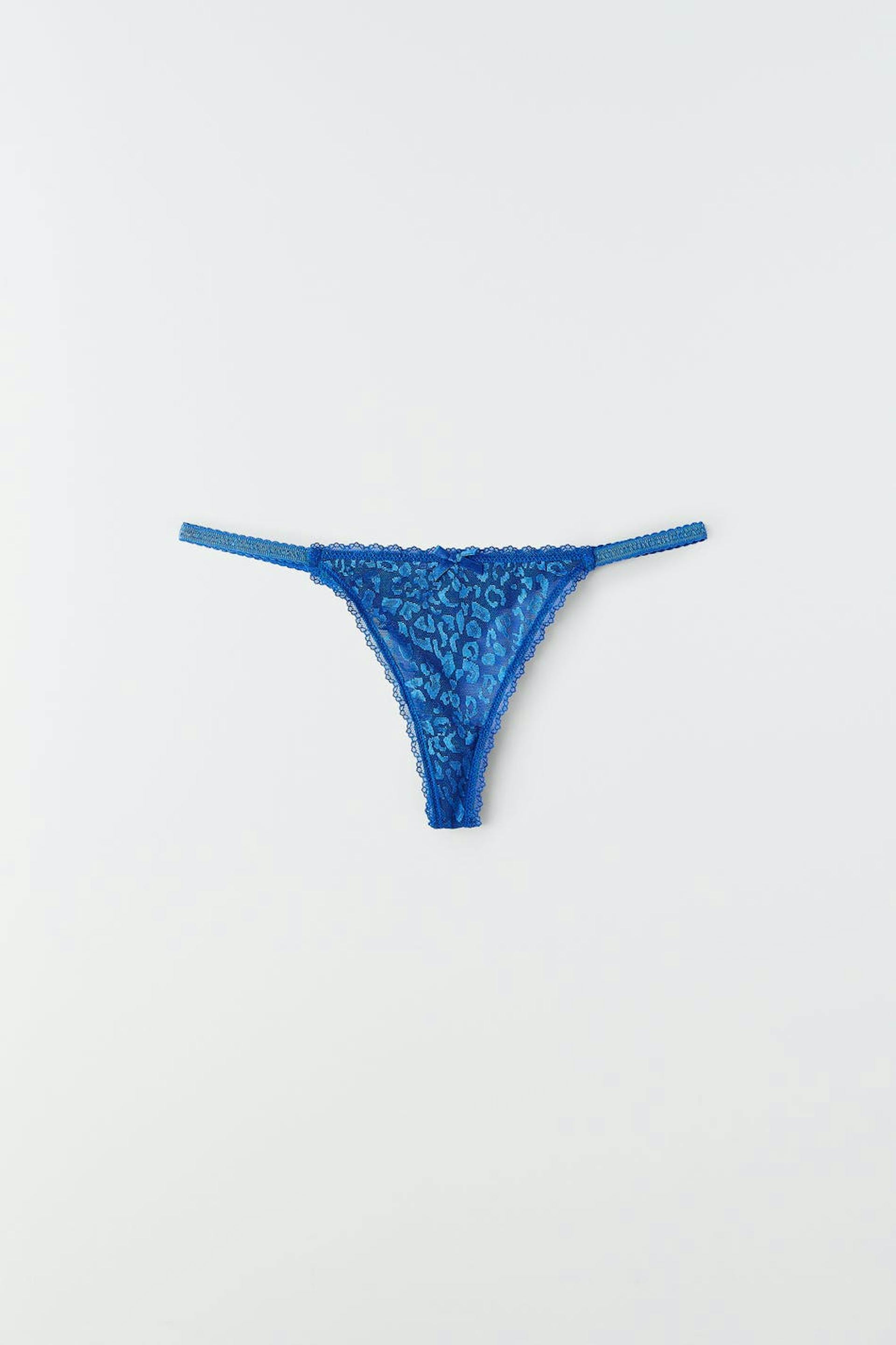 Stringtruser med blondekanter. Stringtrusene er blå og har et fôret skritt. De har ei sløyfe foran og smale elastiske stropper i sidene.