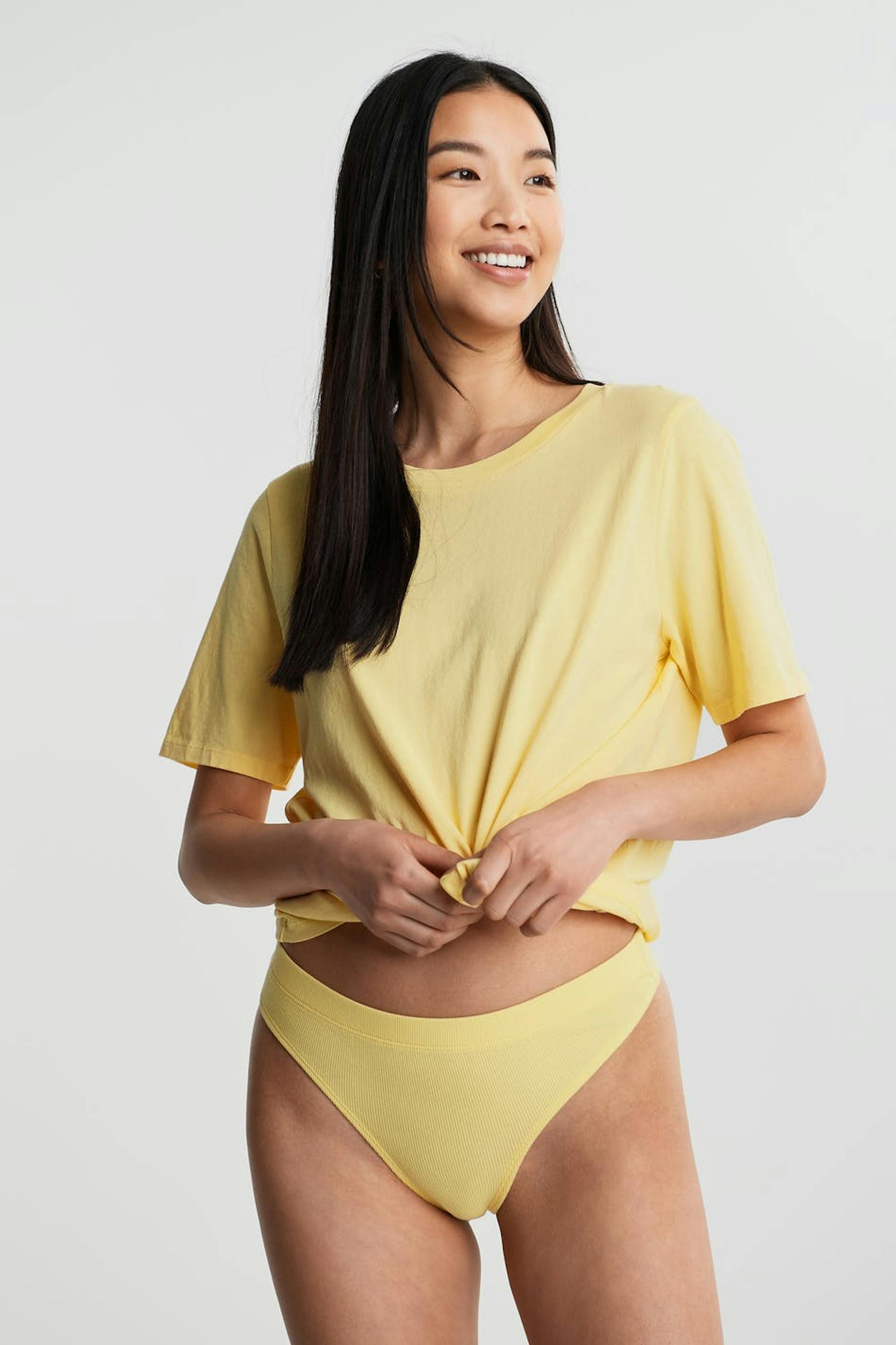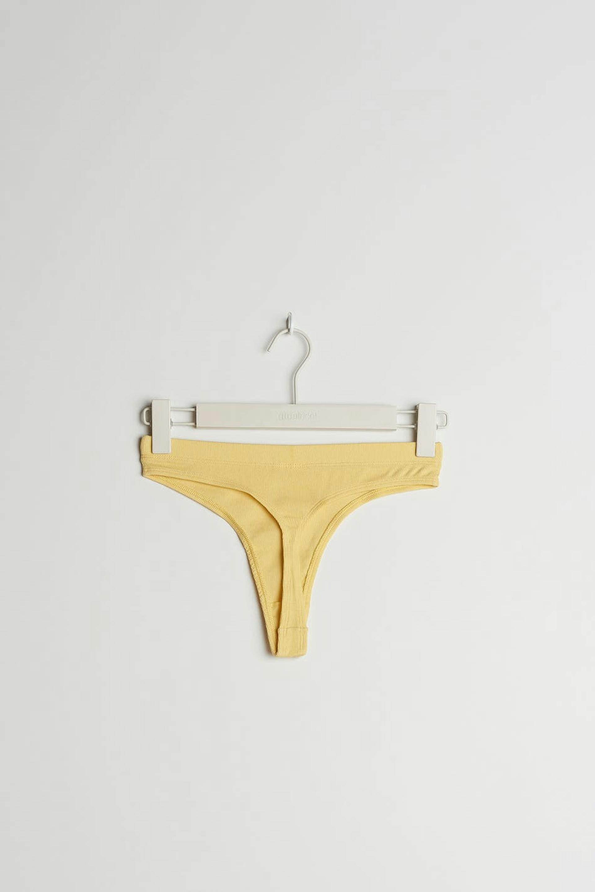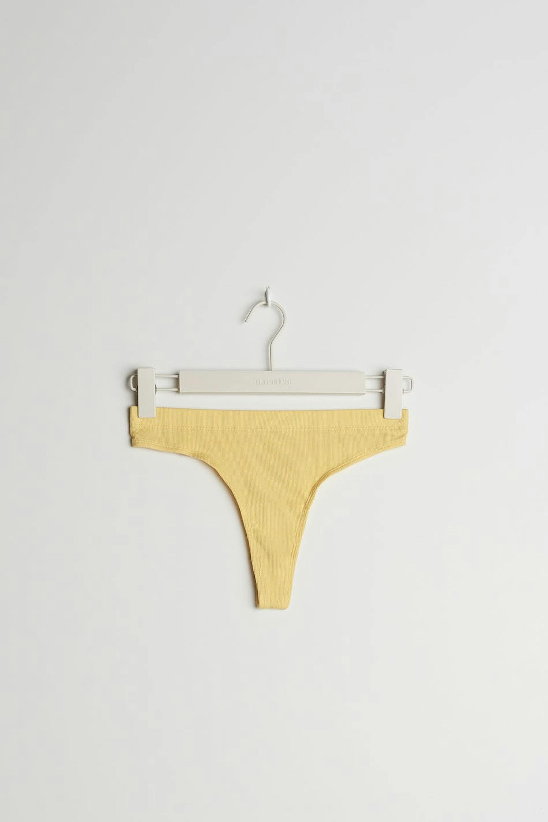 Myke stringtruser. Stringtrusene er gule og ribbet.