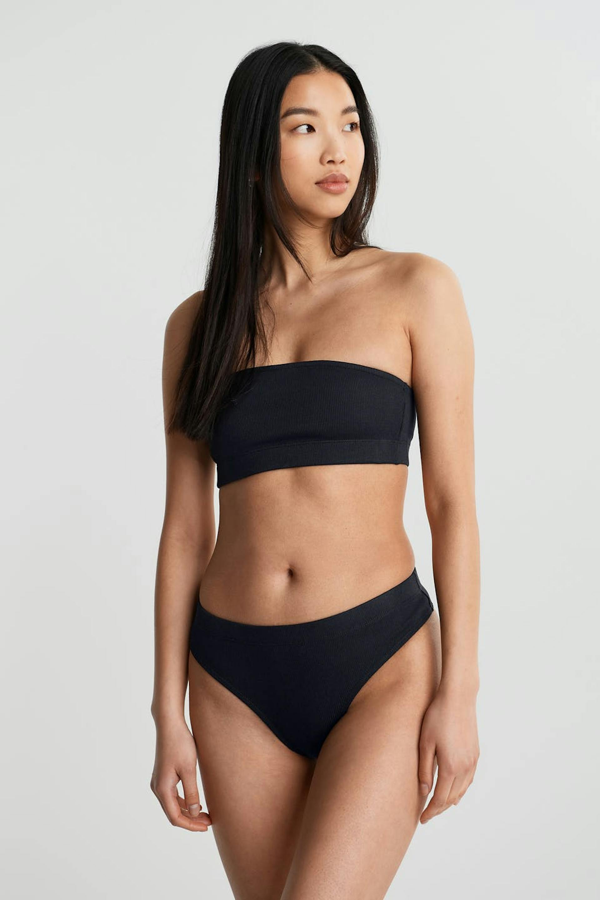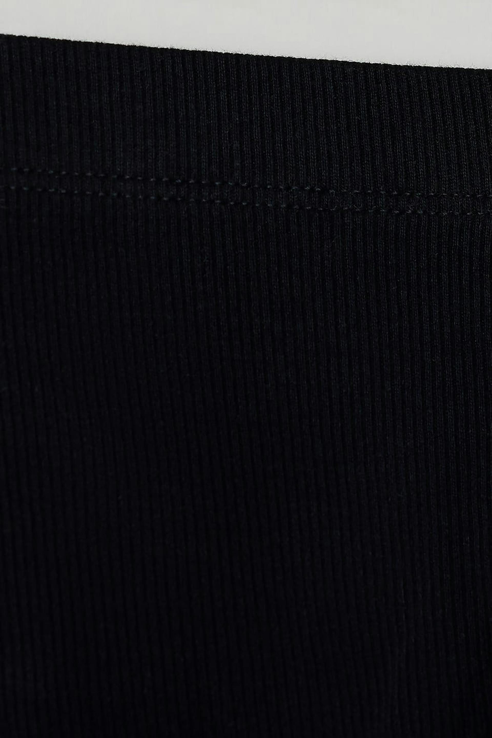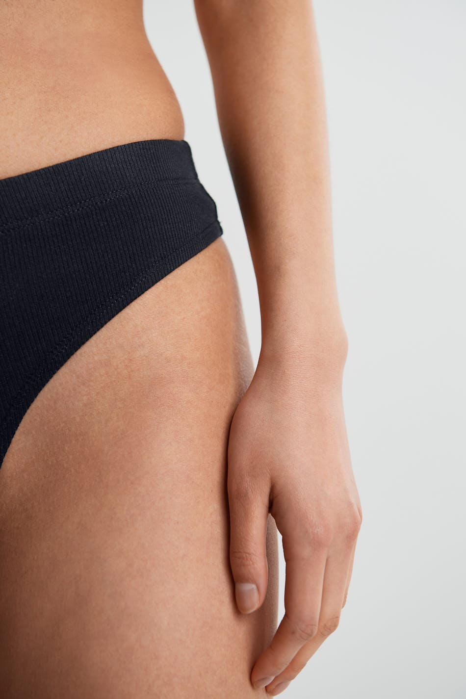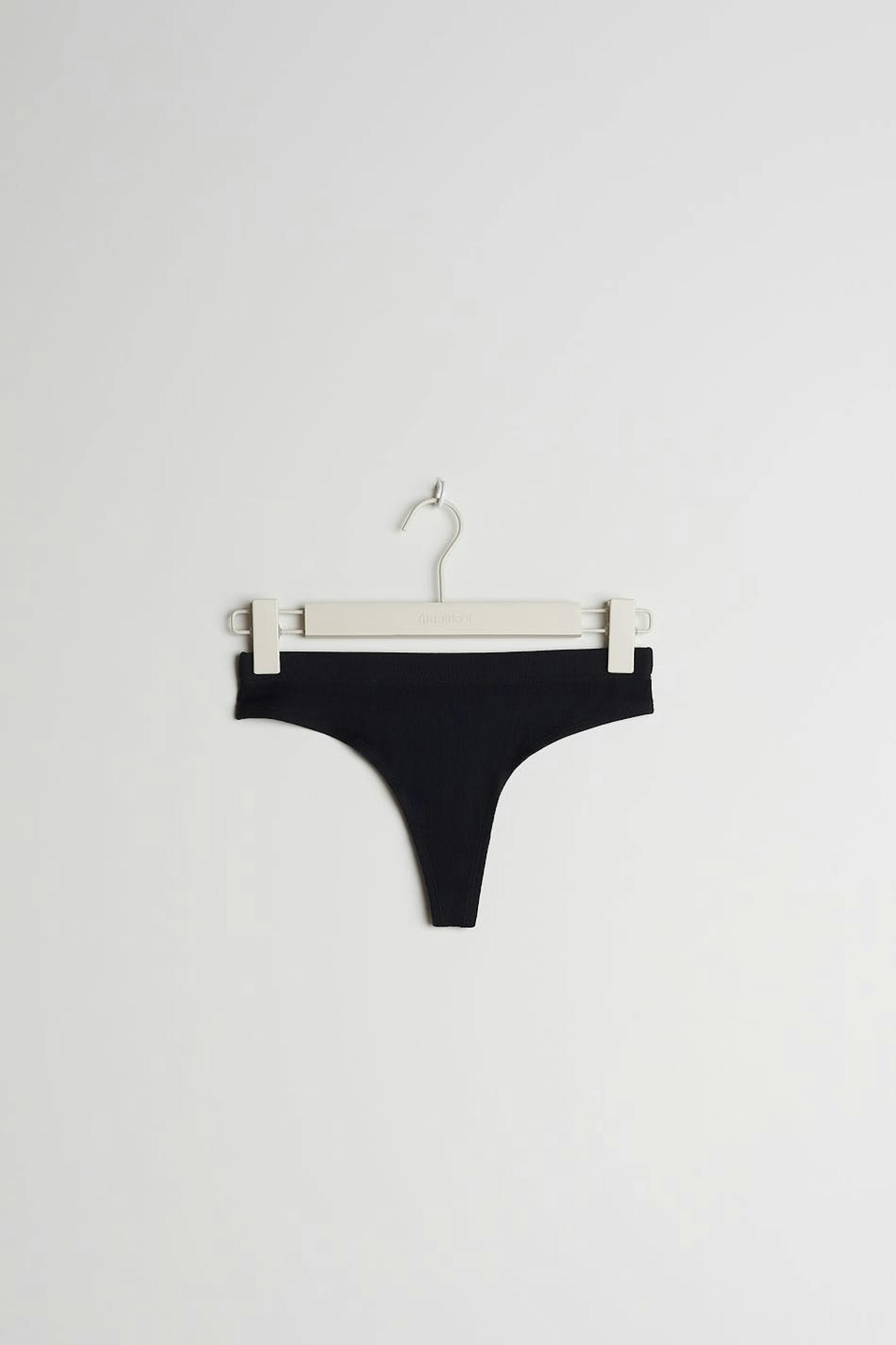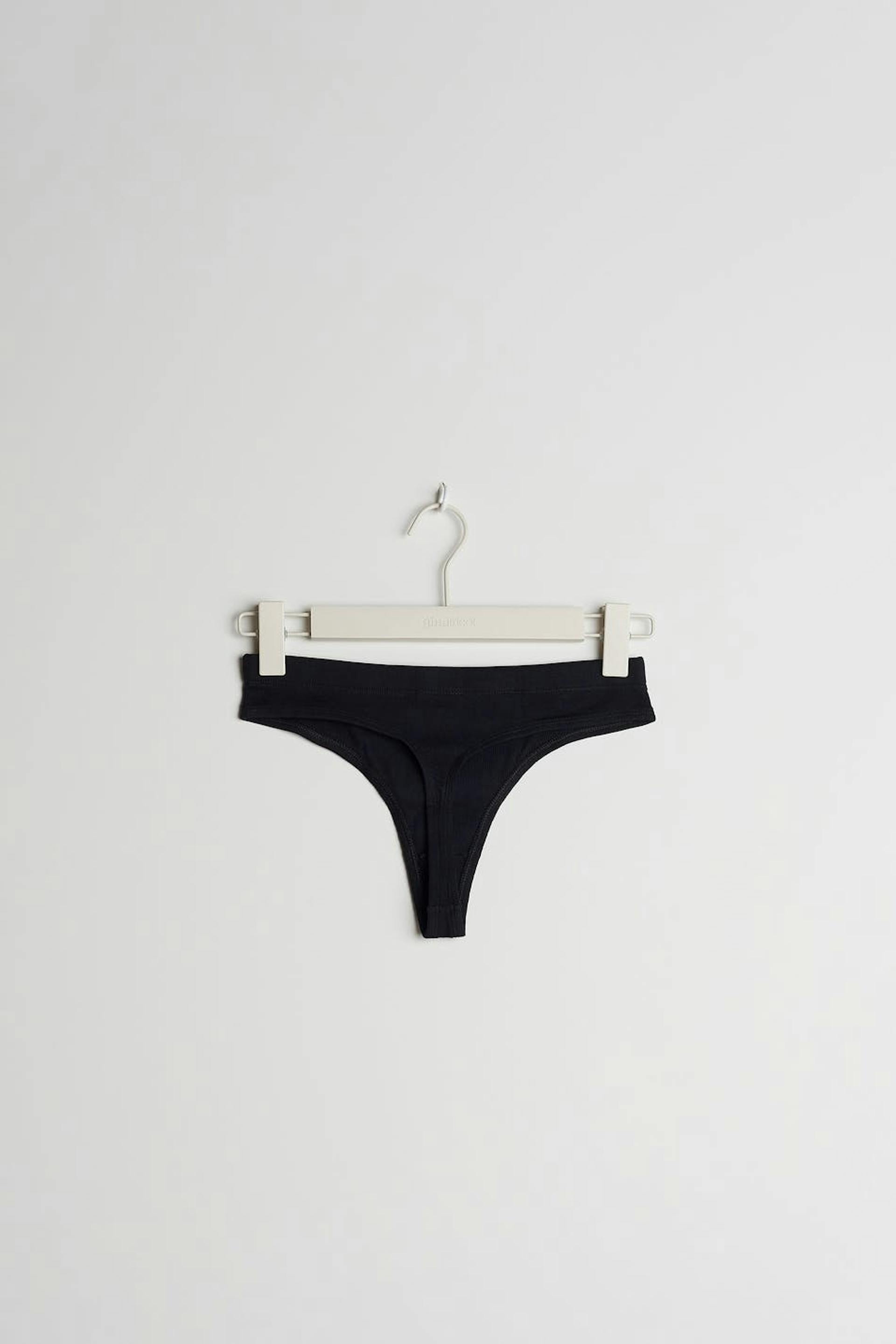 Myke stringtruser. Stringtrusene er svarte og ribbet.